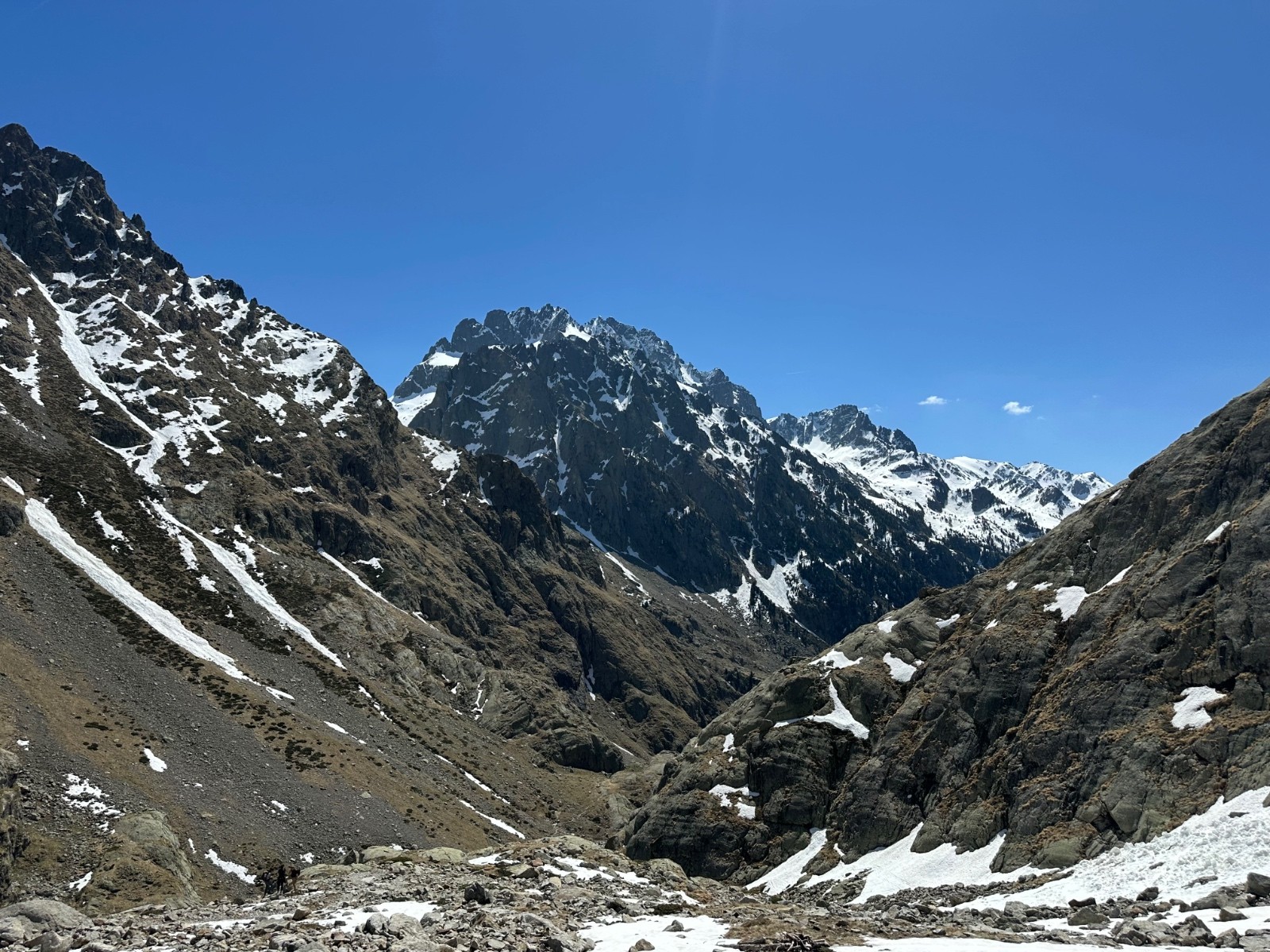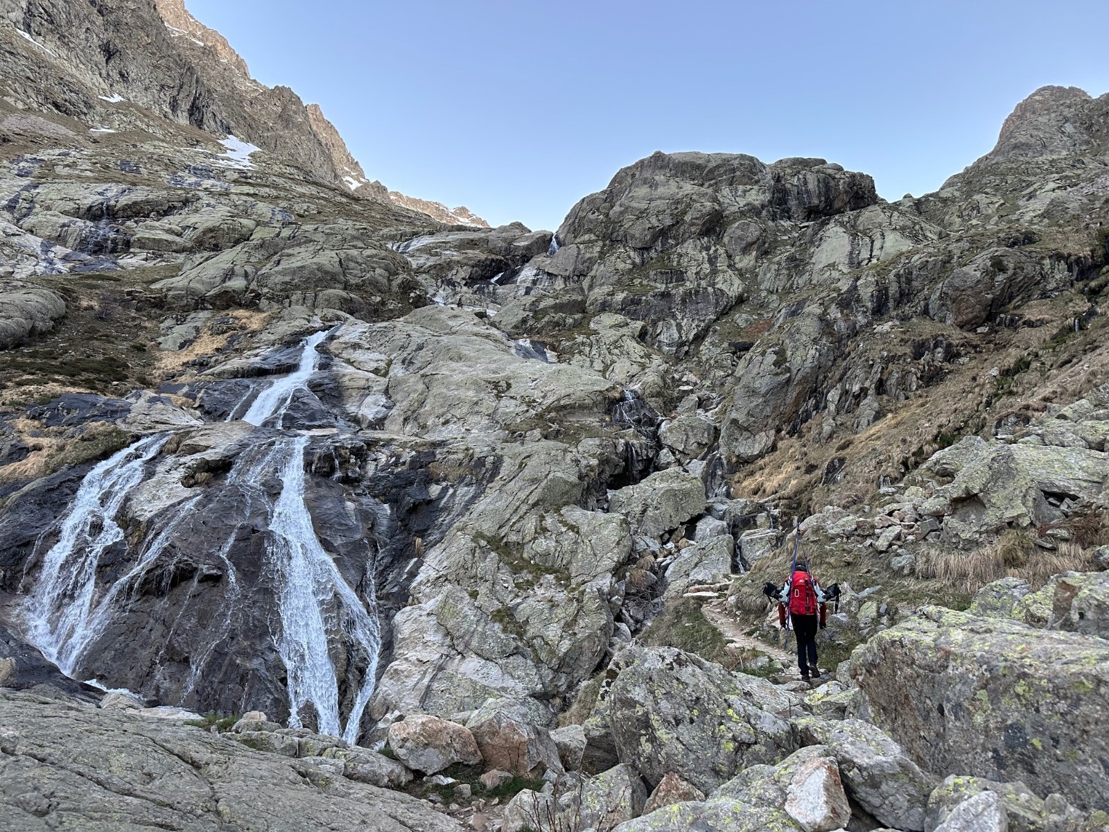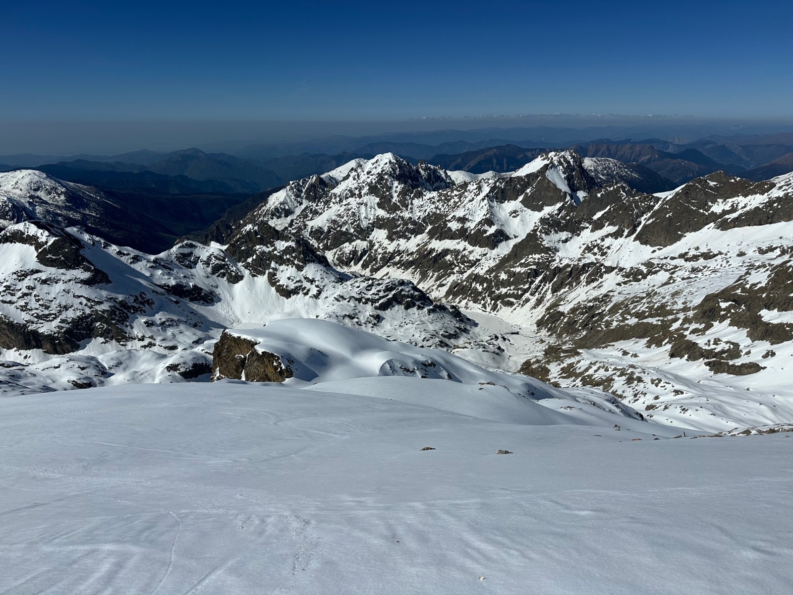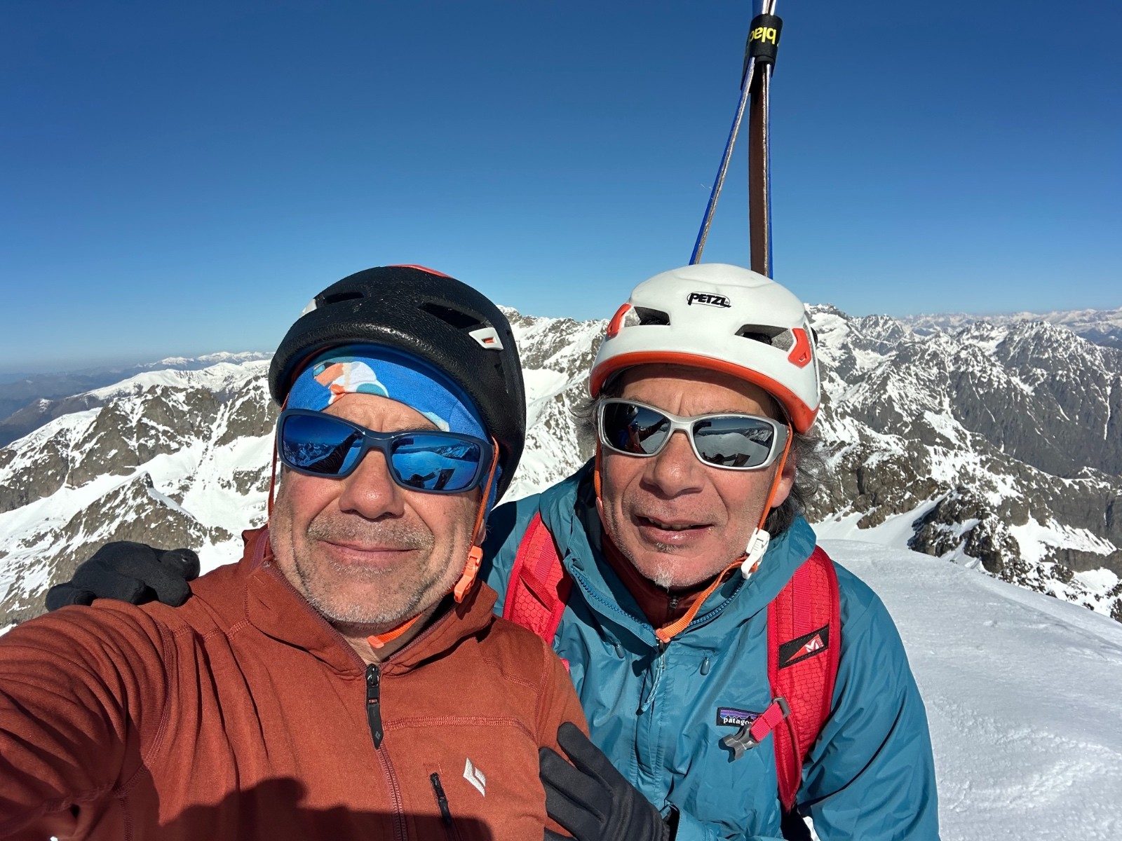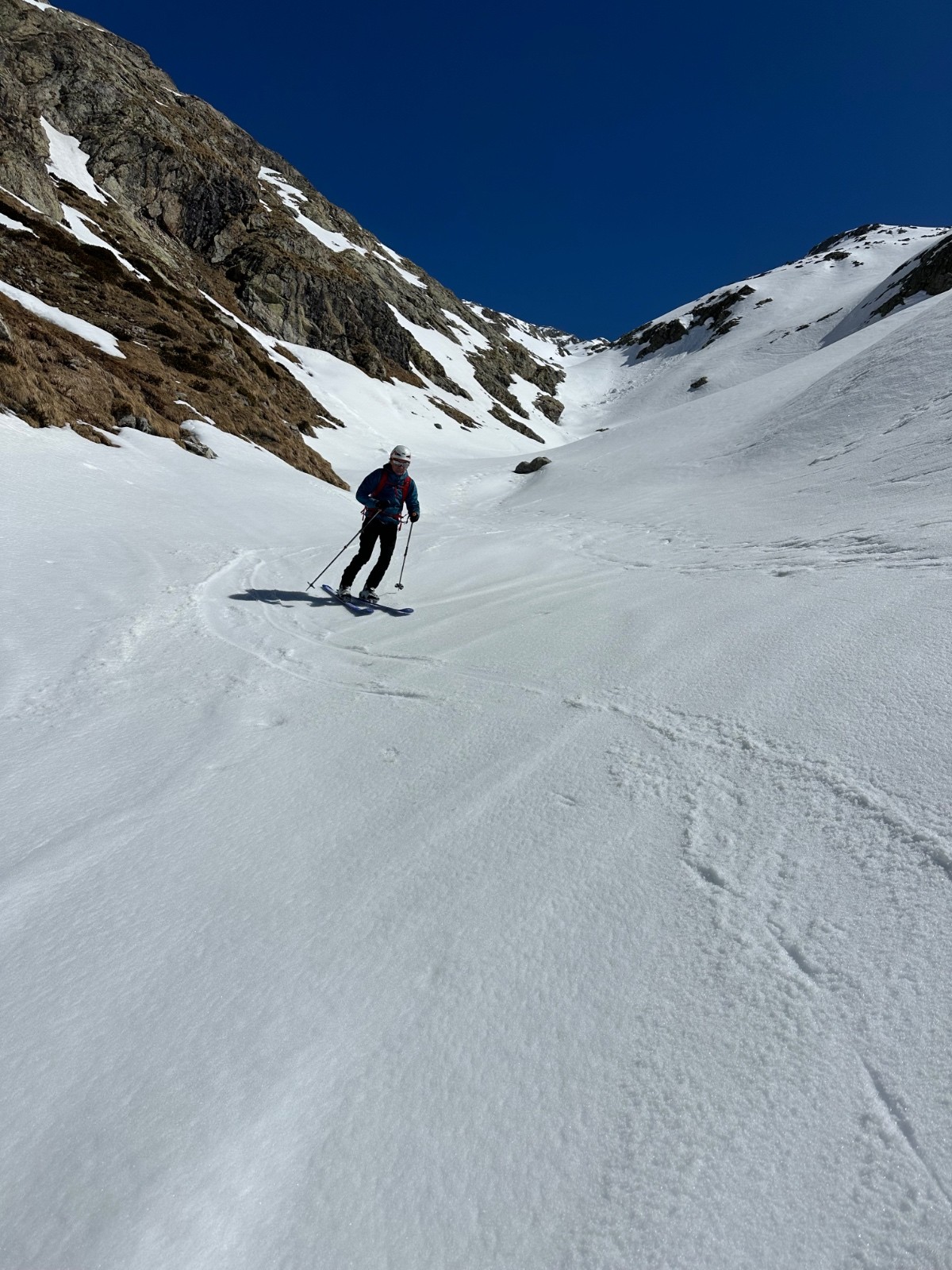 Il y en a pas mal qui ont trouvé des excuses pour ne pas venir avec Philippe et moi. Lever très matinal, portage d’une bonne heure à l’aller et au retour mais du bonheur quand même à parcourir cet itinéraire classique en Gordolasque. C’était d’ailleurs le projet principal : celui de faire une dernière sortie dans cette magnifique vallée cette saison. Les marmottes sont de sorties et pas mal de bouquetins et chamois également, par contre très peu de skieurs. Un seul croisé au sommet, d’où on n’a vu personne sur le Gelas. Son couloir est pourtant bien plein. Itinéraire suivi : classique en louvoyant sur les pentes terminales avec les crampons au pied.