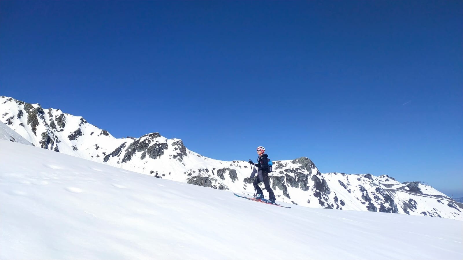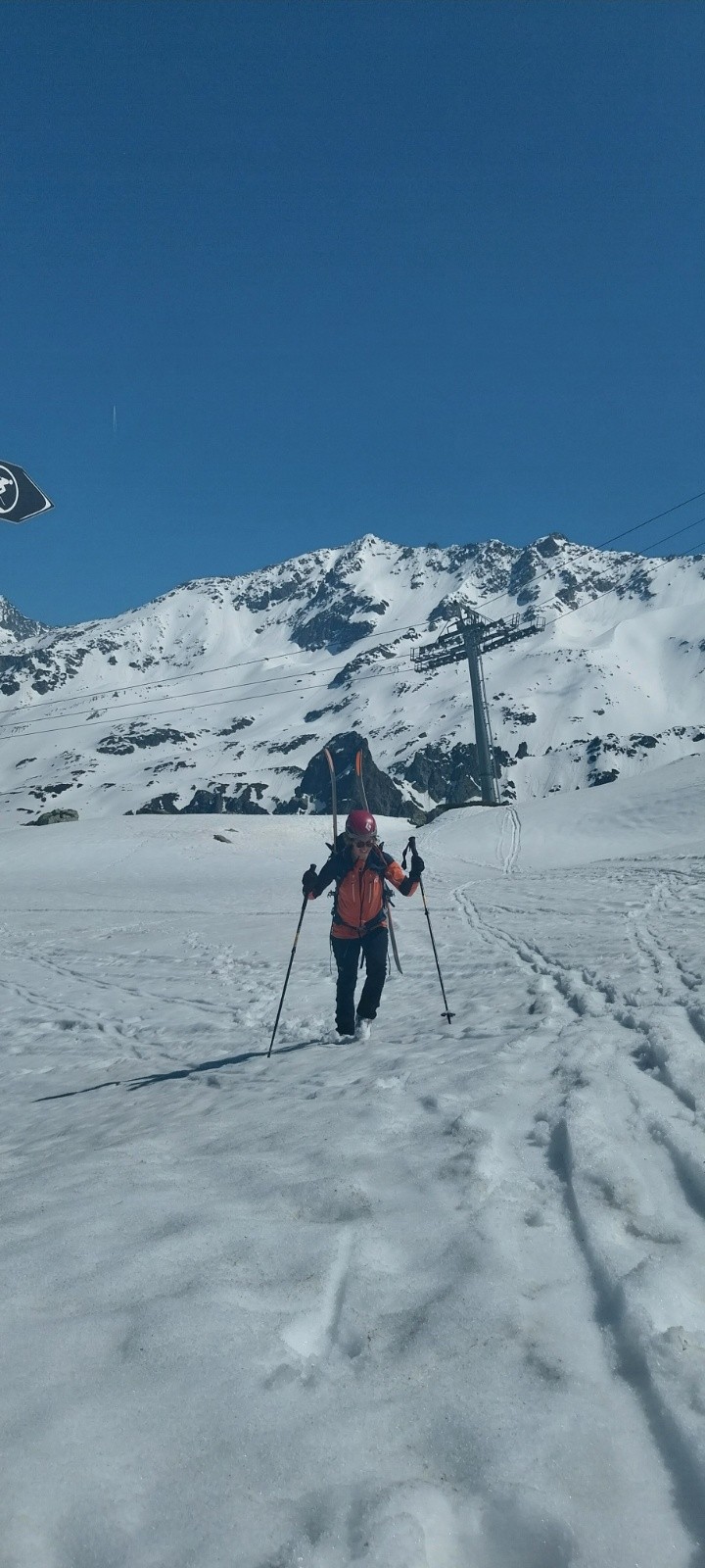Je repeaute, je mange un bout puis je pars à la poursuite de mes acolytes. Je les rattrape puis je les double, je me sentais assez bien donc je voulais débiter la montée. A partir de 2300m la neige était encore lisse et dure. Arrivée à 2600m par flemme d'enlever le sac pour prendre mes couteaux pour finir la montée je déchausse, j'attrape mes crampons à portée de main et je mets les skis sur le sac pour rejoindre le sommet. Qu'est ce que c'est génial les sacs de ski alpinisme😁. Neige bien dure sur les 100 derniers mètres, je ne m'enfonce pas, la neige porte bien. Les crampons étaient l'idéal à mon goût pour sortir le sommet avec aisance et confiance.