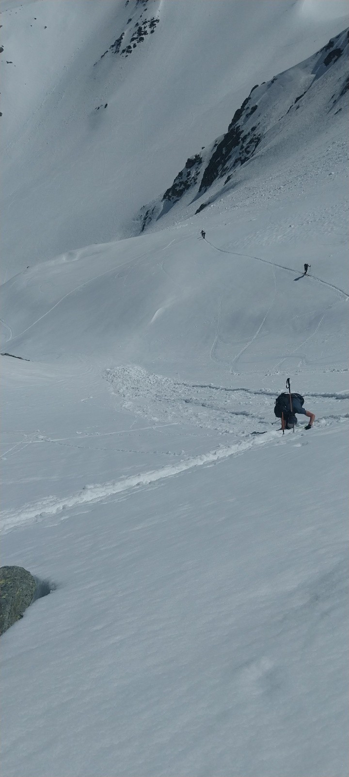 On remonte donc au col sans nom sous la Dent du Pra en versant Est, c'est bien pourri, on a fait partir un peu de neige humide sur le haut. Comme c'était pourri je ne suis pas monté à la Dent du Pra par l'arrête N, c'est mon dernier itinéraire inexploré pour rejoindre ce sommet. Ca attendra les prochaines saisons ⌛...