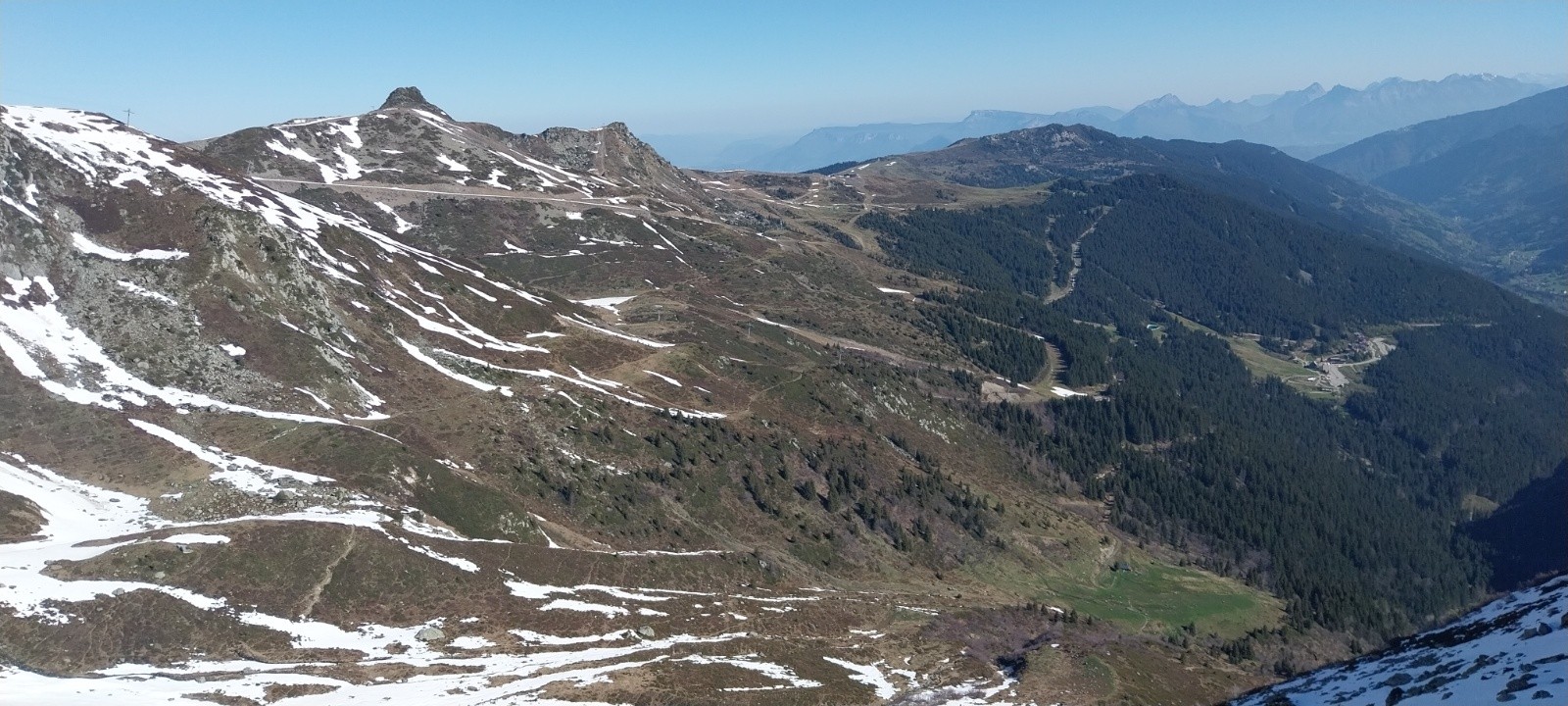 On commence par monter au Dôme de l'Oursière par la Mataru, on chausse encore du bas mais ça ne va pas durer encore très longtemps. Il y a quelques petits trous d'herbe à passer avant le plat vers 1750m. Ensuite c'est enneigement continu toute la sortie. Tout le monde monte au Dôme de l'Oursière puis on descend en SE pour rejoindre les vallons du Pra. La descente est très limite, d'ici quelques jours ça va devenir très compliqué sans déchausser.