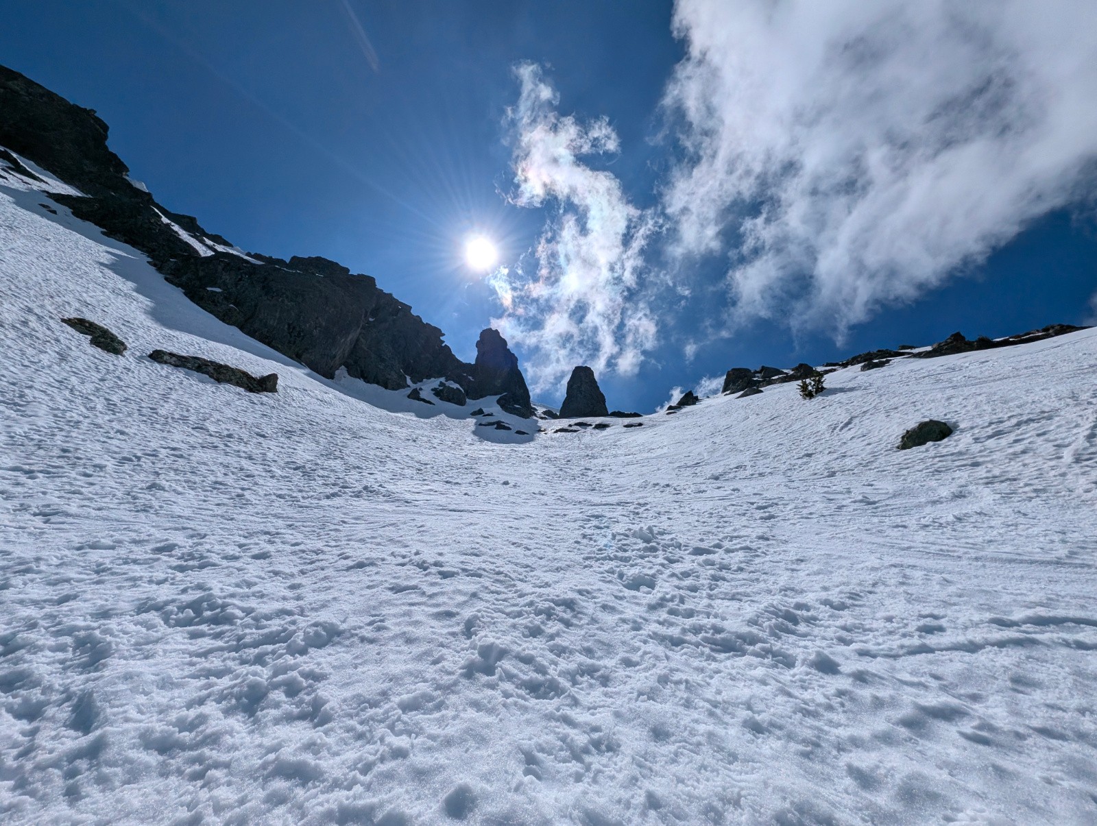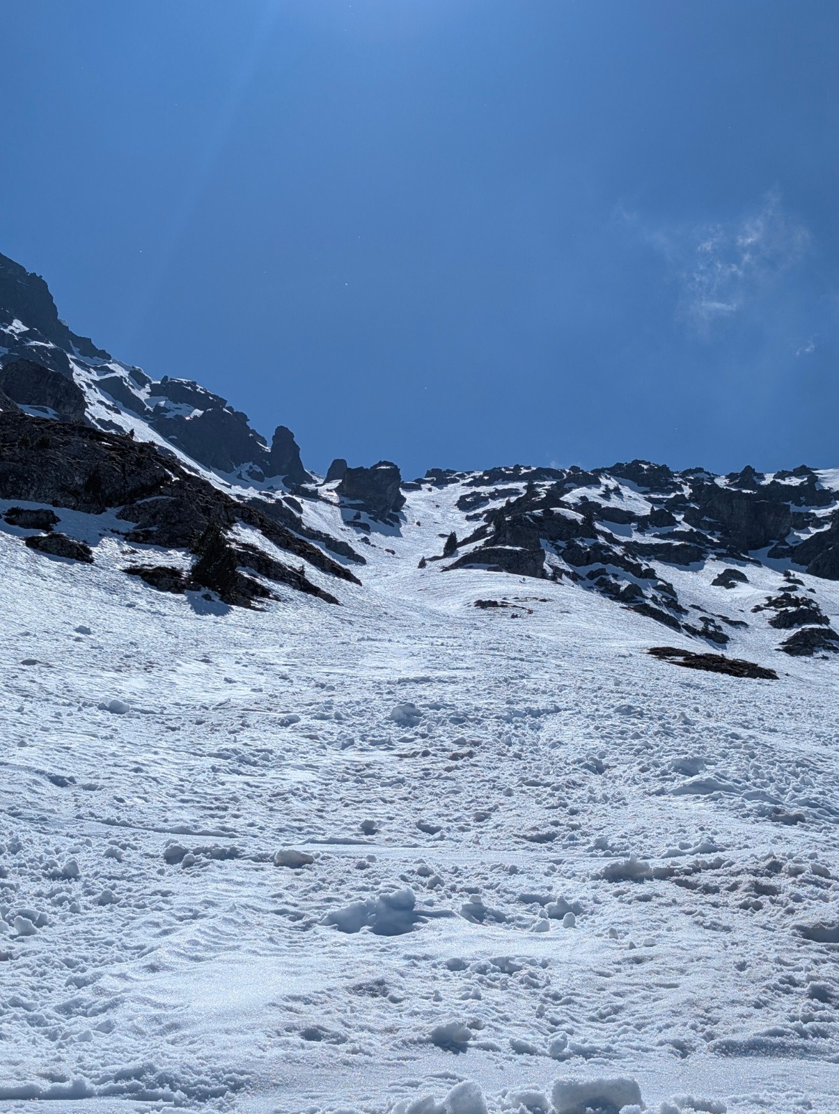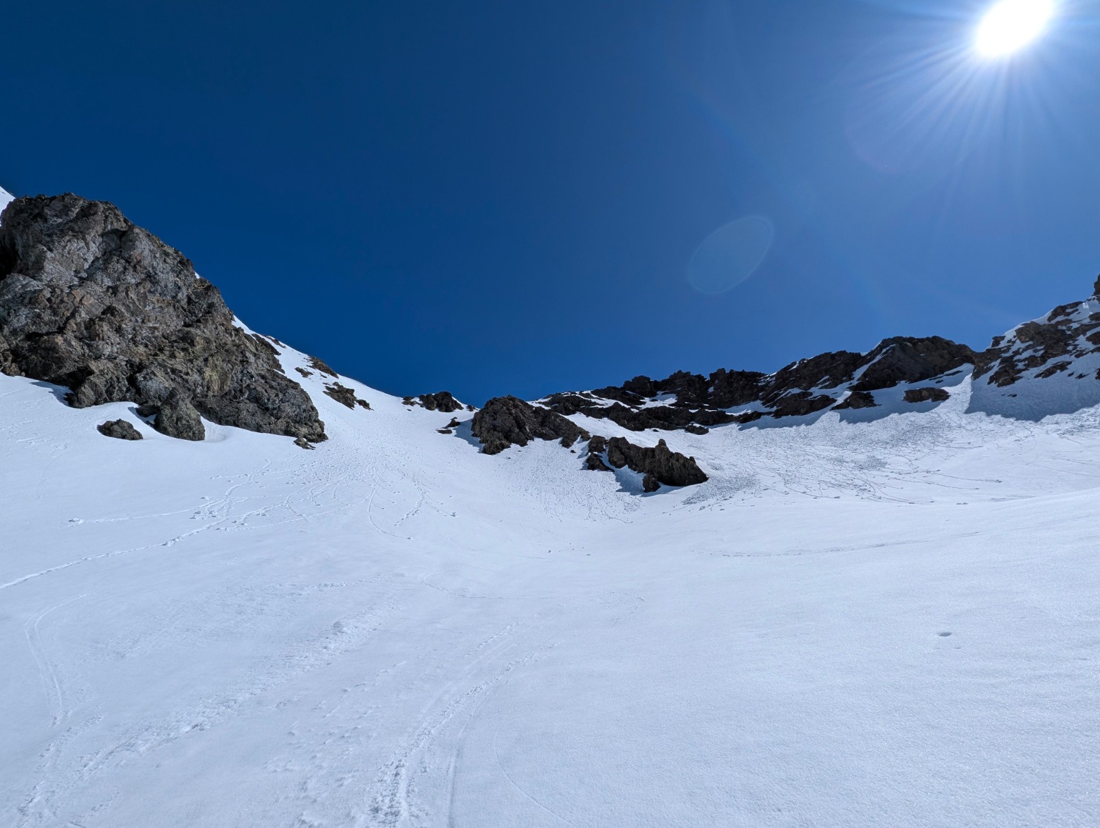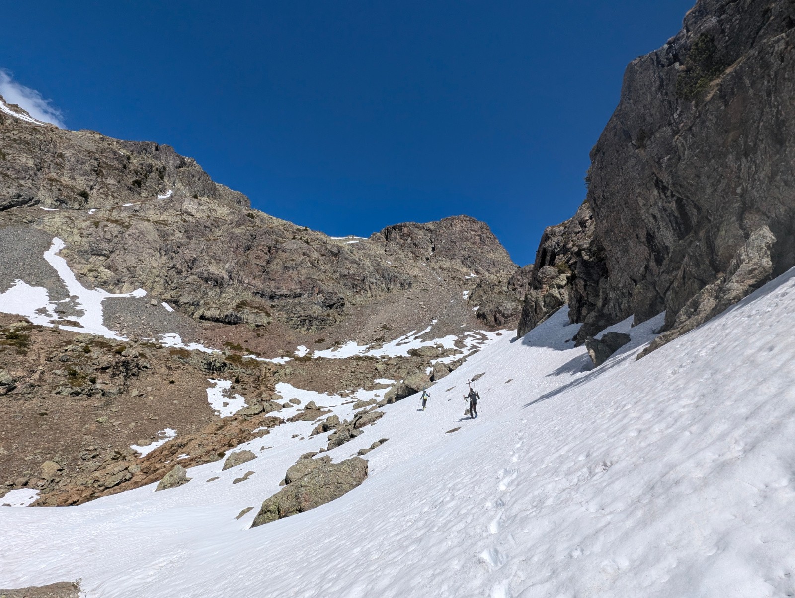 Altitude de chaussage/déchaussage : après le lac du Crozet au dessous pour le retour (couloir N du Grand Colon)
