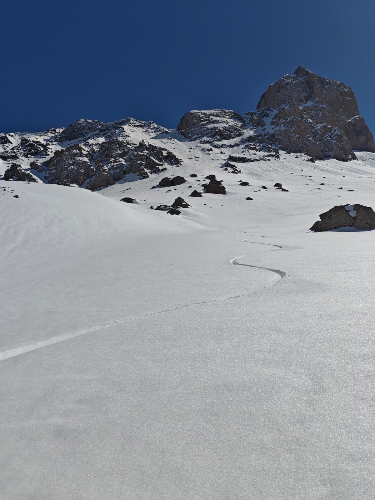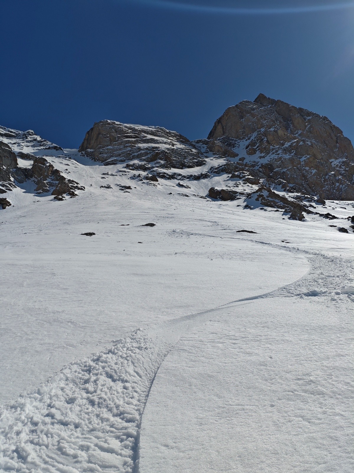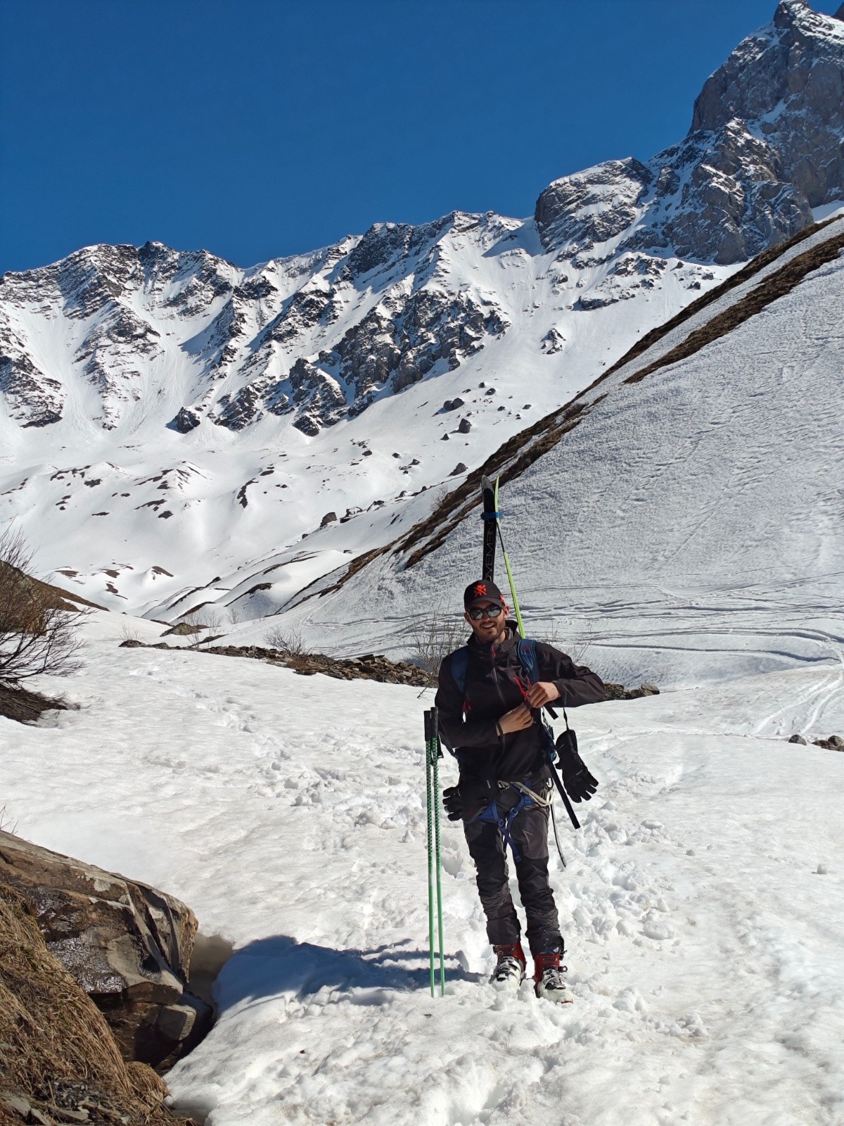 On a voulu tirer a droite, pas top, il vaut mienne rester dans le lit du ruisseau qui est encore bien enneigé et evite les monté descentes