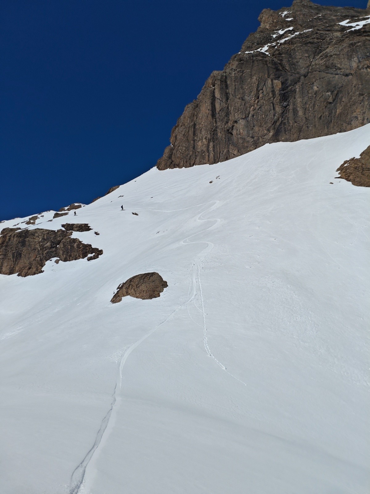 Maxi descente pour un maxi plaisir, poudre bien tassée sur la première moitié, neige bien decaillee sur la deuxième et grosse slush sur le retour au pont