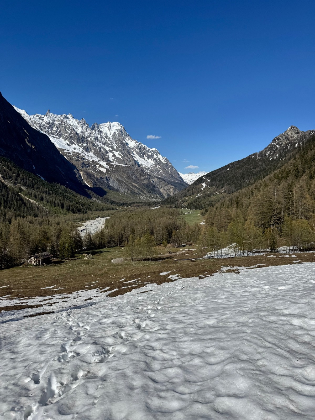 Après toutes ces journées enchaînées ça fait plaisir de pas trop se faire rouster à la montée. C’est efficace et je suis fort chargé encore de la voile de speed, et en matos lourd comme d’hab. l’entrée du Saudan est béton armé voir bleu. Je m’accroche aux rochers mais ça sert à rien je désescalade un petit bout comme d’hab c’est sec au sommet. Ensuite c’est variable. Pas de vraie moquette mais du bleu avec un peu de transfo ou sur du fond froid qui prend le four. Avec de la vitesse finalement ça passe bien mais faut être vigilent. Du ski fort quand même toute la 2e partie et je remonte sur la bosse qui permet d’aller à Quintino sella. 3minutes plus tard ça part sur un run moquette ski sous voile puis raser le Chaos du glacier du Mt blanc et longer les pieds des immenses faces de Baretti, Brouillard. Posé au bout du plat de Miage pensant que l’aventure est pliée. S’en suivront 3h de marche sans neige et 13km jusqu’au tunnel du Mt blanc, la route étant fermée. Finalement c’est mieux en juin avec les bus 😅 ou accepter de prendre le parapente et poser dans la vallée ( particulièrement dangereux l’après midi ici)