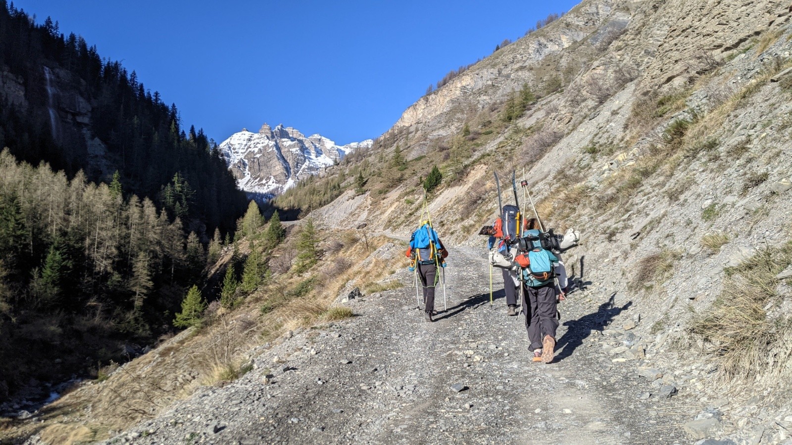Itinéraire suivi : on se gare au premier virage après St Dalmas. Portage sur 4/5 km le long du chemin de Gialorgue. On chausse à la côte 2000 m. Direction l'entrée du couloir à travers la forêt (environ 250m de D+). Puis on s'équipe avec les crampons et remontée du couloir de la raie des fesses. L'exposition intégralement à l'ombre et le regel nocturne rendent la montée très efficace. On évite deux missiles à mi pente sinon aucune coulée/pierres supplémentaires.