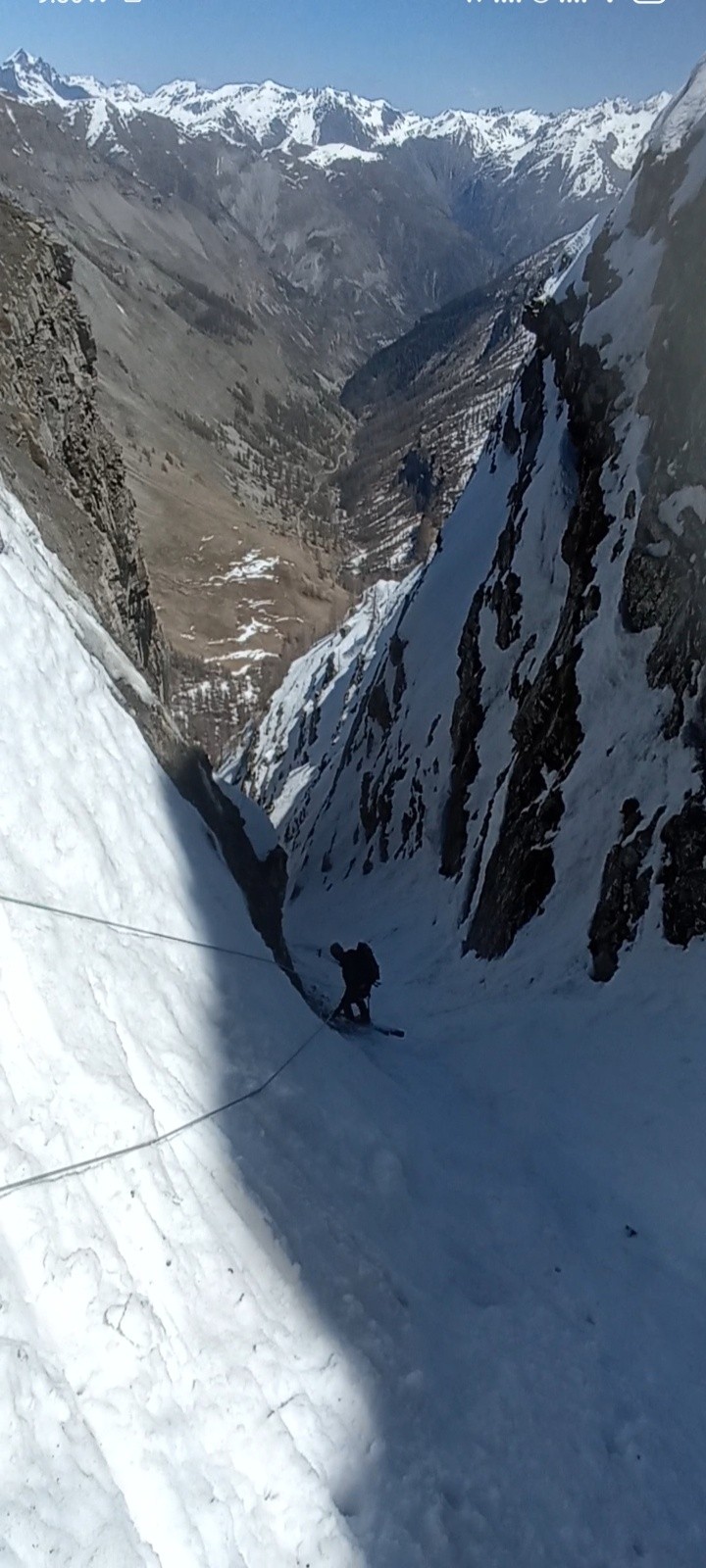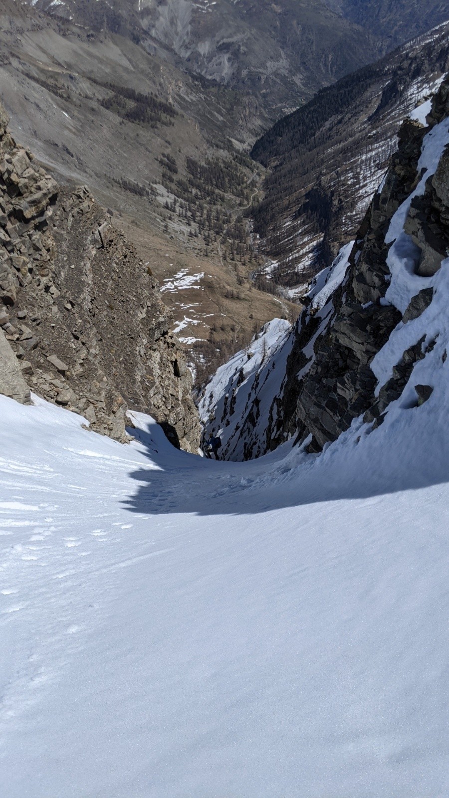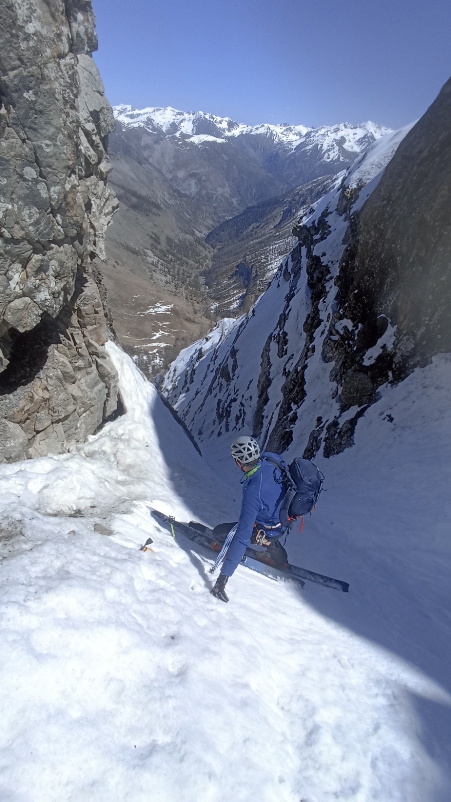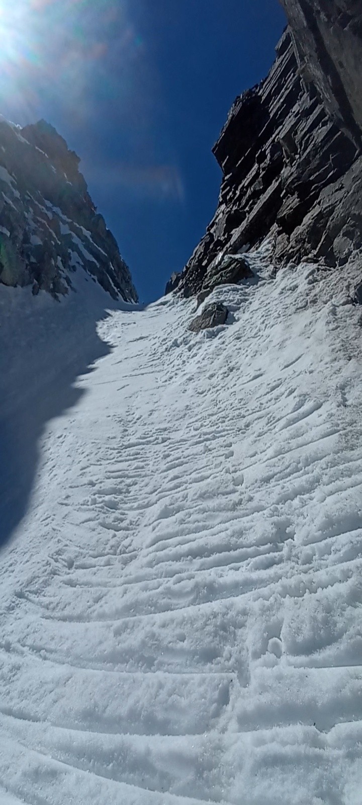 Conditions pour le ski : il y a encore de quoi faire dans les environs (après un bon portage cependant) en partant tôt (bonne neige au dessus de 2000). Couloir en condition pour la montée avec petit regel nocturne. Pas vraiment en condition pour la descente (rigole creusée au centre dans une des parties les plus raides).