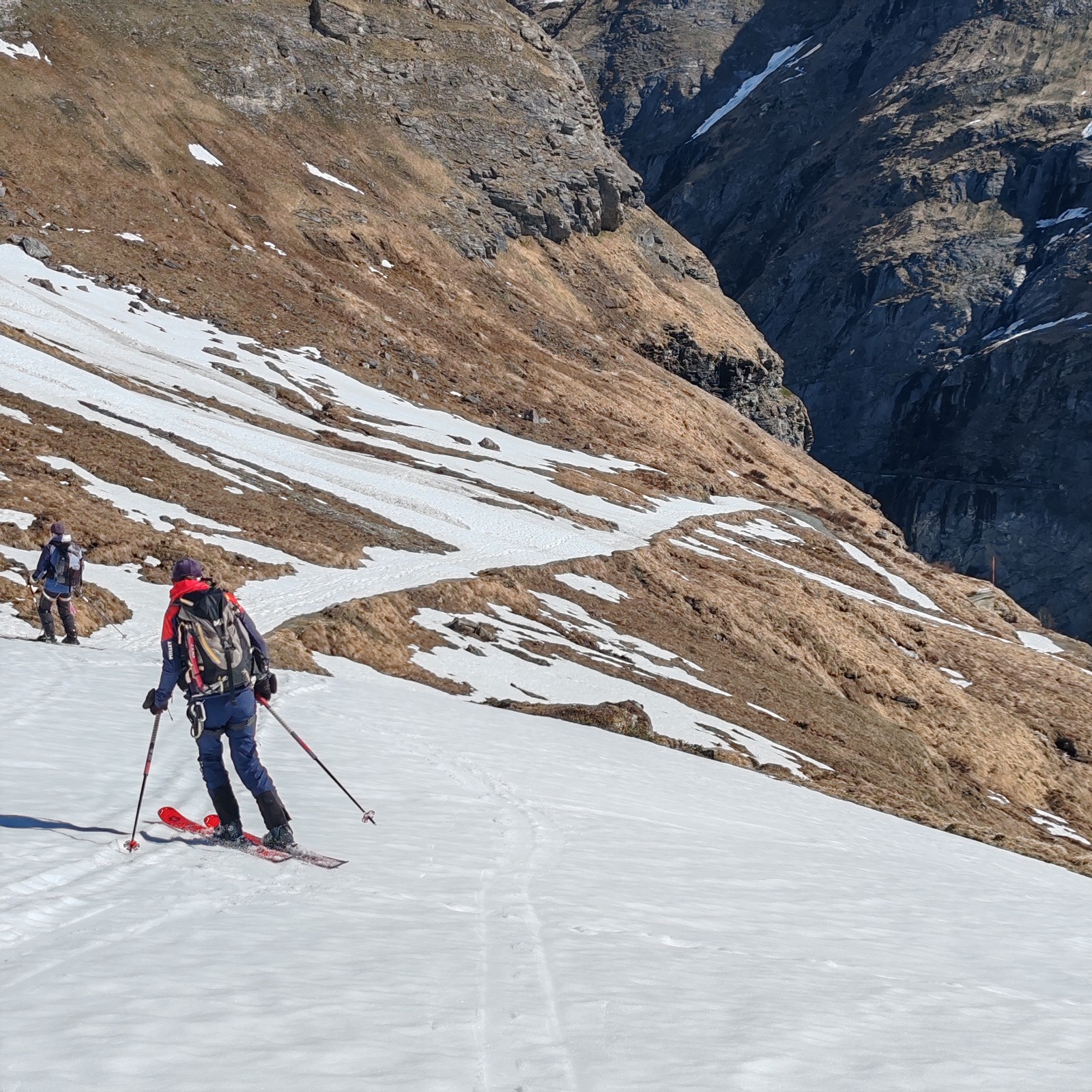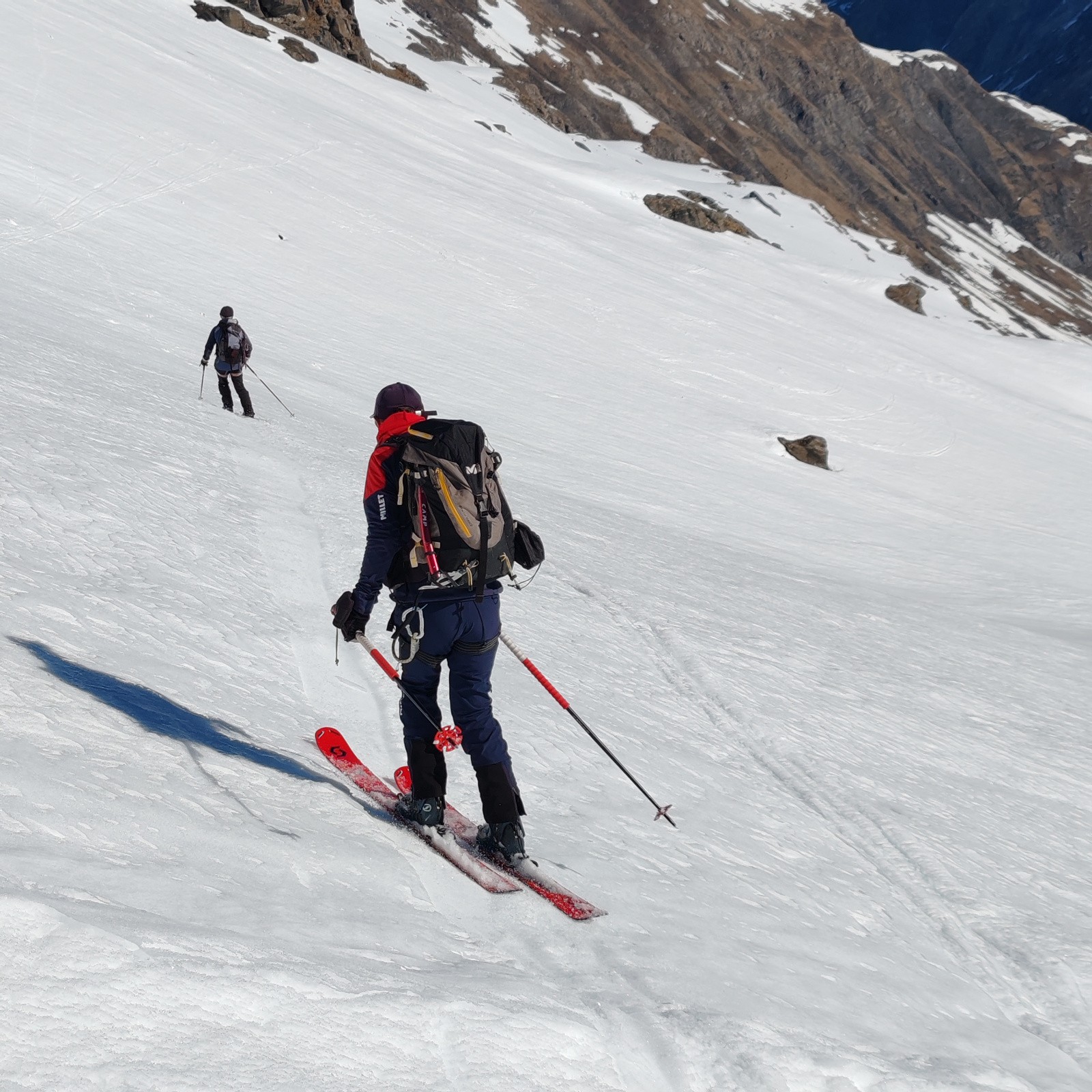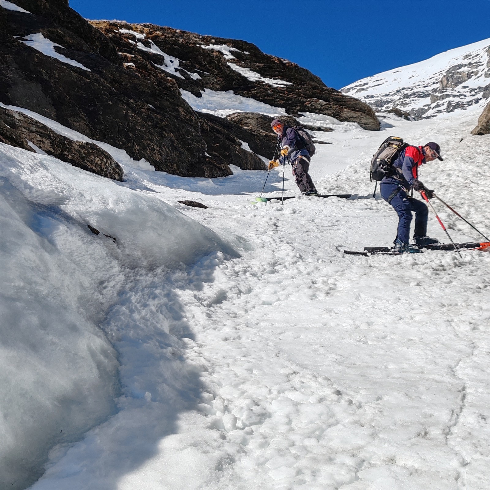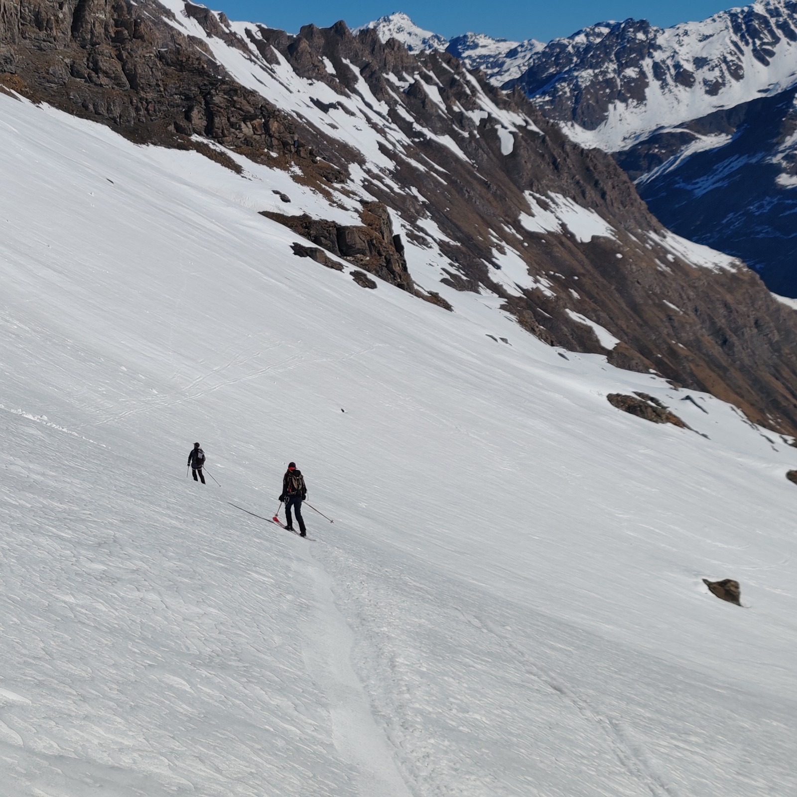 Conditions pour le ski : parfaites conditions si on respecte le timing, ça chauffe vite sur les versants E, on skie encore jusqu'au barrage et on utilise les galeries d'hiver pour sortir de la zone du barrage.