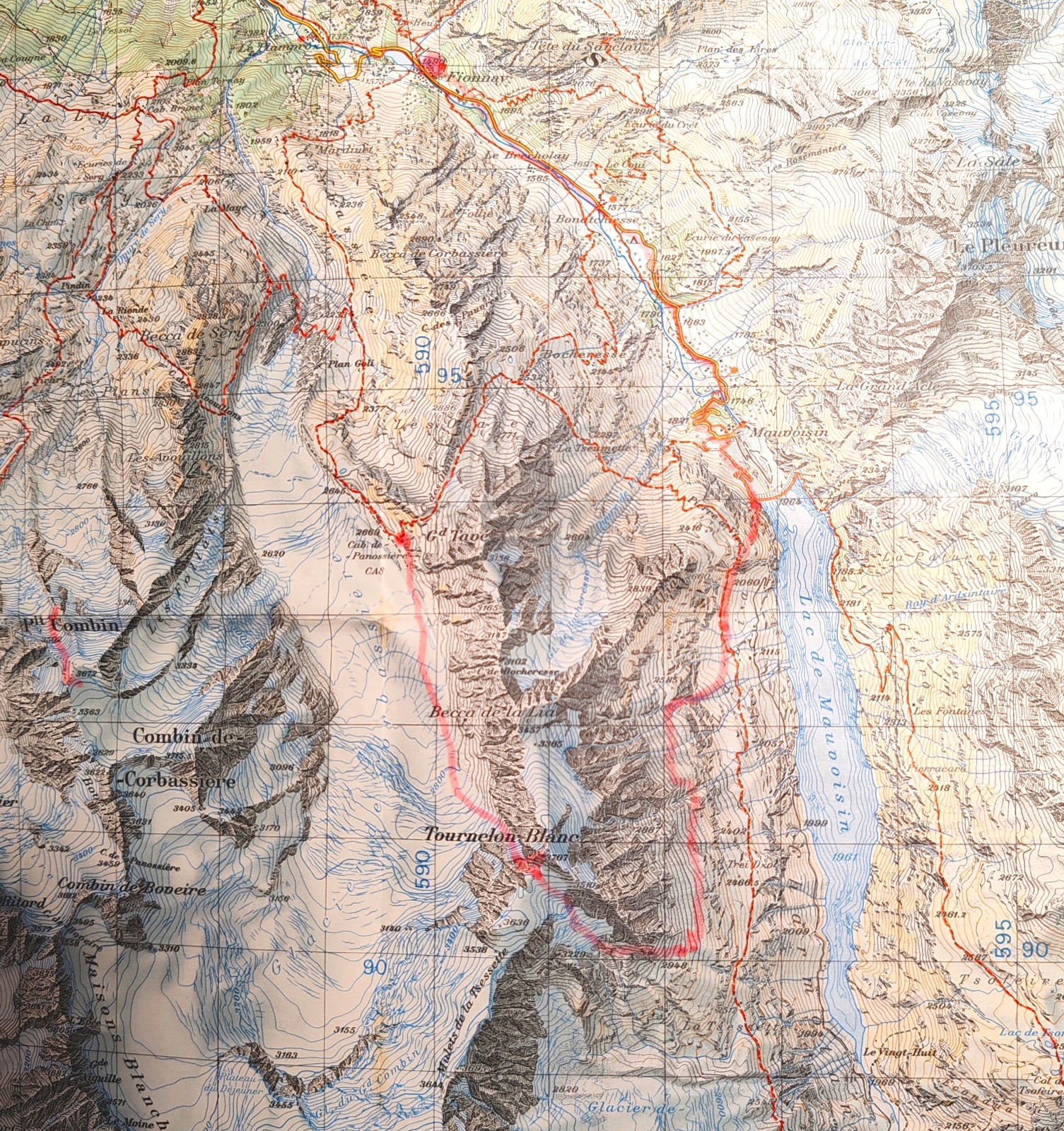 Ah oui ! il faut vous dire que j'étais avec deux boulangers qui en ont rencontré un troisième dans la cabane de Panossière. Alors ces trois-là ils m'ont gonflé, vraiment gonflé... Faut dire qu'à l'époque on se foutait du gluten... Et le gluten ça fait gonfler ça provoque des ballonnements... Surtout quand on est en altitude... ceux qui ont dormi dans une cabane le savent...Bref, revenons à nos copains boulangers, qui confondent galeries de barrage avec trous dans le pain. Des boulangers un peu poètes un peu rêveurs qui voyagent à l'intérieur d'une miche comme on traverse l'immensité d'un barrage swiss made. Je veux parler du barrage de Mauvoisin. C'est un putain de barrage comme dirait mon copain boulanger entièrement fait avec du béton riche en gluten ce qui permet de faire gonfler la mie riche en galeries et de donner une croûte solide... Et ils ont aussi des bonnes idées ces boulangers, on avait donc choisi de monter au Tournelon Blanc en partant de la cabane, tout ça pour aller visiter un barrage et longer le lac de Mauvoisin... Sacré bambée cette rando garantie sans gluten..! Mais quelle magnifique descente qui demande de la concentration pour ne pas se perdre dans les barres qui ne sont pas en chocolat. Avec un timing parfait pour profiter d'une moquette juste à point sortie du four..! ( descendre avant 9h ) On oubliera le retour à pied depuis le barrage au moins 7 km et pas le moindre bus postal, vu que la route est coupée par une avalanche, pont emportant tout espoir de rentrer en voiture à Fionnay...