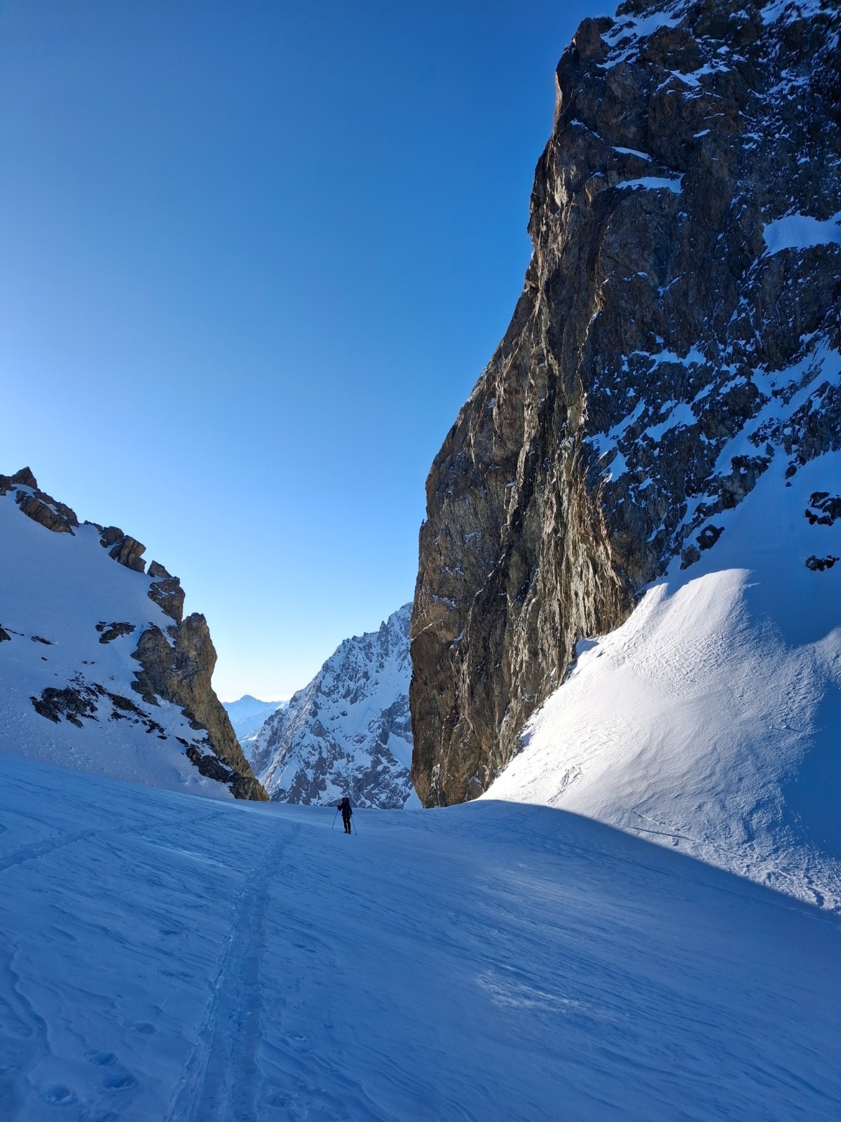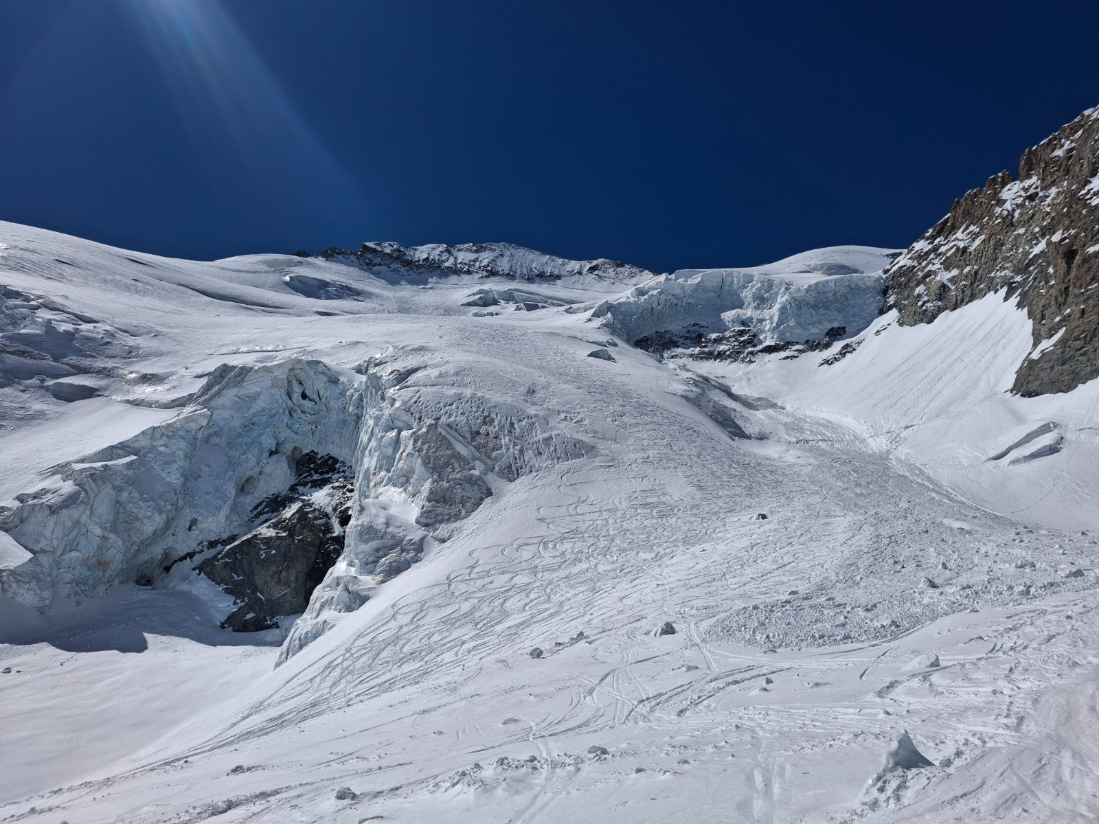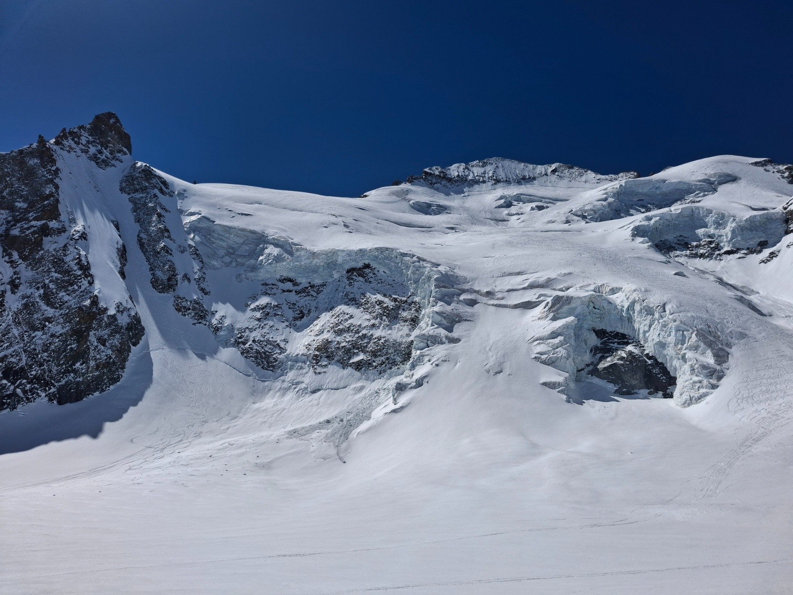 J1 Montée au Dôme par la Brèche Lory, bonnes conditions, tout en neige, rimaye bouchée localement, bon escalier déjà fait. Nous avons protégé les deux traversées exposees de 30m (sangle en place main droite puis sur une broche à glace). Quasi personne là haut, aller-retour à la Barre pour 1 de nous 2 (quasi inskiable, desescaladé) puis Barre Noire en très bonne condition sauf petite traversée en glace entre Dôme et l'entrée du couloir. Les séracs du Dôme font peur...