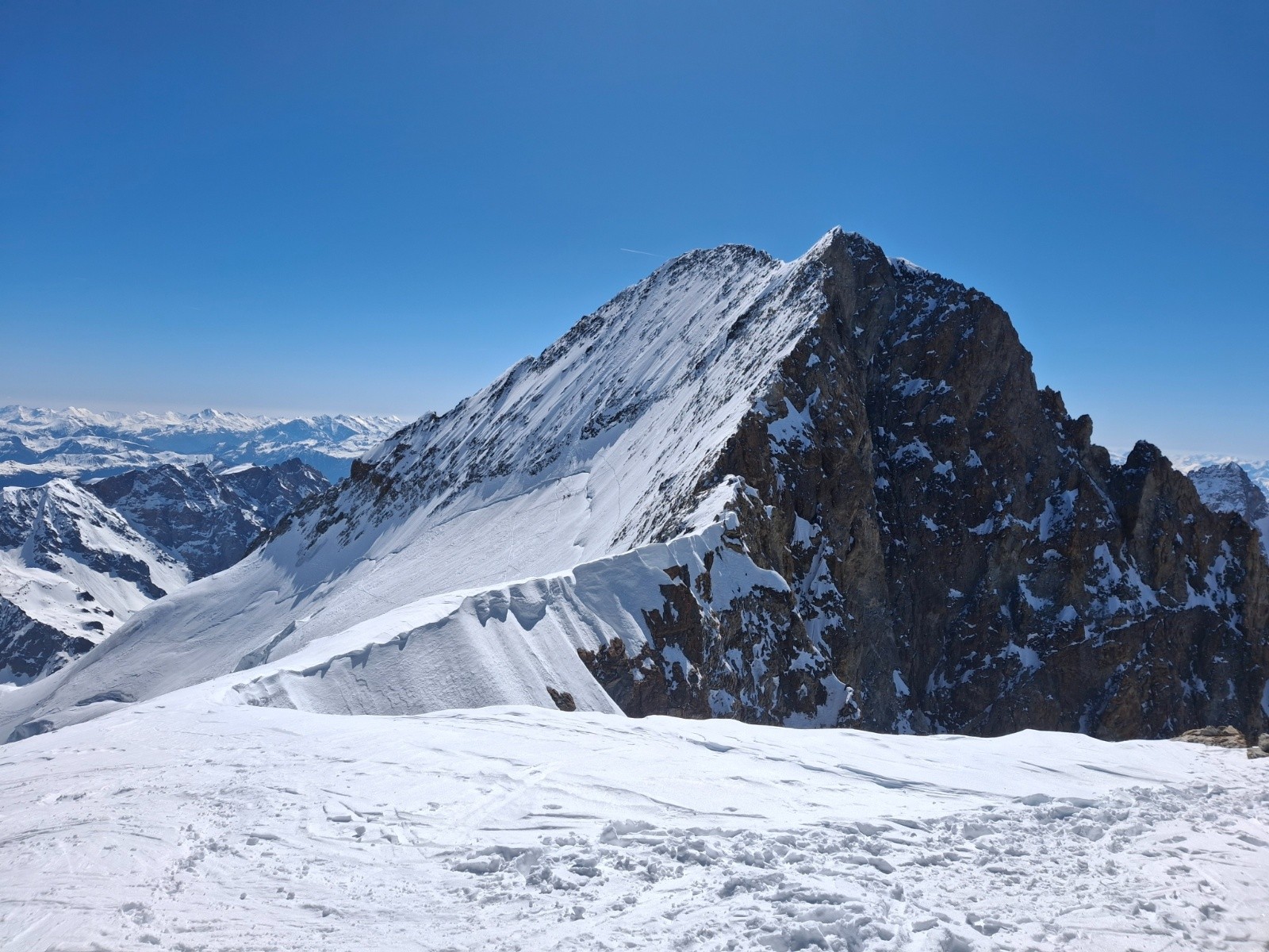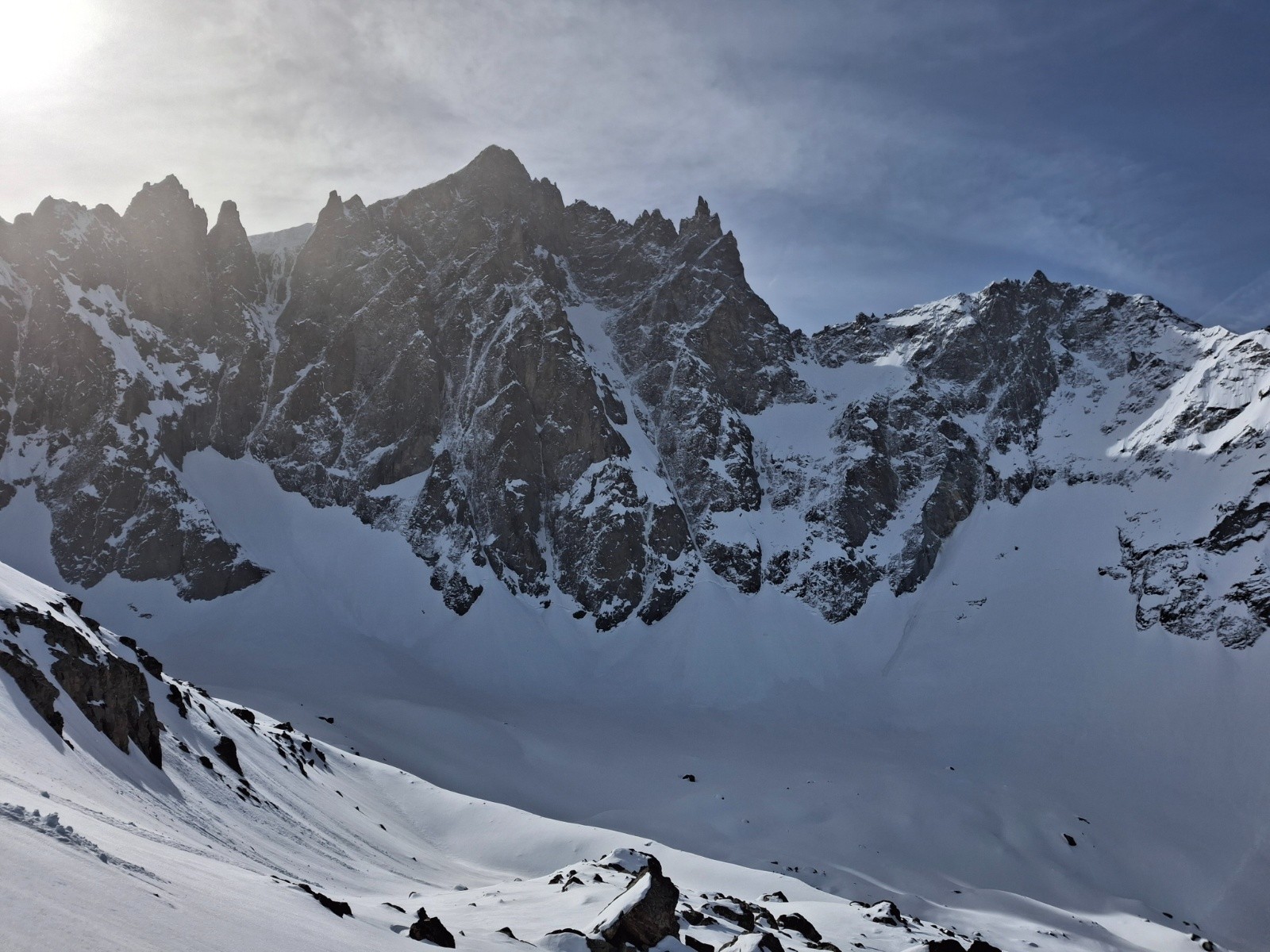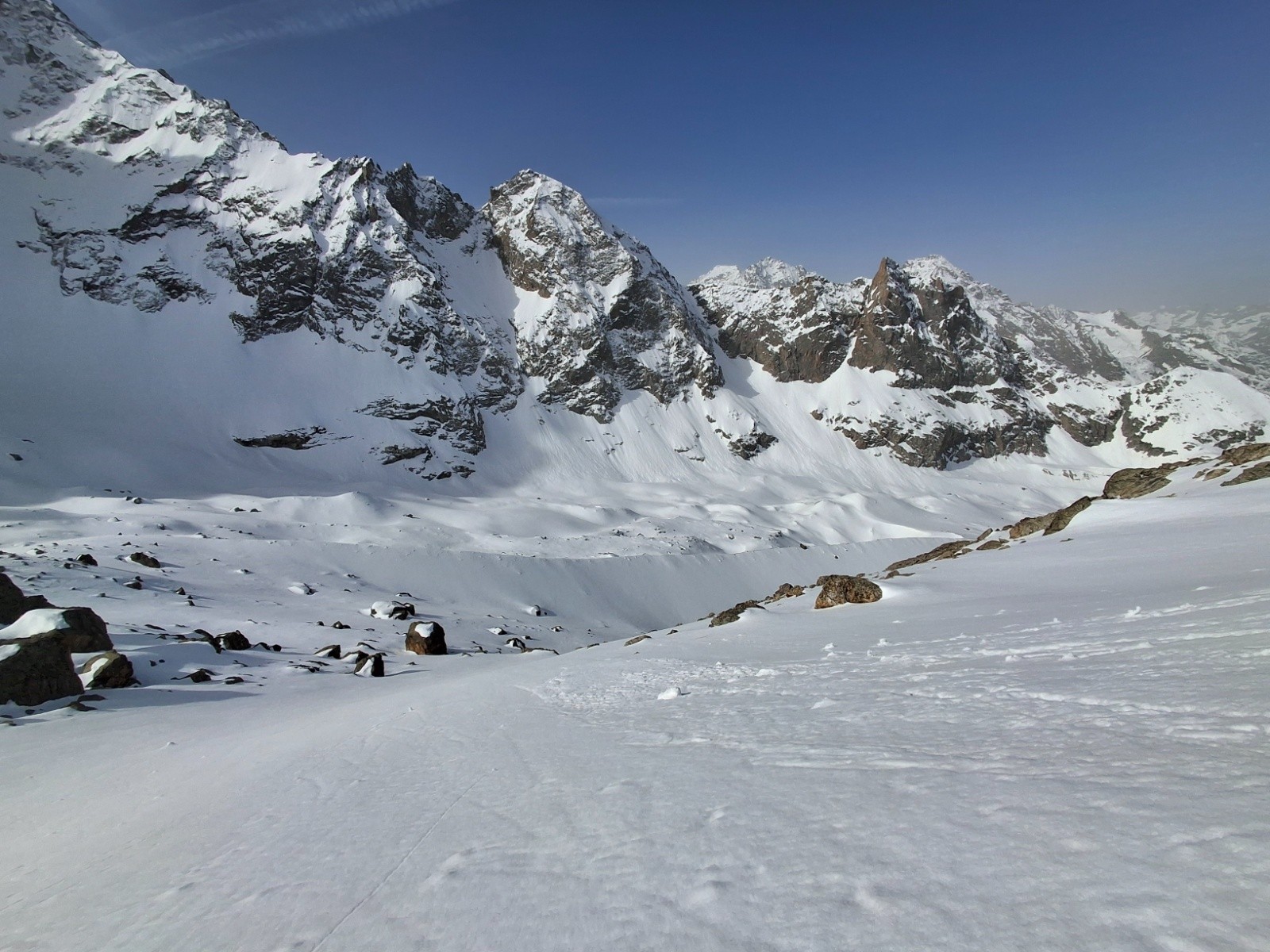 J1 Montée au Dôme par la Brèche Lory, bonnes conditions, tout en neige, rimaye bouchée localement, bon escalier déjà fait. Nous avons protégé les deux traversées exposees de 30m (sangle en place main droite puis sur une broche à glace). Quasi personne là haut, aller-retour à la Barre pour 1 de nous 2 (quasi inskiable, desescaladé) puis Barre Noire en très bonne condition sauf petite traversée en glace entre Dôme et l'entrée du couloir. Les séracs du Dôme font peur...