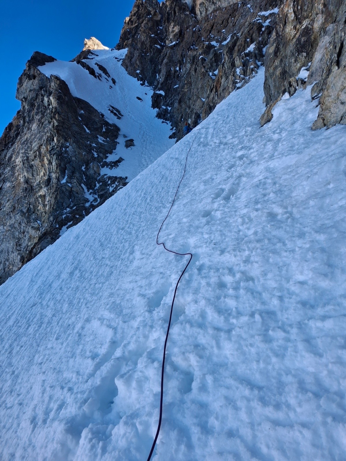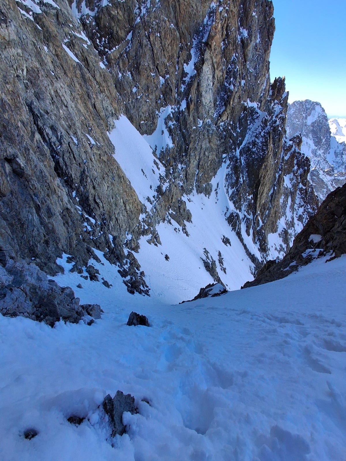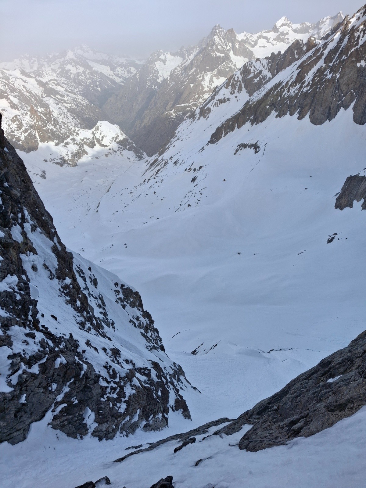 J2 changement de programme (cause meteo), retour direct par le Col des Ecrins en bonnes conditions. Rappel de 30m quasi obligatoire, 60 m confort. Merci aux 2 alpinistes (Mayer Dibona la veille... grand bravo) qui nous ont aidé avec leurs cordes de 60, on aurait bien bricolé avec la nôtre de 30. Longue traversée descendante, desescaladee, en neige pourrie, au dessus des barres.