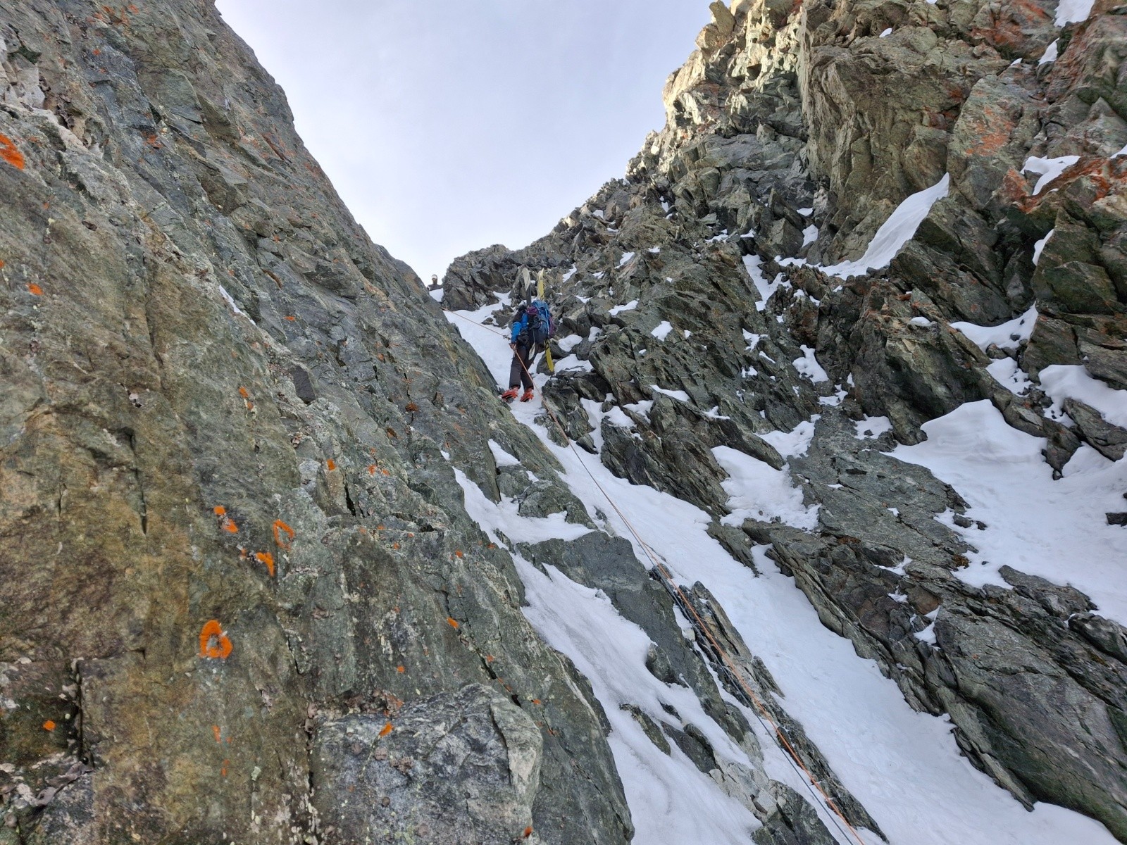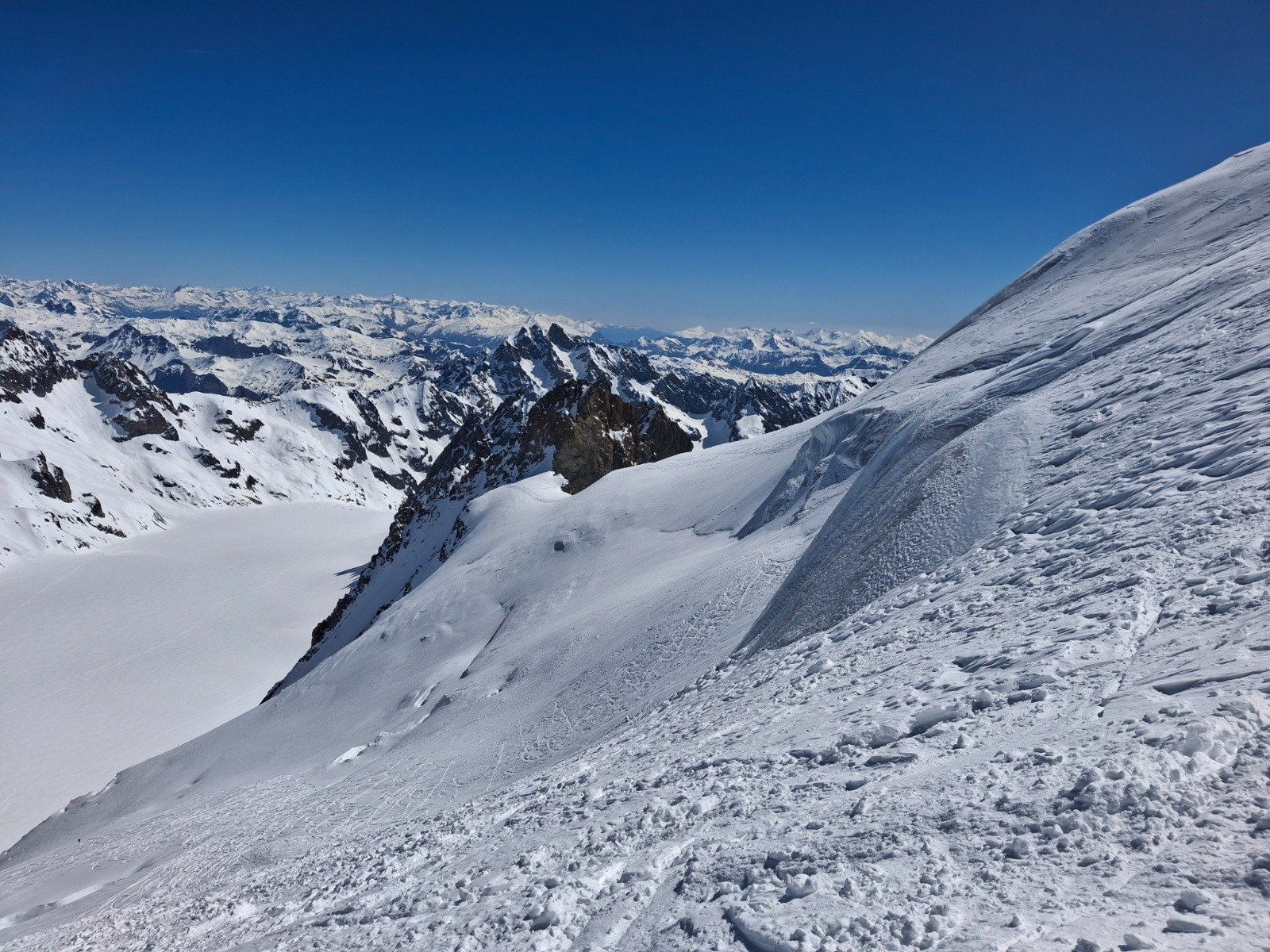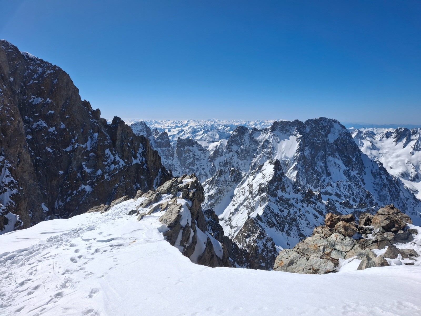 J2 changement de programme (cause meteo), retour direct par le Col des Ecrins en bonnes conditions. Rappel de 30m quasi obligatoire, 60 m confort. Merci aux 2 alpinistes (Mayer Dibona la veille... grand bravo) qui nous ont aidé avec leurs cordes de 60, on aurait bien bricolé avec la nôtre de 30. Longue traversée descendante, desescaladee, en neige pourrie, au dessus des barres.