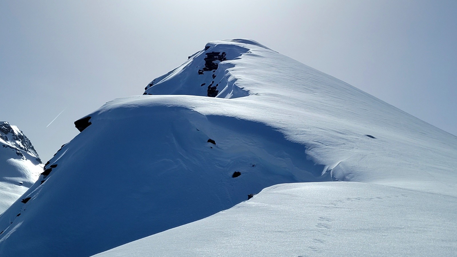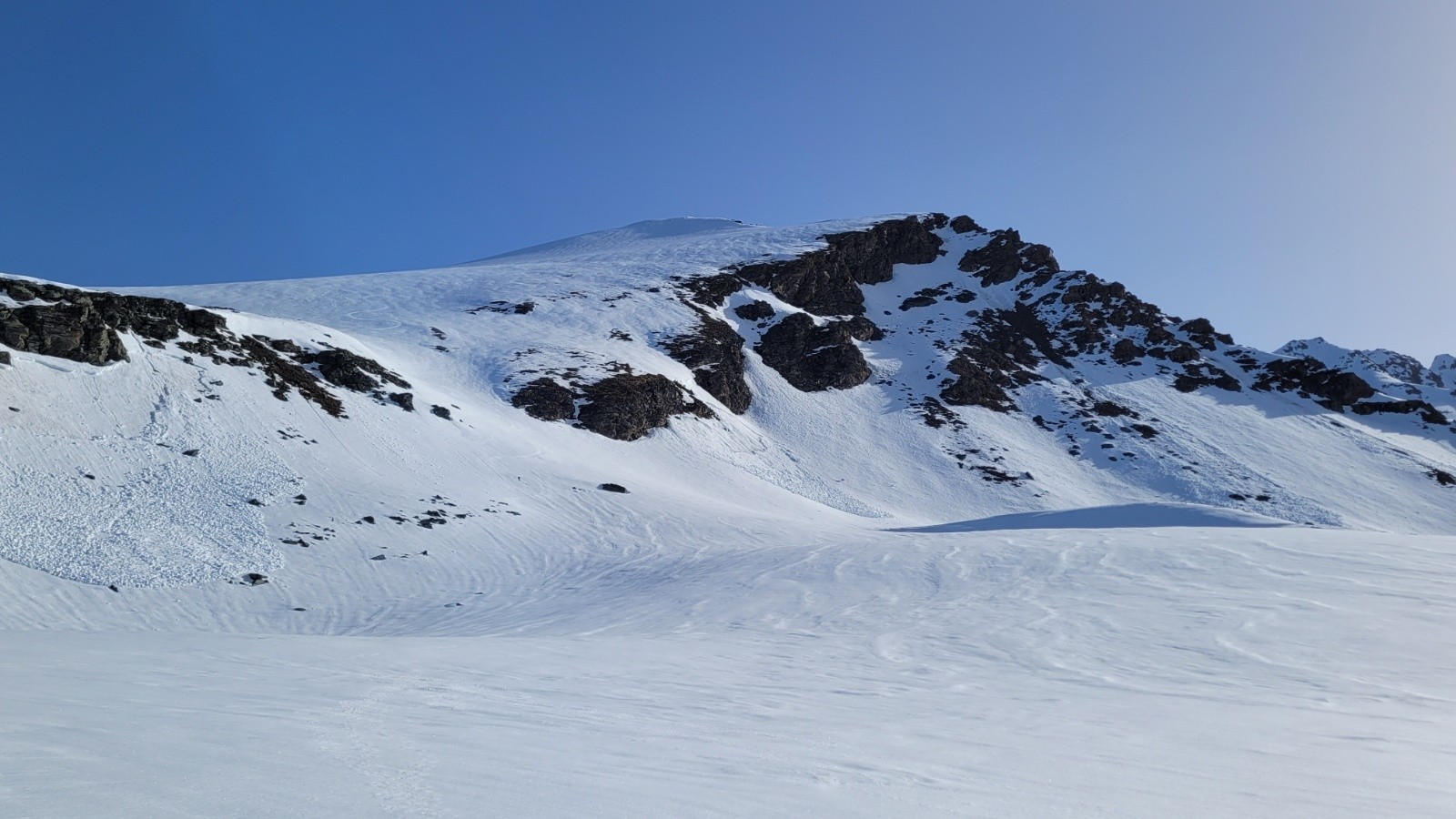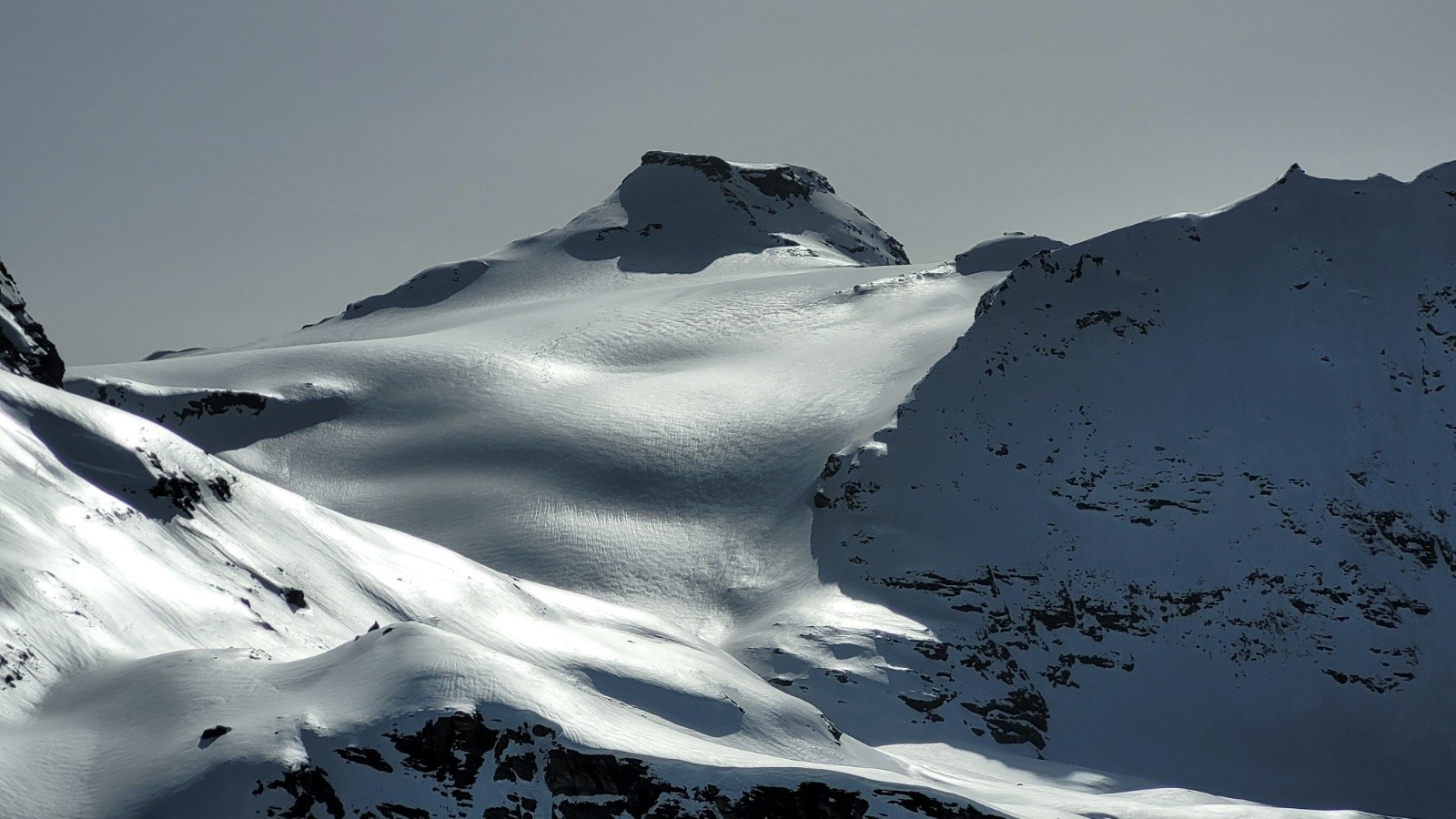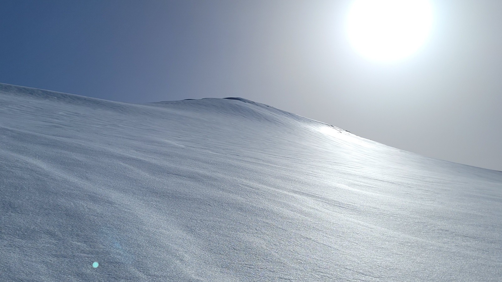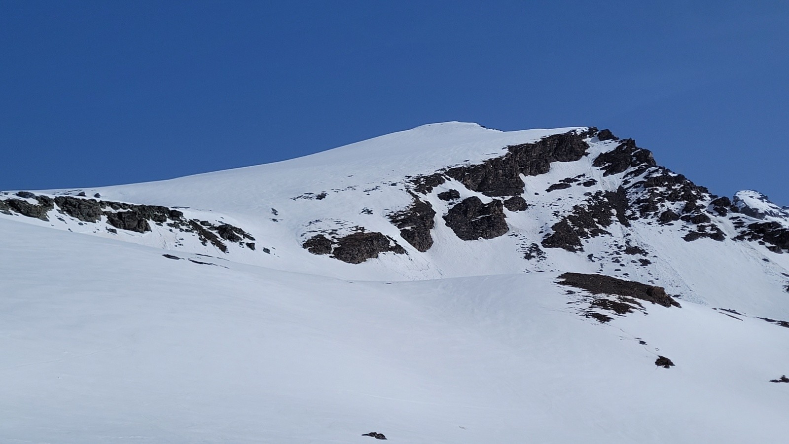 Conditions pour le ski : Très bonnes avec une neige dure à la montée. Début de descente en neige dure lisse très agréable sur le bloc sommital et de la bonne moquette plus bas.