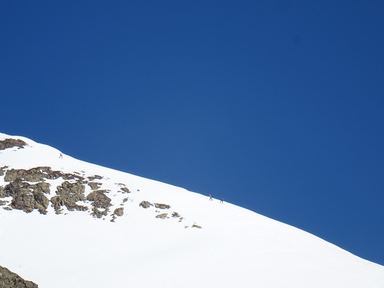 Du monde aujourd'hui avec une trentaine de skieurs aperçus/croisés dans le secteur (se dispersant les divers itinéraires). Et la très bonne surprise de retrouver Siglle, qui m'a reconnu malgré le "déguisement": on a bien papoté sur la portion commune de nos montées, c'était très sympa - et donc on va s'organiser pour partager une prochaine virée :-). Et on a même récupéré un casque qui s'était échappé du sac à dos d'une de ses potes, mais qui avait eu le bon goût de ne pas trop débarouler...