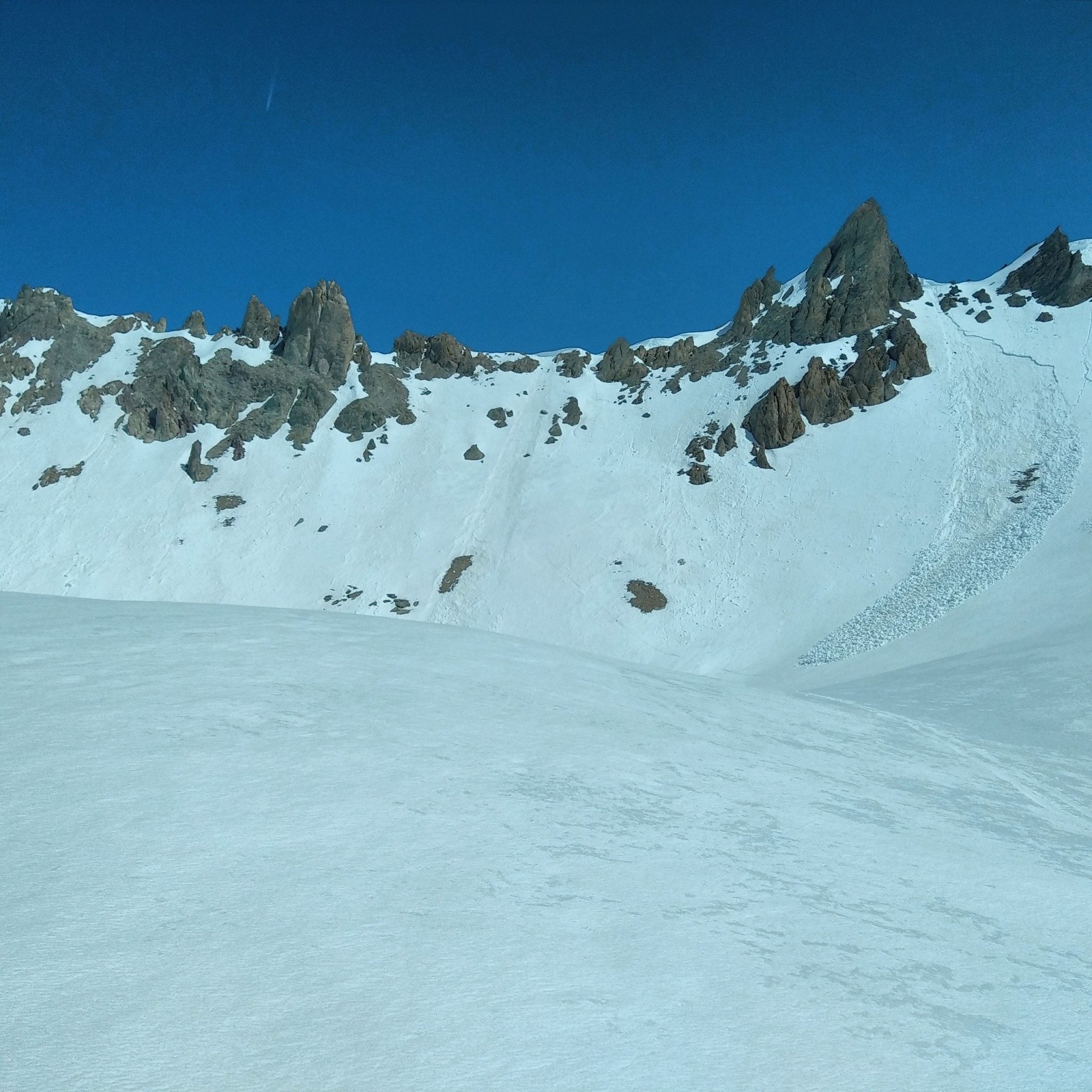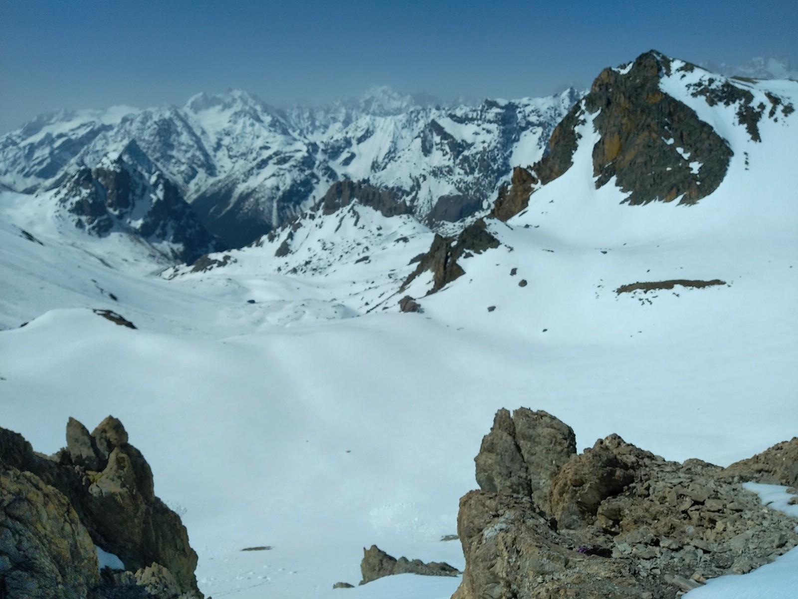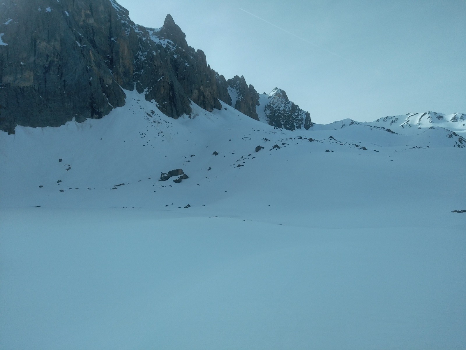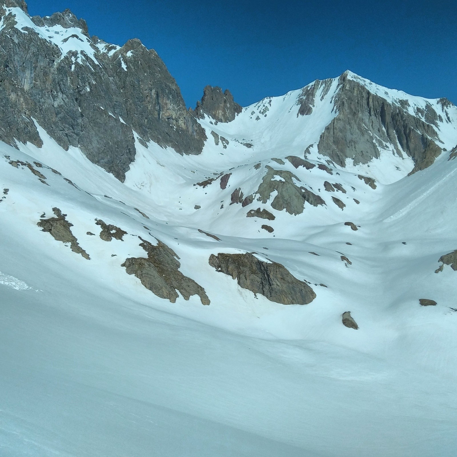 Mouliniere à partir du Col des Beraudes..et descendre le couloir Nord de la mouliniere...mais ce couloir est ravagé par les coulées et les pierres et la partie sud a une énorme corniche qui surplombe le couloir...pas de regret.