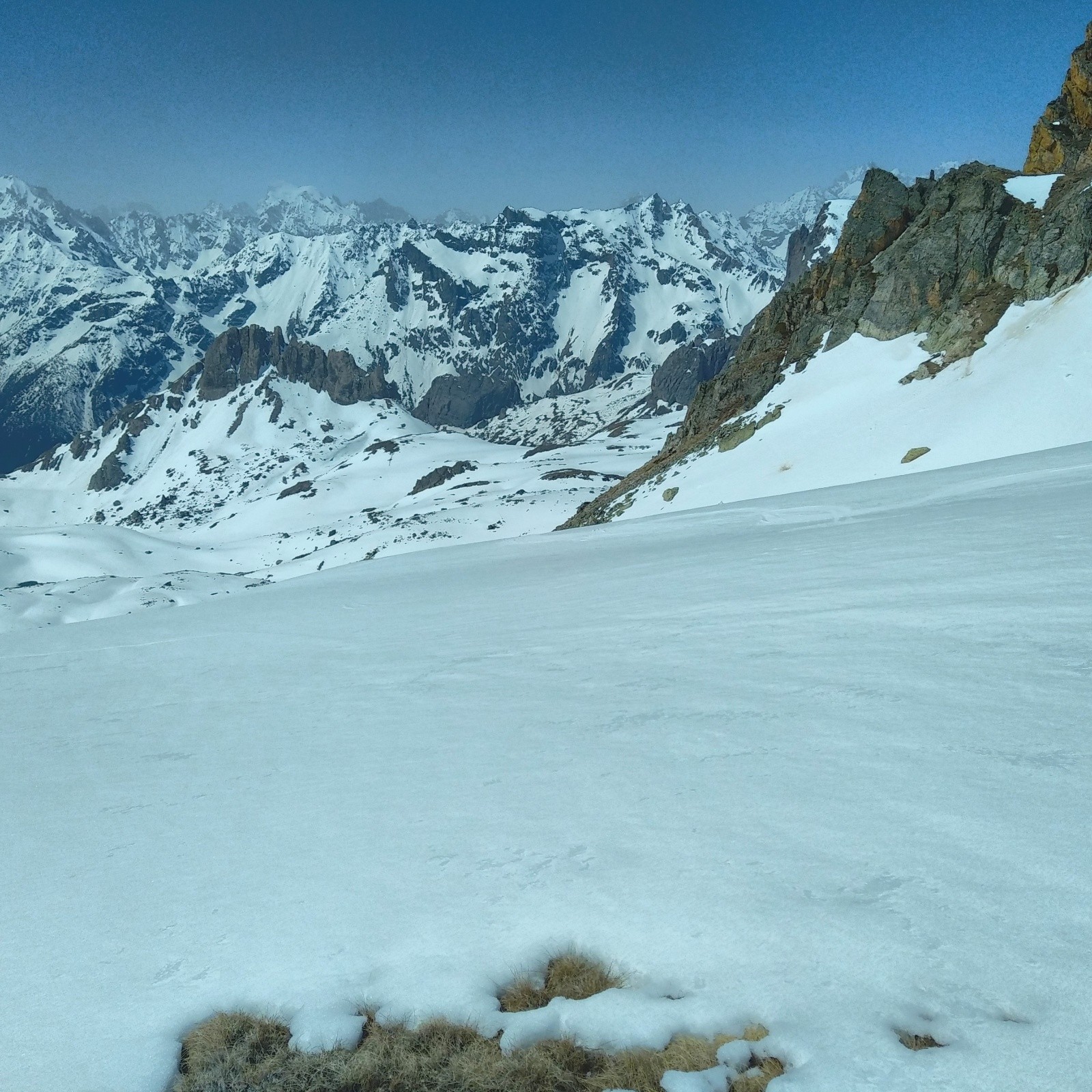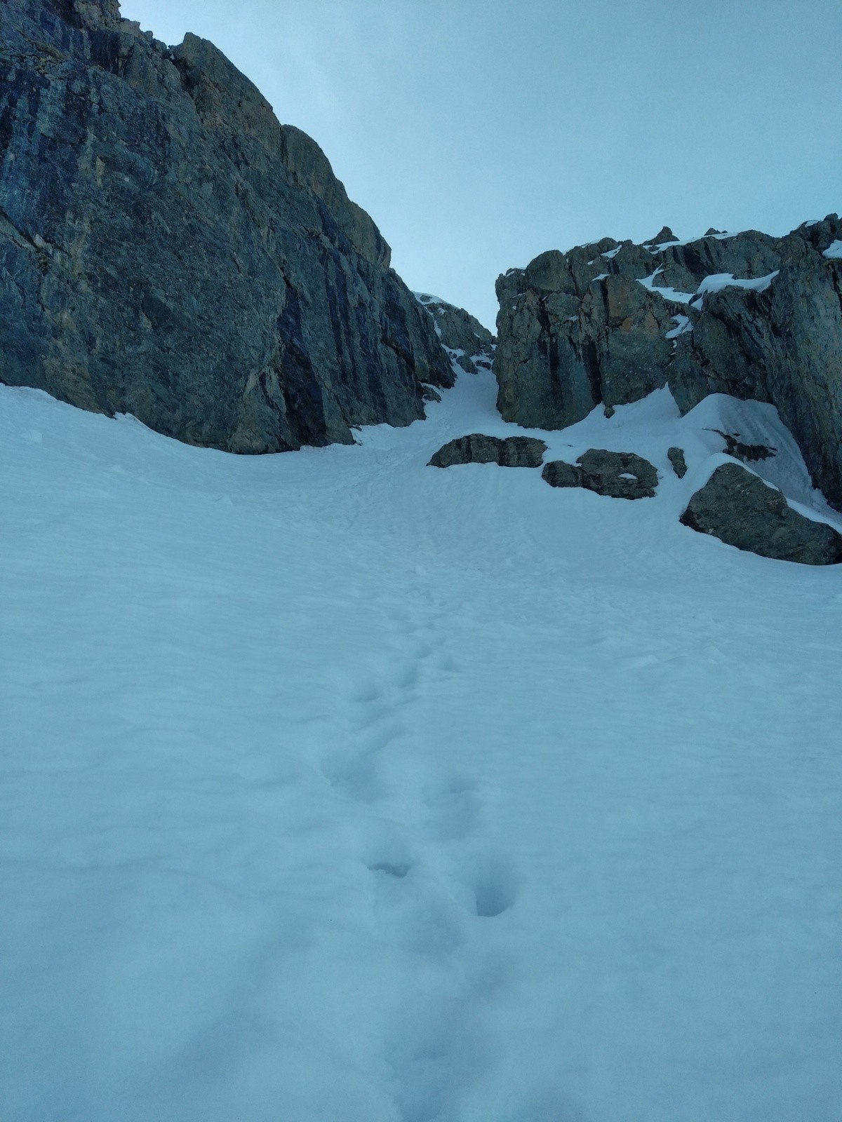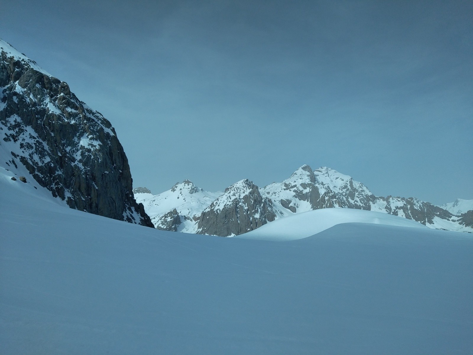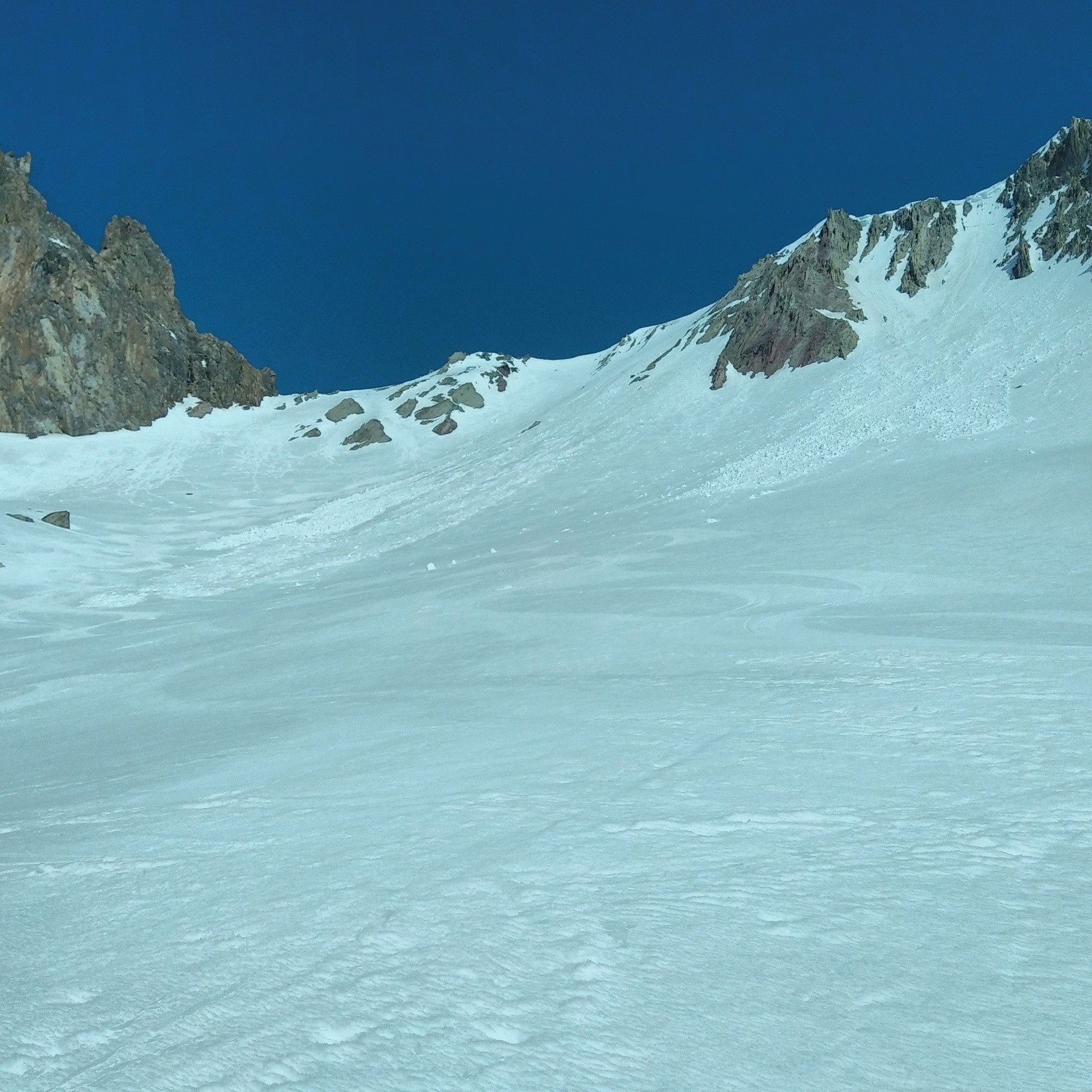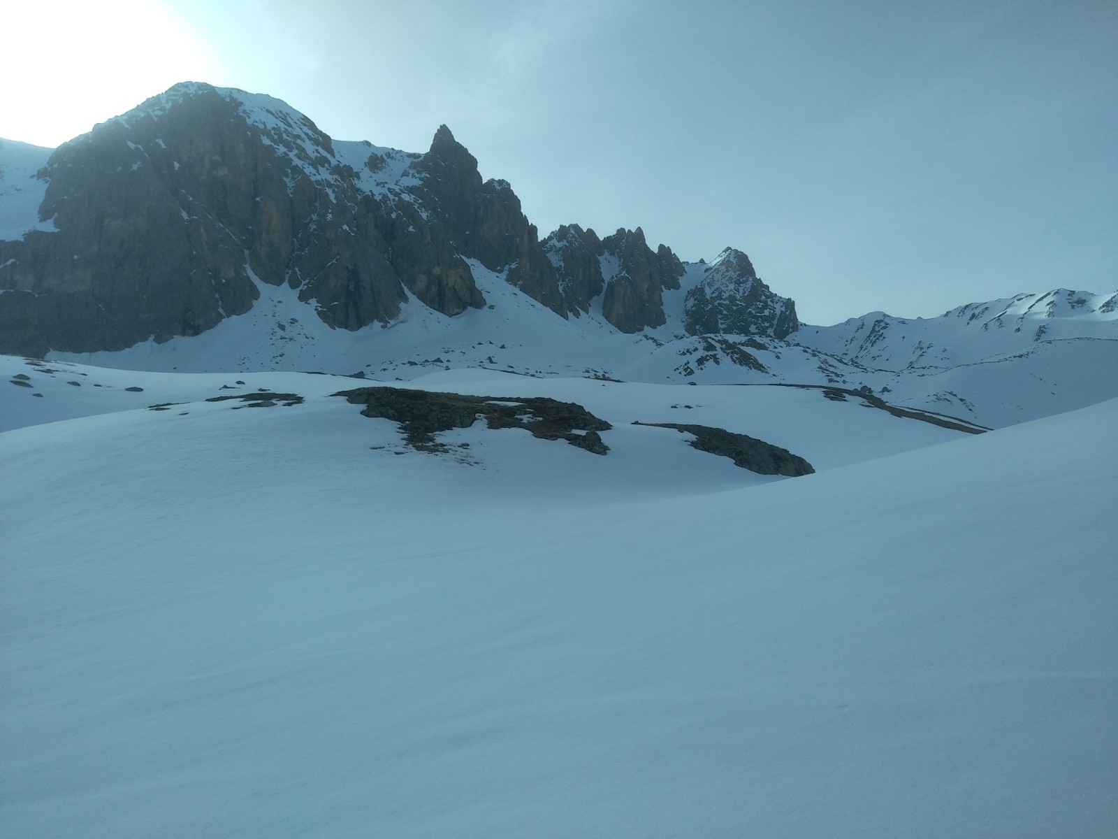 Mouliniere à partir du Col des Beraudes..et descendre le couloir Nord de la mouliniere...mais ce couloir est ravagé par les coulées et les pierres et la partie sud a une énorme corniche qui surplombe le couloir...pas de regret.