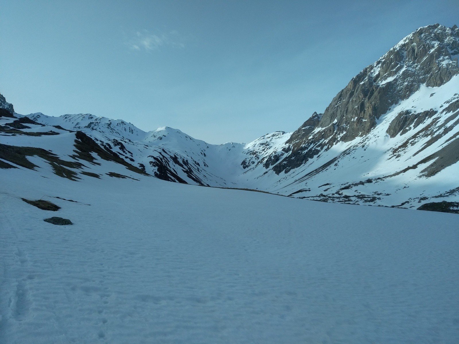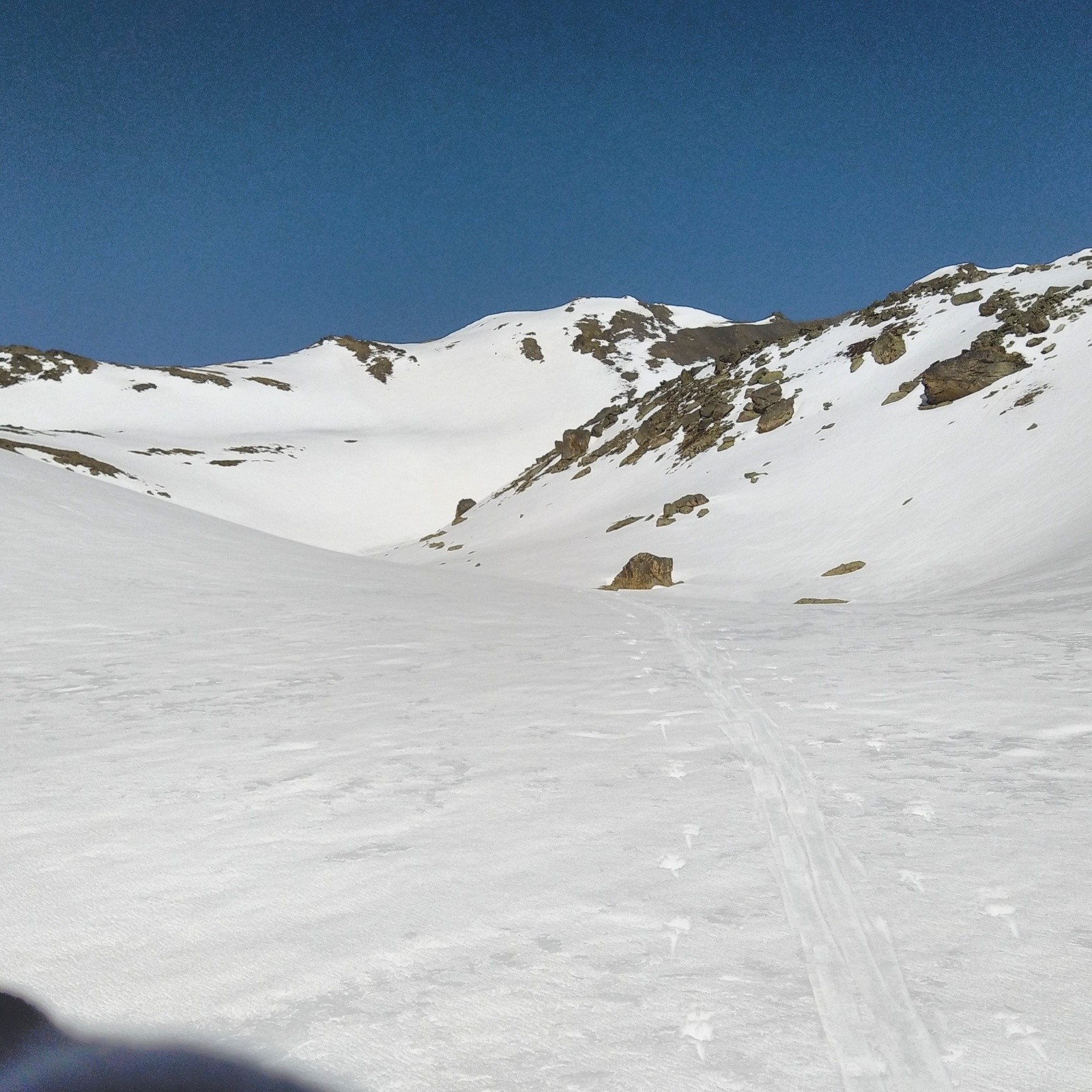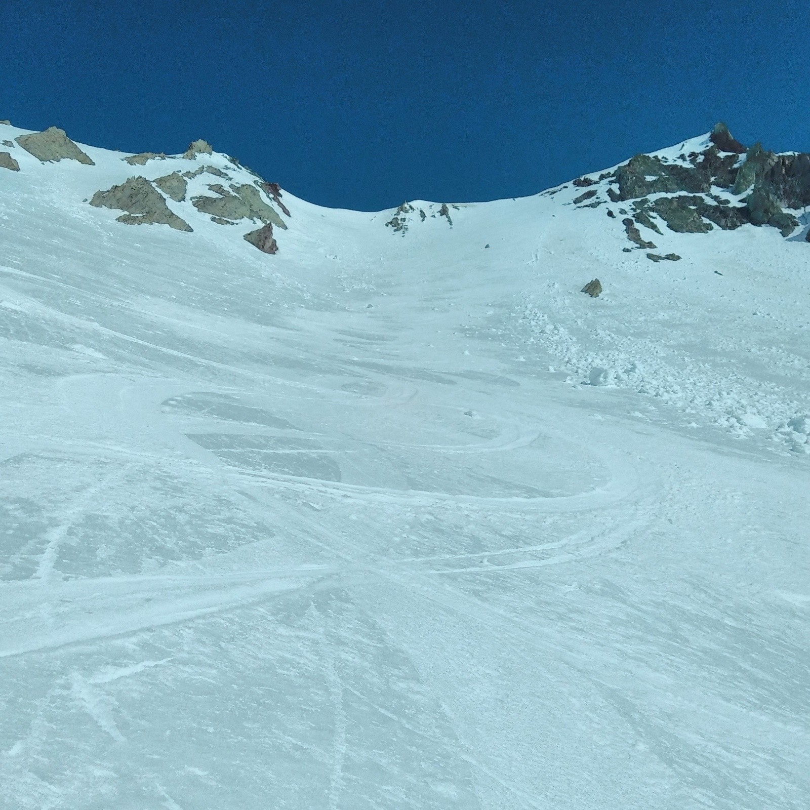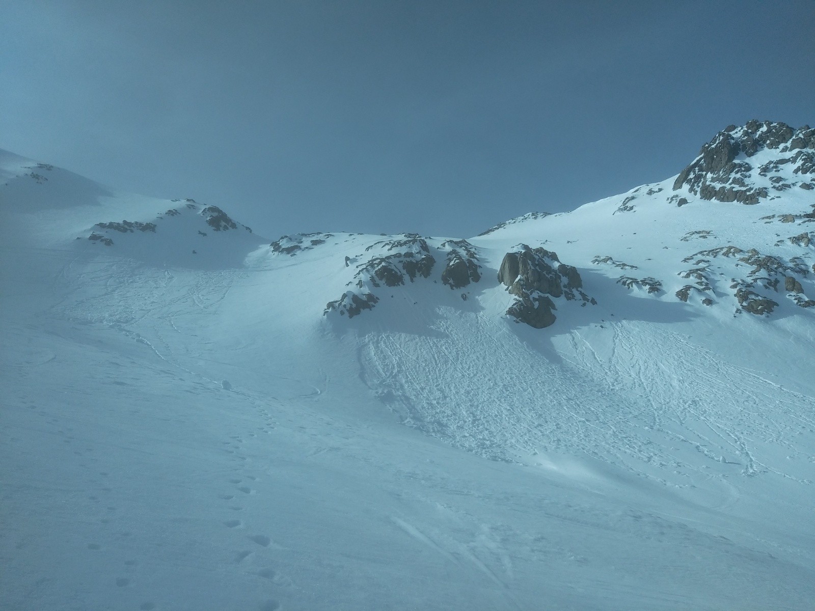 Mouliniere à partir du Col des Beraudes..et descendre le couloir Nord de la mouliniere...mais ce couloir est ravagé par les coulées et les pierres et la partie sud a une énorme corniche qui surplombe le couloir...pas de regret.