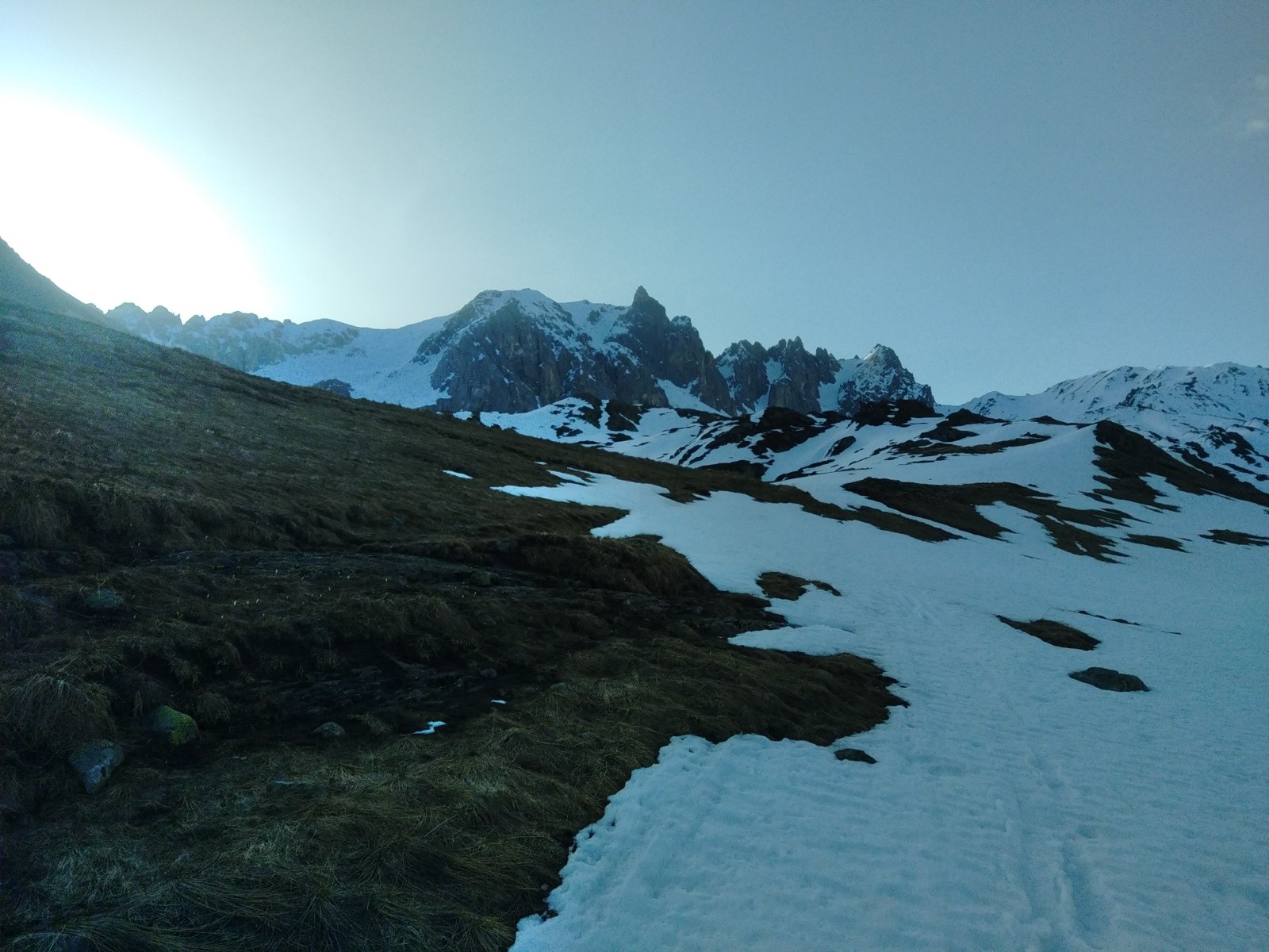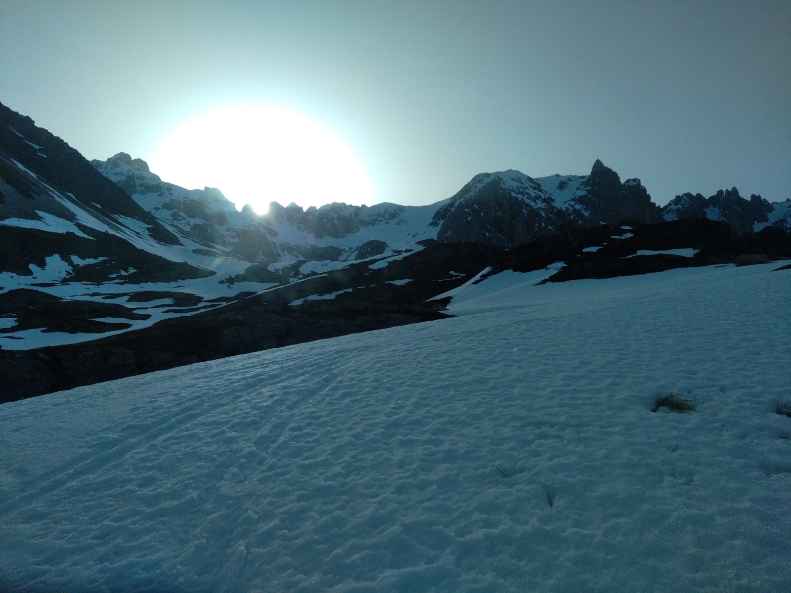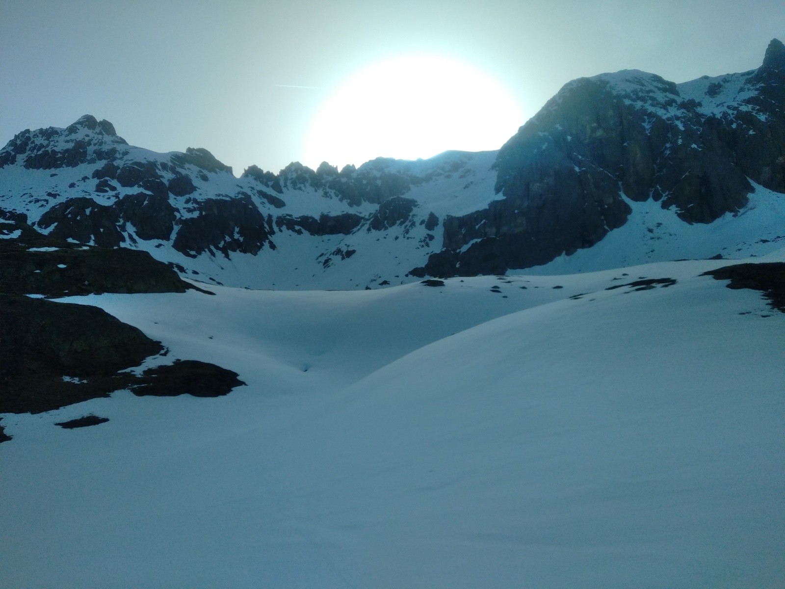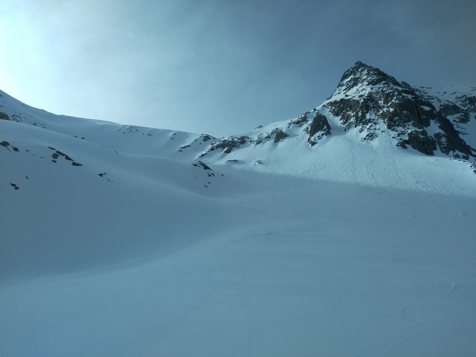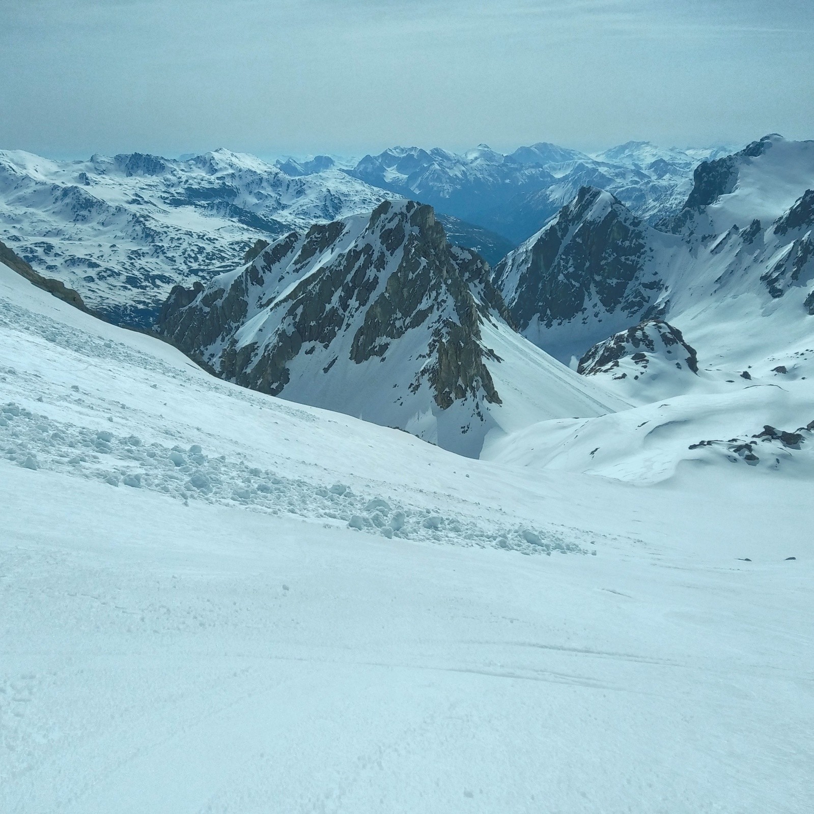 Mouliniere à partir du Col des Beraudes..et descendre le couloir Nord de la mouliniere...mais ce couloir est ravagé par les coulées et les pierres et la partie sud a une énorme corniche qui surplombe le couloir...pas de regret.