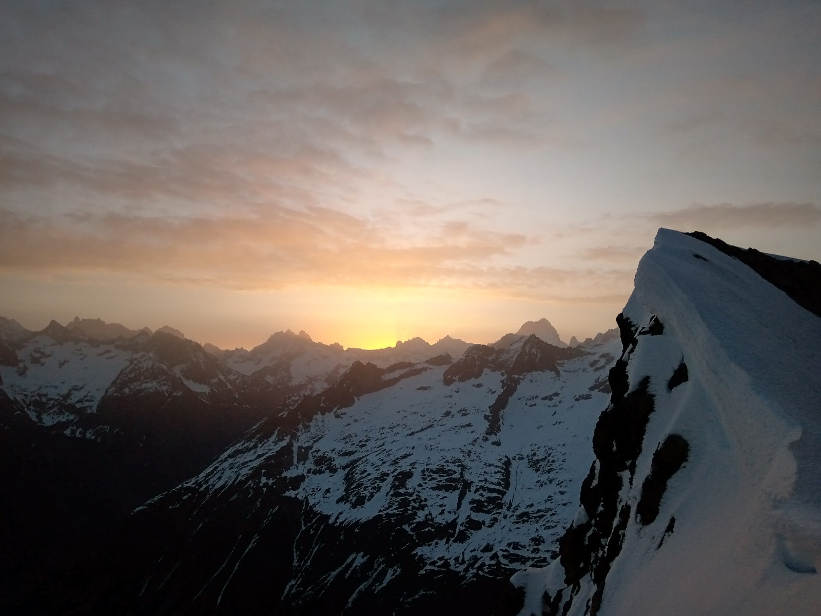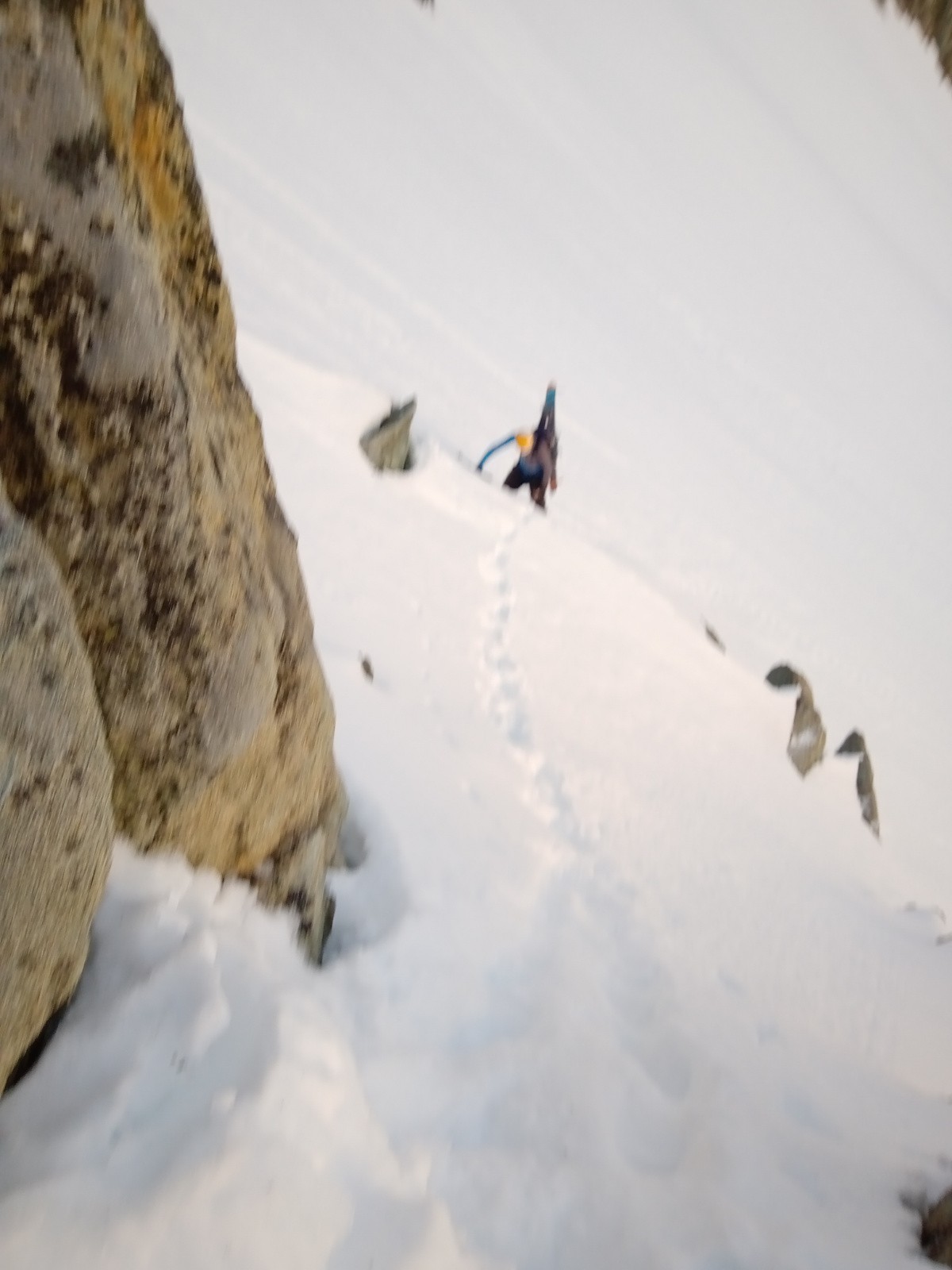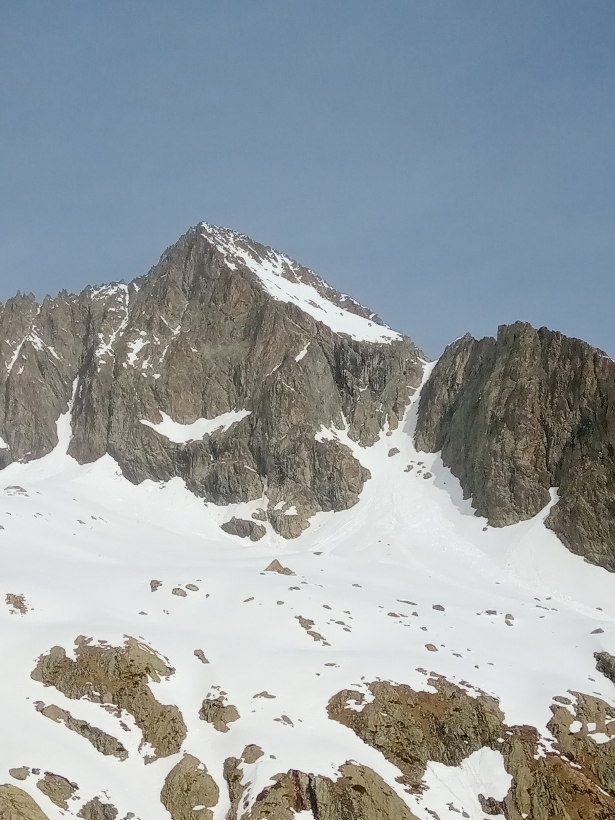 Heureusement à l'Oratoire il refait un lacet et je passe devant, à mon rythme, lui-même avouera qu'il était bien content de ce nouveau rythme. On avait prévu 2h pour arriver au refuge, "hey on a mit 1h09 pour arriver", voici donc enfin nos premiers mots échangés aux abords du refuge. On continu, on perd un peu le chemin puis le retrouve, on se mouille les chaussettes dans le mauvais regel et on décide de maniper, les skis repasseront plusieurs fois à l'épaule, nous assurant le doux plaisir des lowtech dans les omoplates, on traîne la patte, on souffre, on avance pas, on regarde la carte à chaque dos de baleine pour trouver où passer sans trop galérer. Enfin le lac, malgré la bise descendante il fait toujours doux, on est vaseux, on est fatigué en fait, et cela depuis le premier pas, ça va mal ! On se dit qu'on est vachement en avance quand même. Mais notre rythme diminuant inexorablement avec notre avancée on parvient enfin au sommet à peu près dans le timing envisagé. L'un comme l'autre on aura titubé dans la pente finale, comme deux mourants donnant leurs dernières forces dans le ressaut Hillary, une fatigue, mais une fatigue...!