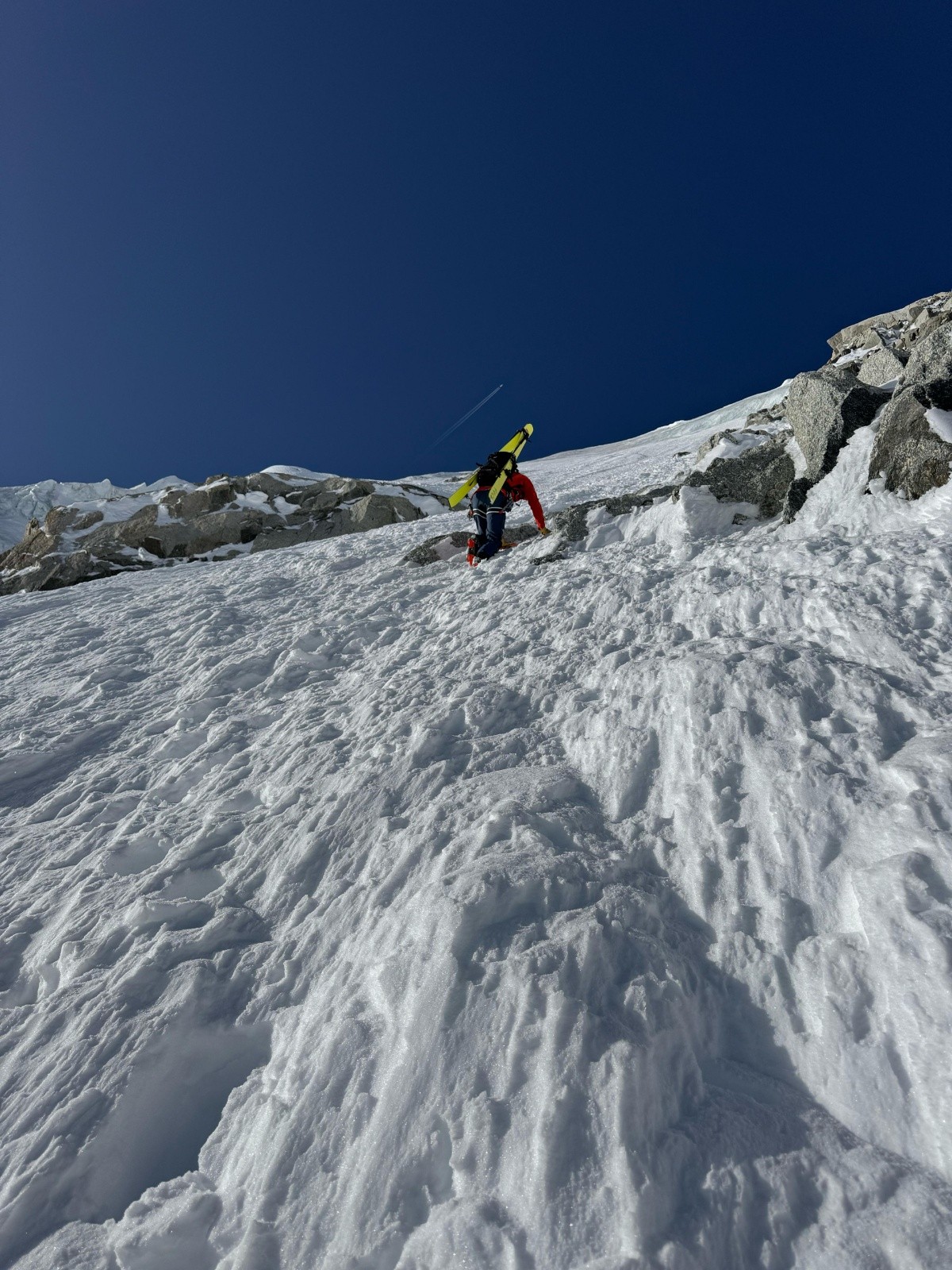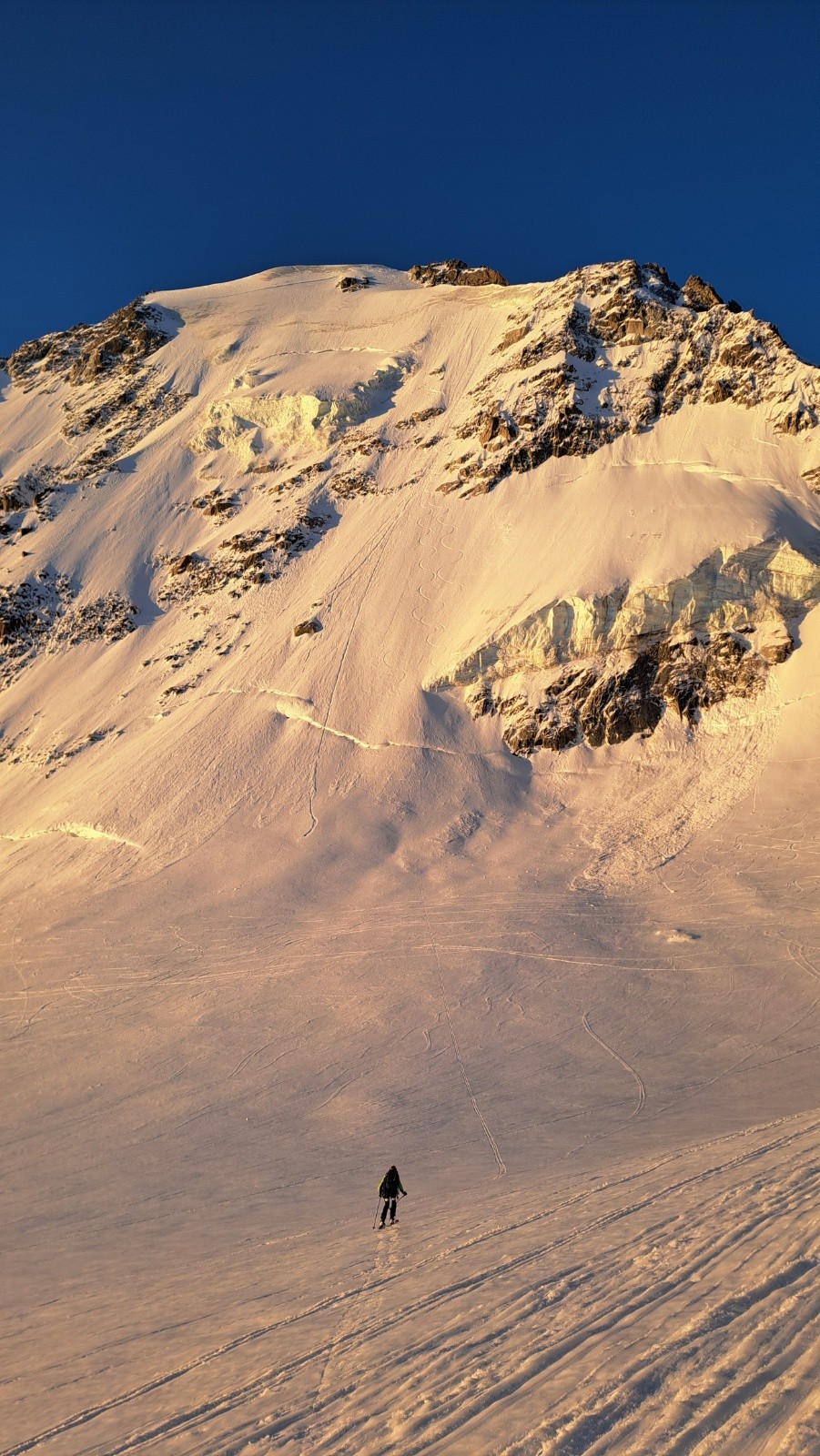 Petite nuit à l'envers des Dorées après avoir monter le col du Chardonnet plein caniar à 16h, on s'acclimate pour l'été ! Départ de la cabane à 5h30 avec l'idée de skier la face Nord d'Argentiere. Pleins de confiance vu qu'on a vu 2 traces dedans la veille en montant au refuge (nous apprendrons plus tard que ces traces appartiennent à Benjamin Vedrines et Nicolas Jean, ce qui explique pourquoi elles se perdent dans des sections mixtes à 58° avec neige croutée en haut de la face dans que ça n'ai semblé être un problème 😅).