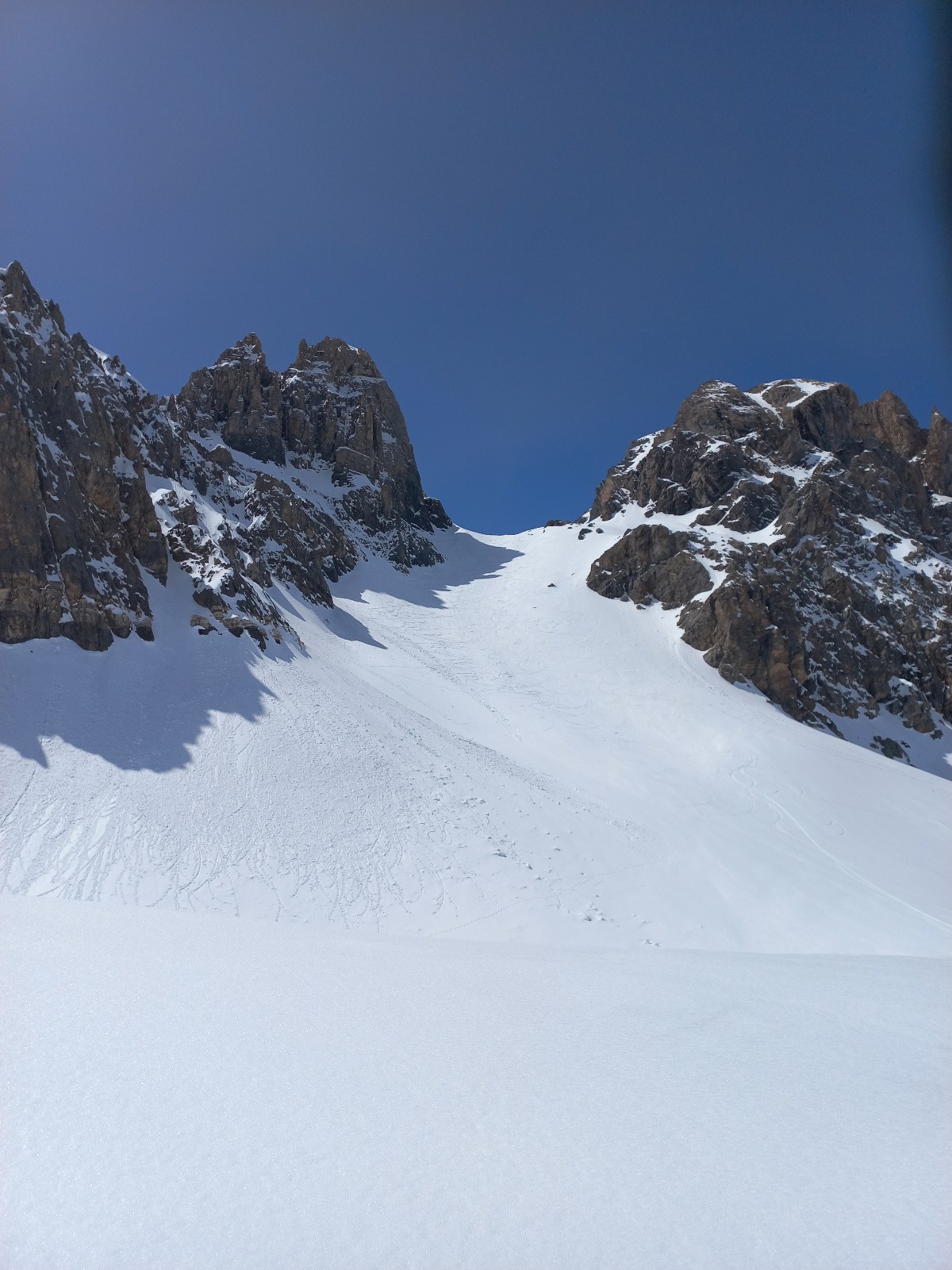 Conditions nivo et activité avalancheuse : à 12h30 à 2300 m neige humidifiée en profondeur, on a fait partir une petite coulée en traversant une pente