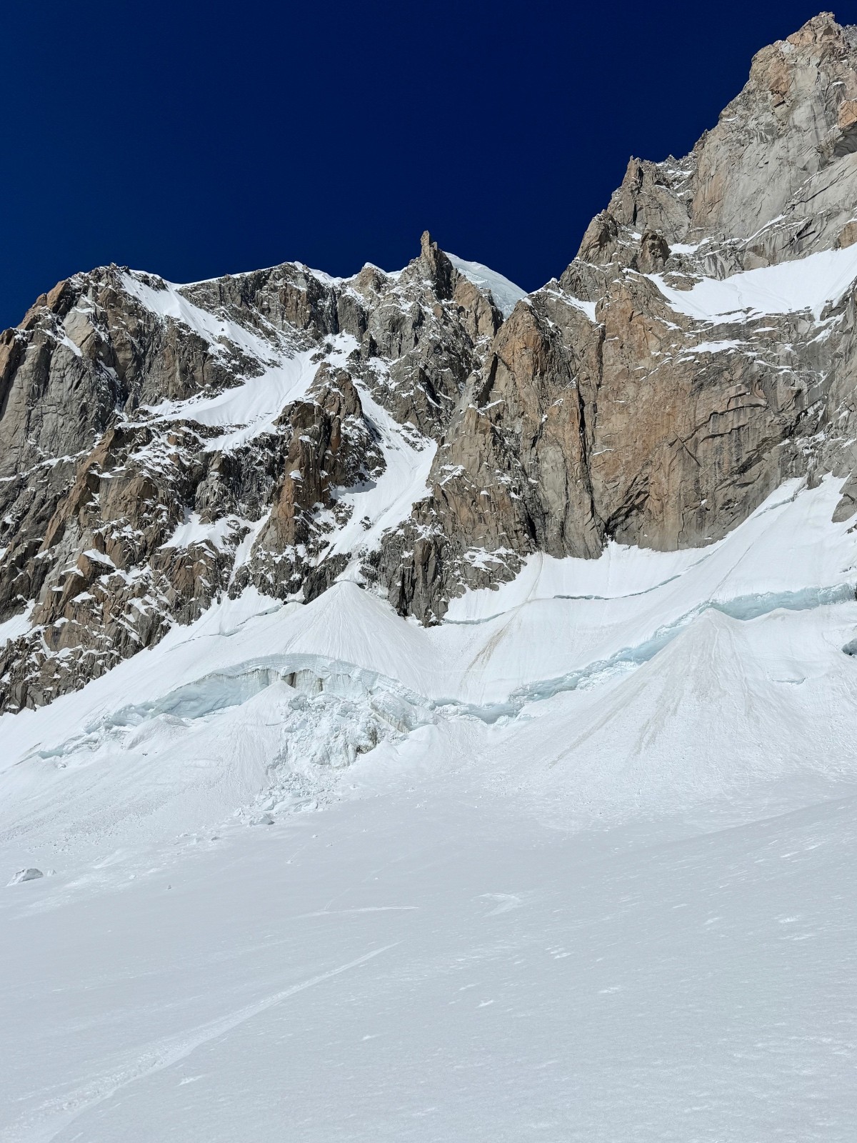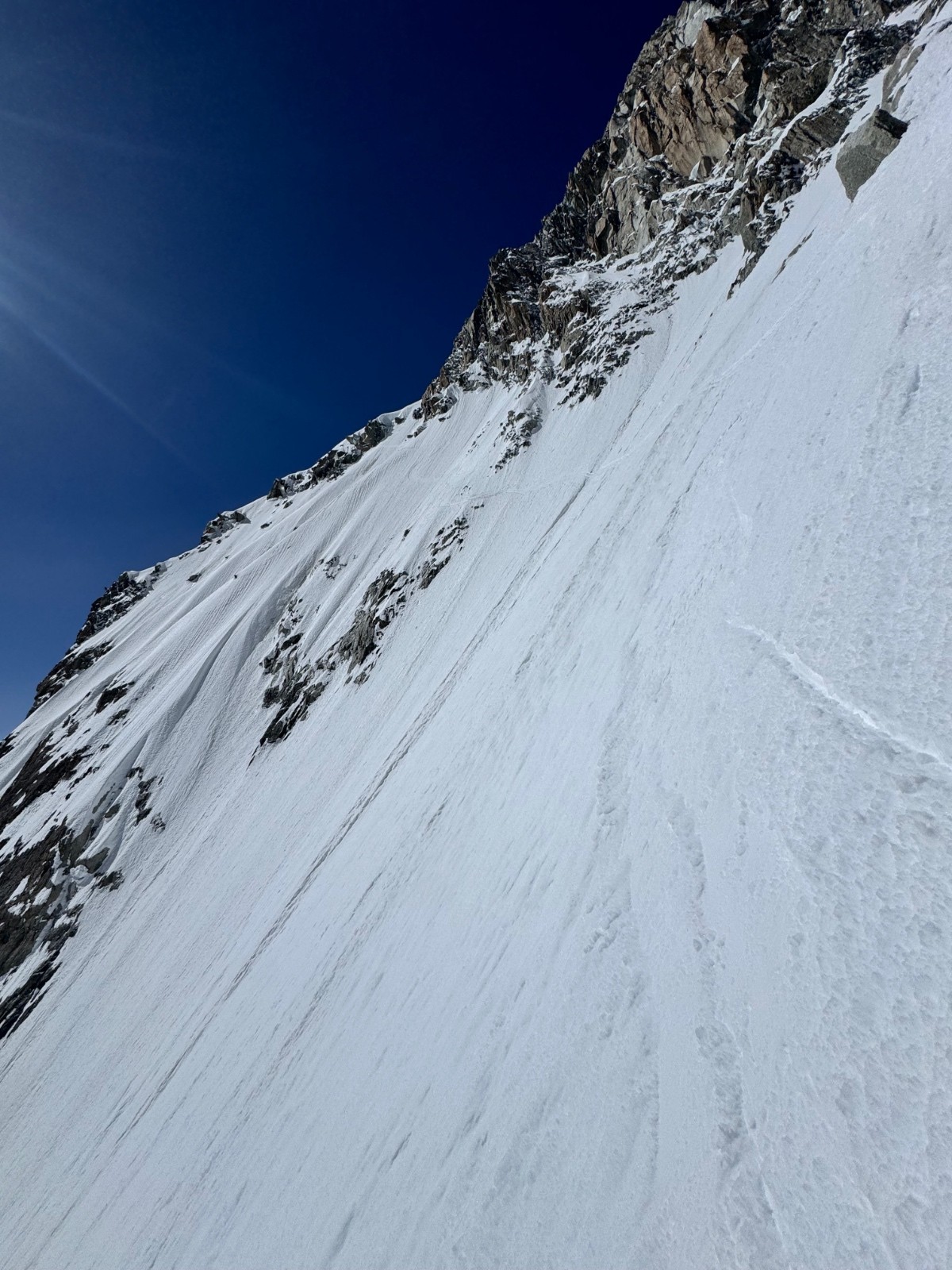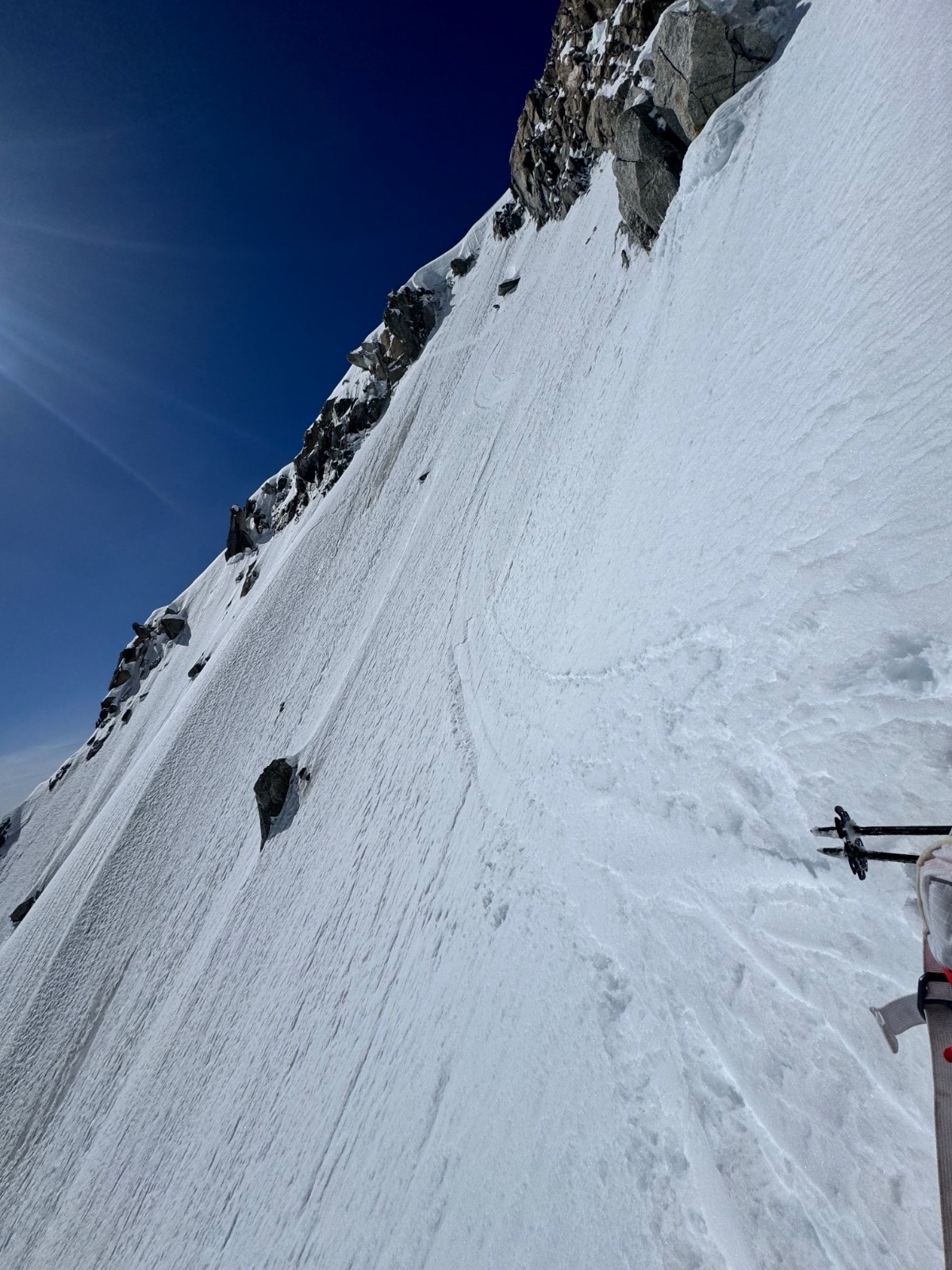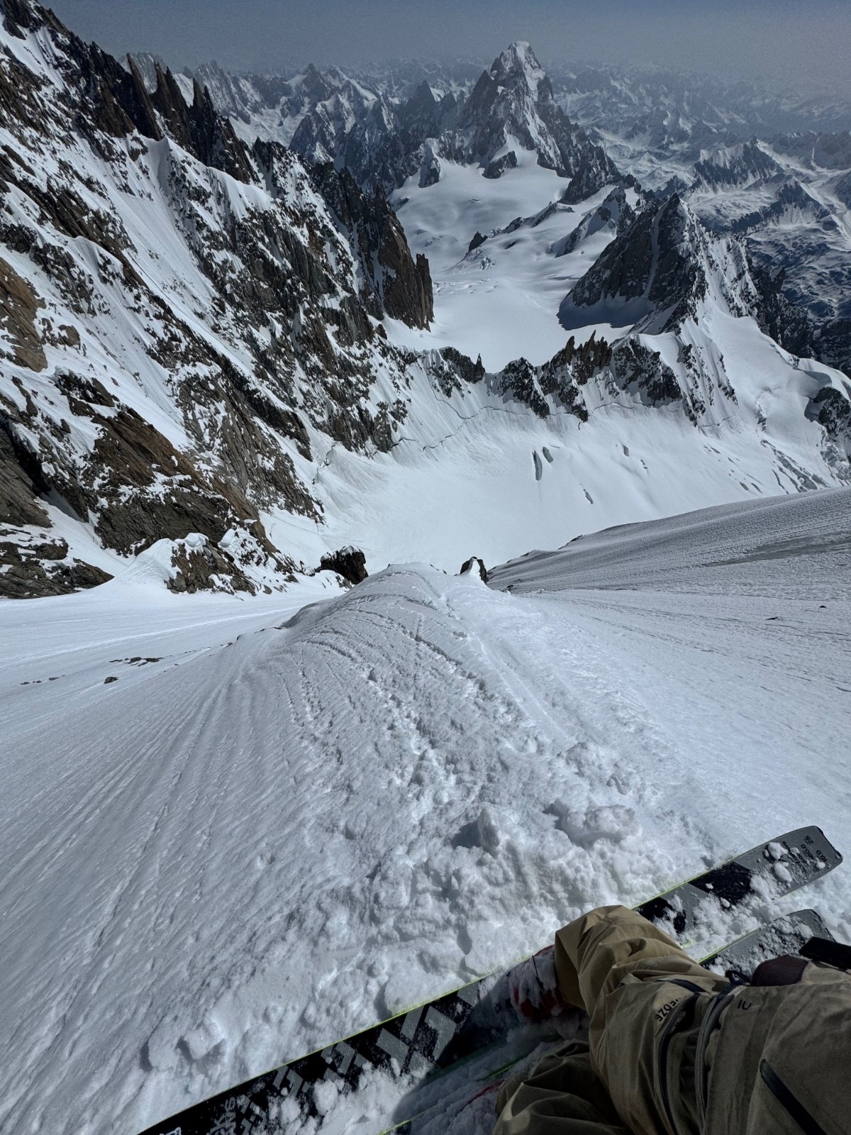 En 2h20 me voilà devant le mur de la côte, au sommet de la ligne. Les conditions sont folles, freeride toute la ligne entre moquette et poudre, les meilleures conditions de toutes les récentes lignes. Le bas par contre présente la classique goulotte que je ne peux me permettre de bricoler en ski, ça commence à tout canaliser dedans. Je me demerde pour sortir de là puis voilà la petite nouvelle du jour, les rimayes qui se sont effondrées, abaissées depuis 5jours. Immense est le mot, 30m de haut sous le cône, je cherche et file vers un cône d’éjection plus à gauche sous la kuffner. Un saut de 4-5m béton puis un arrachage de cuisses dans le degommé 😅 et me voilà seul tout sur l’un des pires glaciers qui soit, heureusement cette partie haute est la seule viable. Remontée vers les pentes d’entrée de la Kuffner et retour Cirque Maudit, Vallée Blanche. Magique enchaînement, vivement le prochain craineau et sur ce je vais me reposer