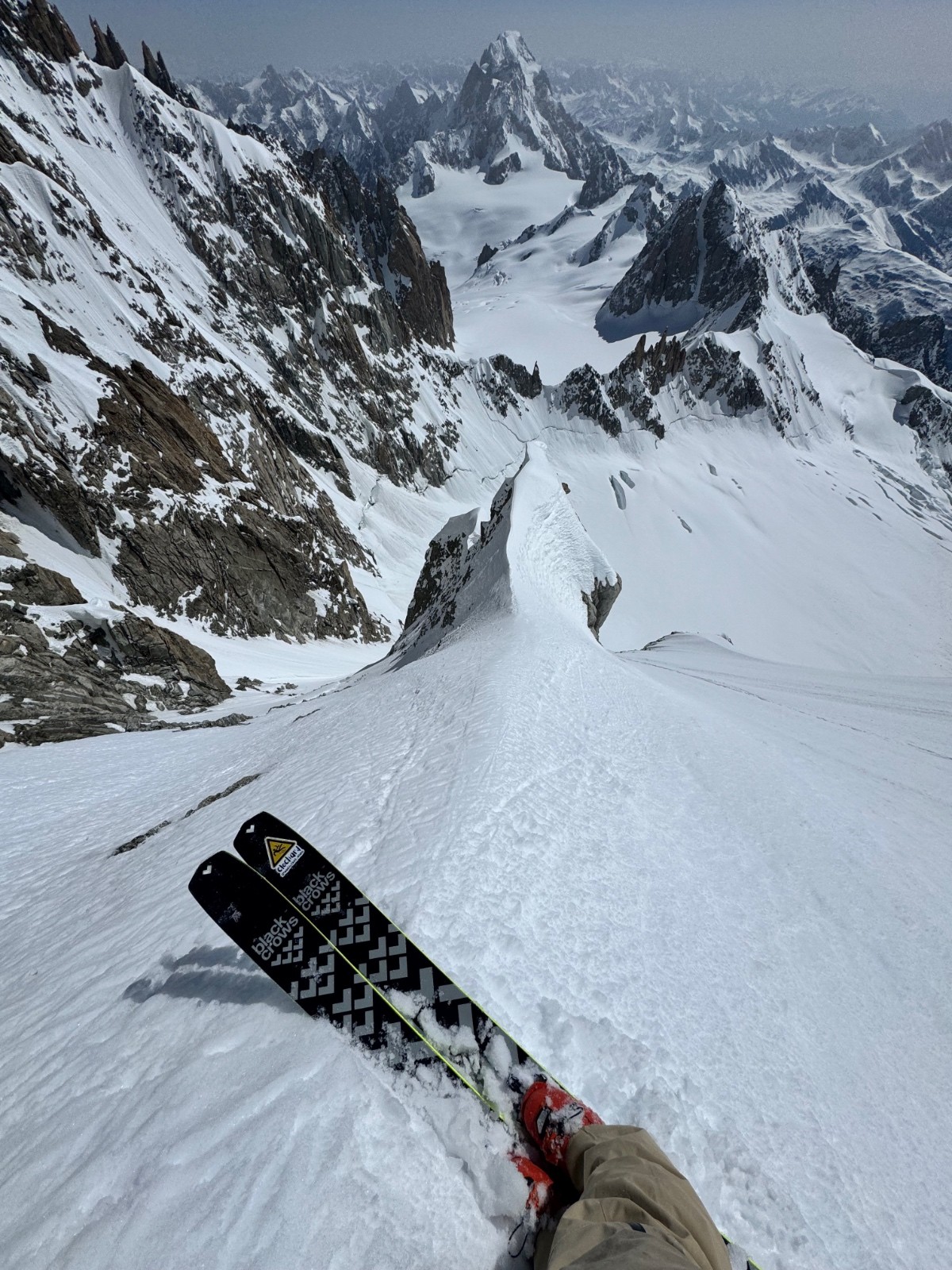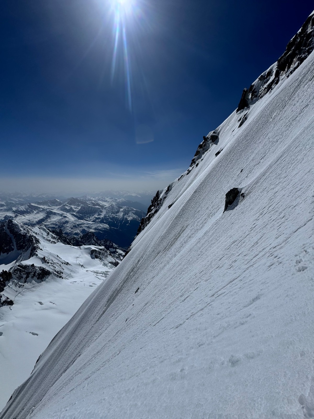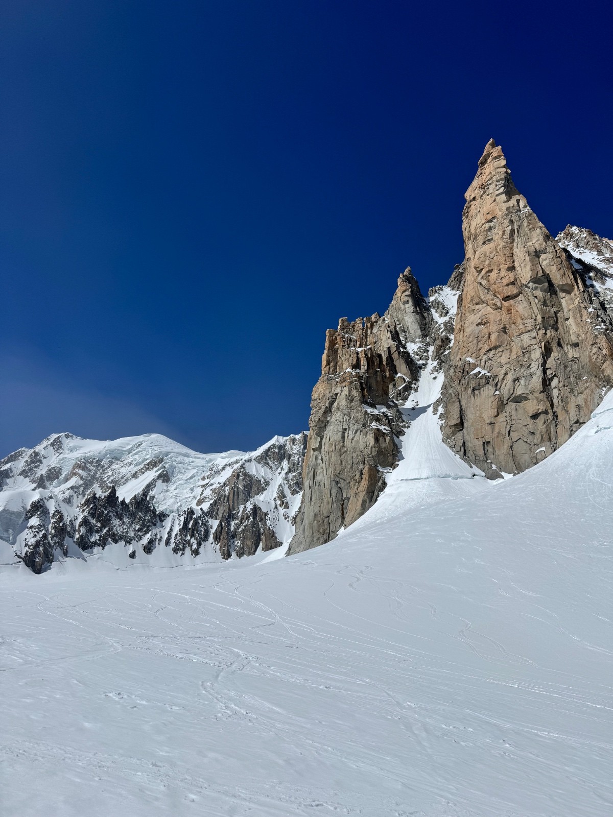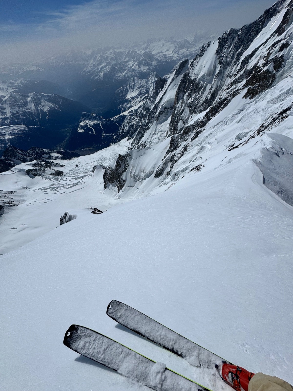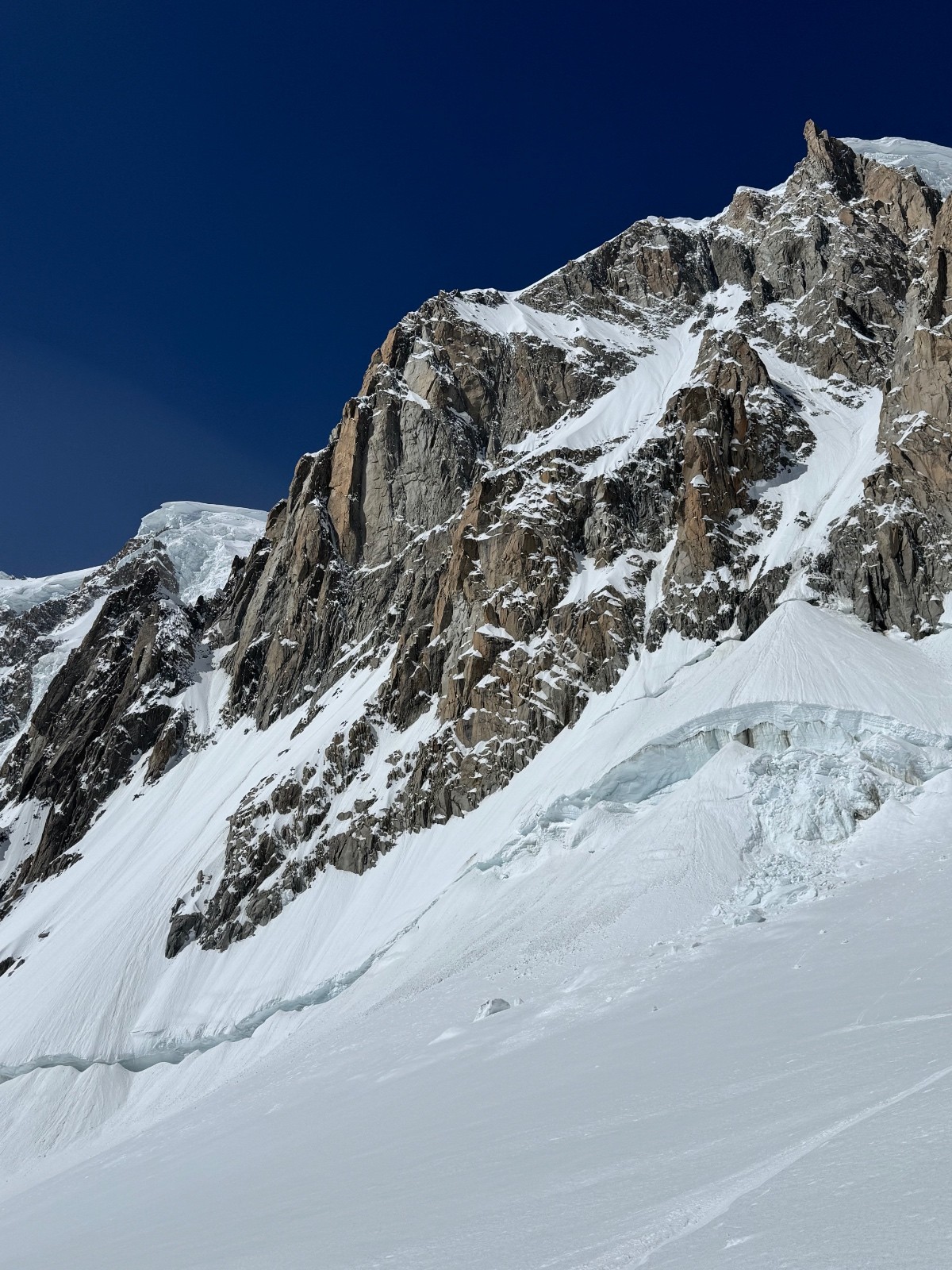 En 2h20 me voilà devant le mur de la côte, au sommet de la ligne. Les conditions sont folles, freeride toute la ligne entre moquette et poudre, les meilleures conditions de toutes les récentes lignes. Le bas par contre présente la classique goulotte que je ne peux me permettre de bricoler en ski, ça commence à tout canaliser dedans. Je me demerde pour sortir de là puis voilà la petite nouvelle du jour, les rimayes qui se sont effondrées, abaissées depuis 5jours. Immense est le mot, 30m de haut sous le cône, je cherche et file vers un cône d’éjection plus à gauche sous la kuffner. Un saut de 4-5m béton puis un arrachage de cuisses dans le degommé 😅 et me voilà seul tout sur l’un des pires glaciers qui soit, heureusement cette partie haute est la seule viable. Remontée vers les pentes d’entrée de la Kuffner et retour Cirque Maudit, Vallée Blanche. Magique enchaînement, vivement le prochain craineau et sur ce je vais me reposer