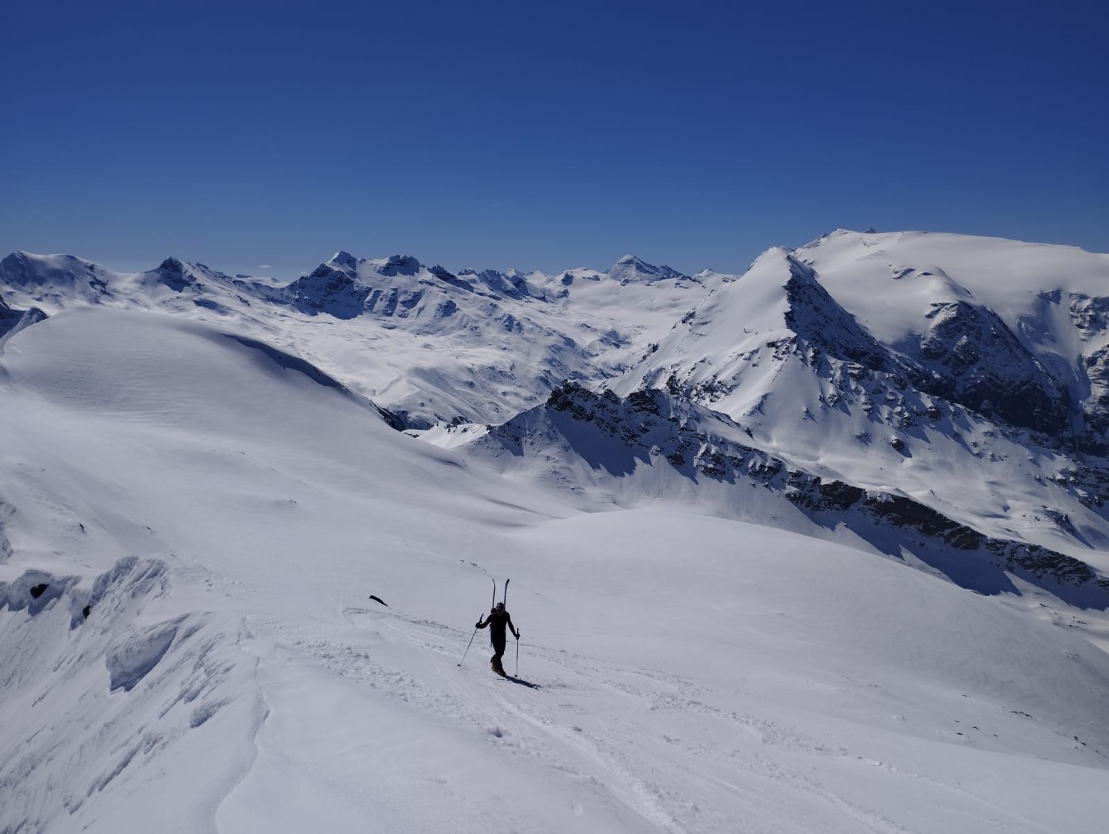 Conditions pour le ski : Neige de printemps lisse avec un regel correct revenu à point vers midi, devant lourde sur le bas