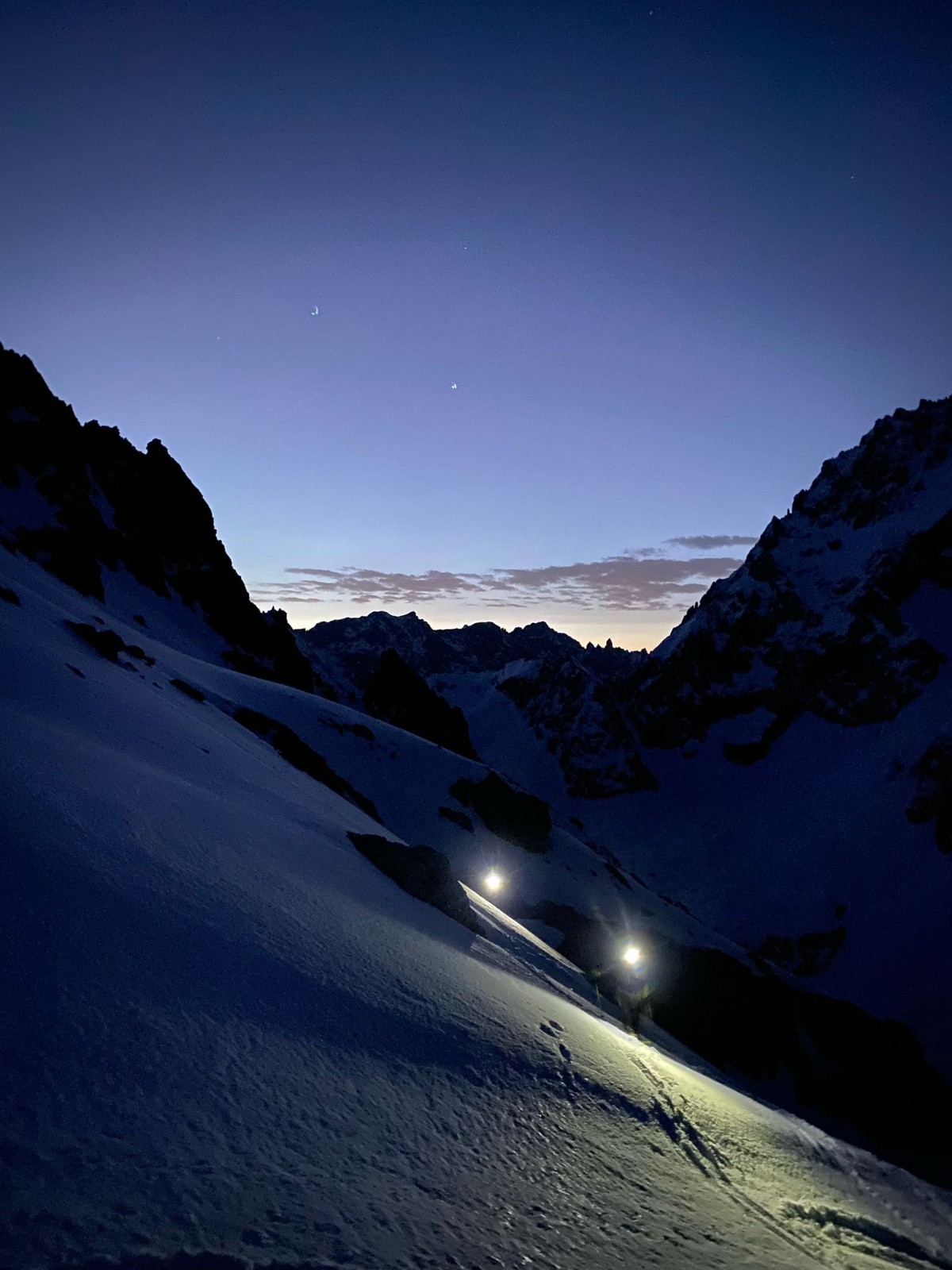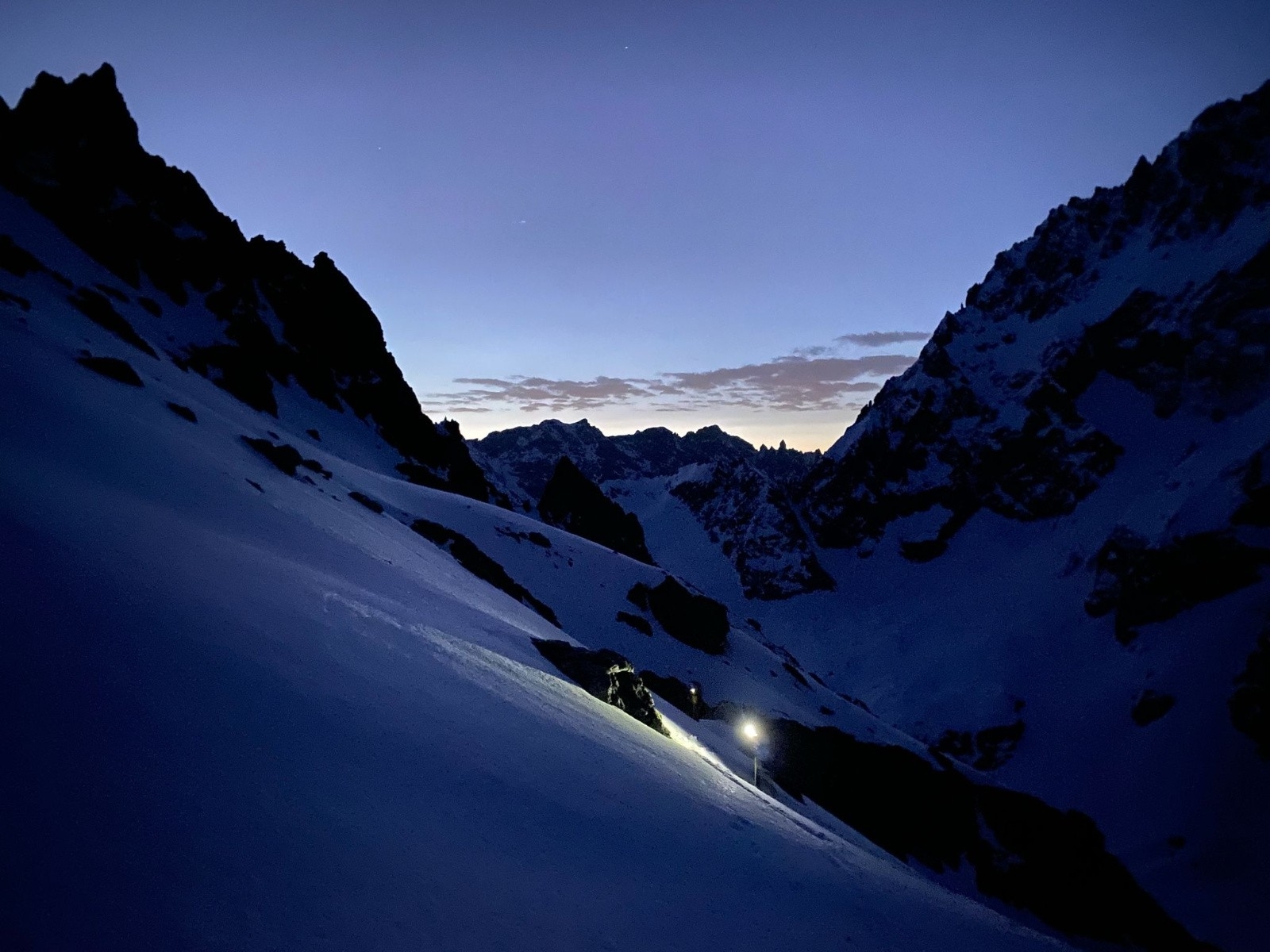 Premier tronçon du Glacier noir, verrou glacier, plateau supérieur. Le rythme est encore bon mais je me sens un peu fatiguée. Sur le plateau supérieur on éteint tous les frontales et on admire les silhouettes des montagnes géantes qui nous entourent, projetés sur la voie lactée.