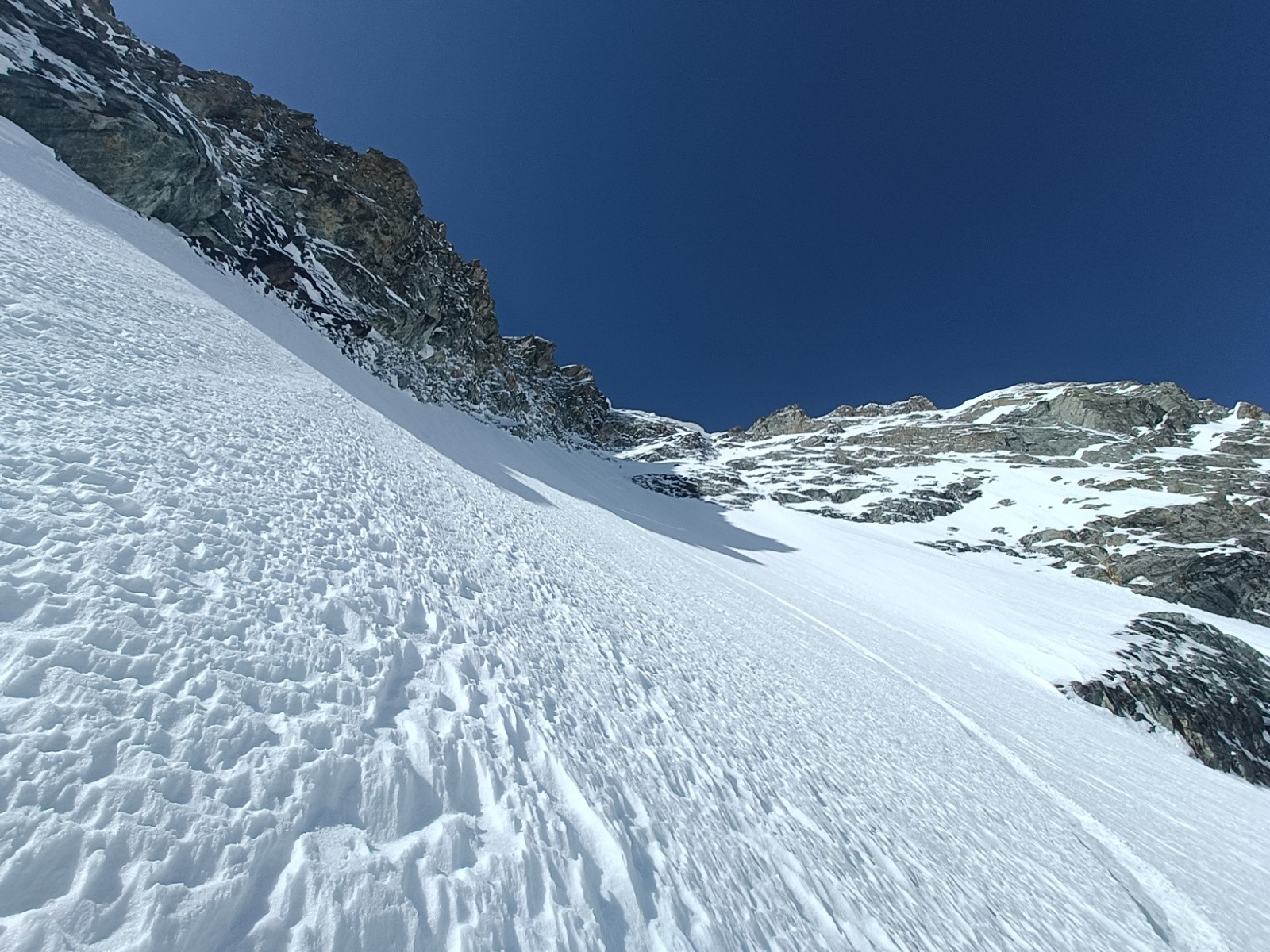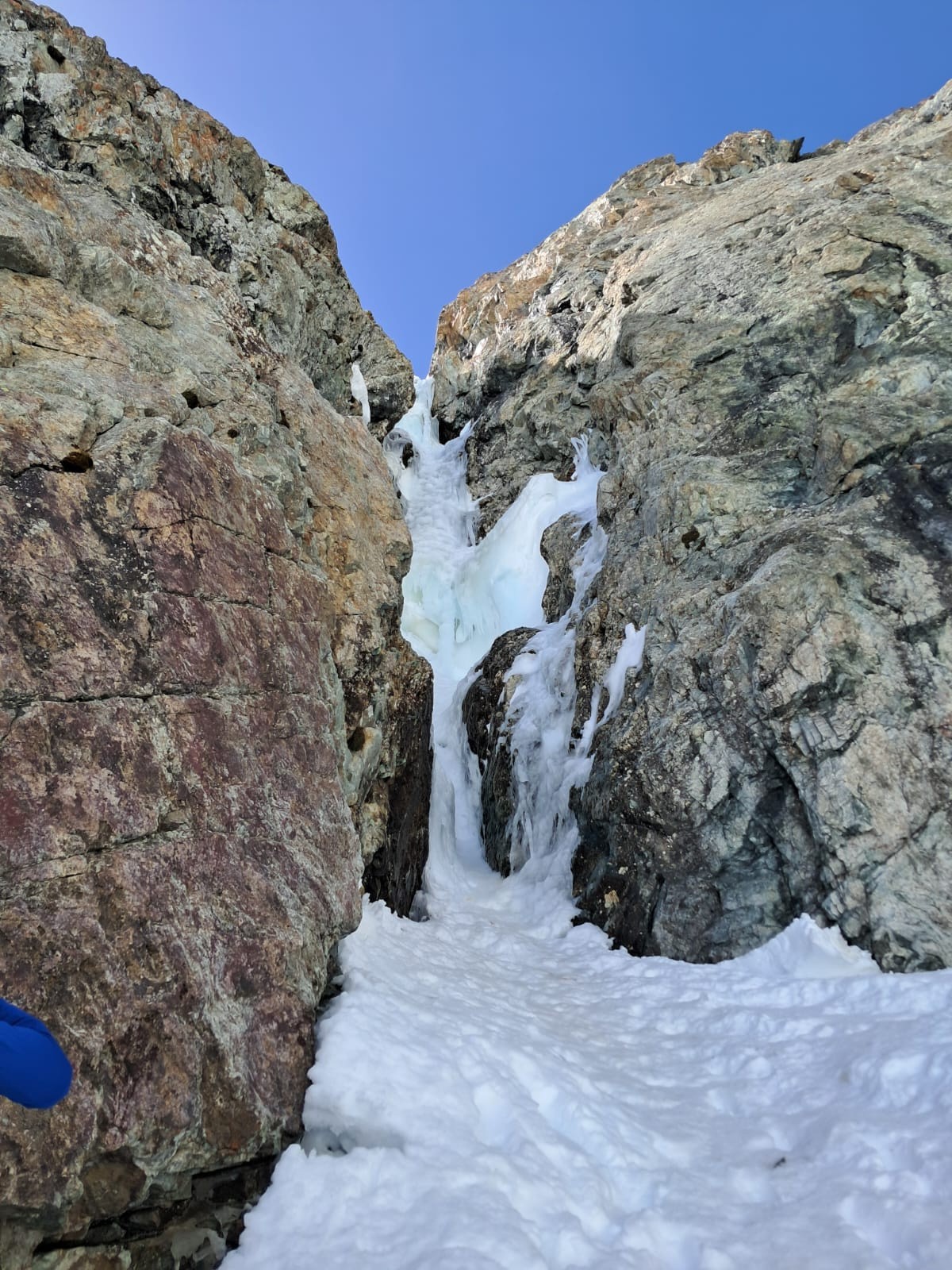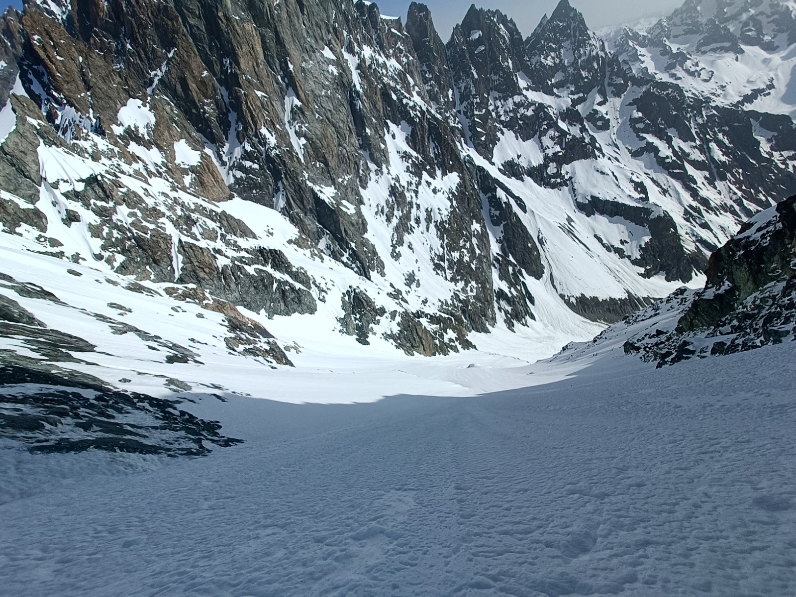 Le couloir est bien gelé, mes crampons tiennent mal sur les boots de snowboard donc ça fait un tout petit peu flipper.