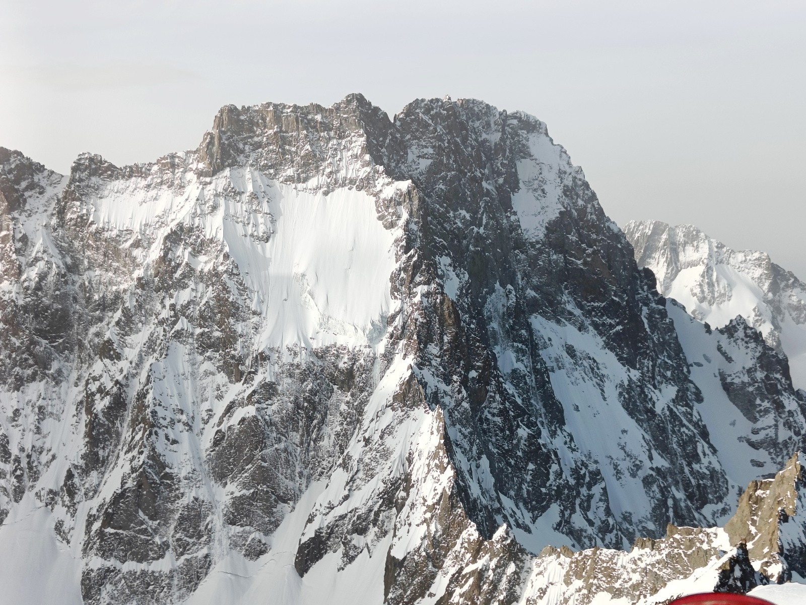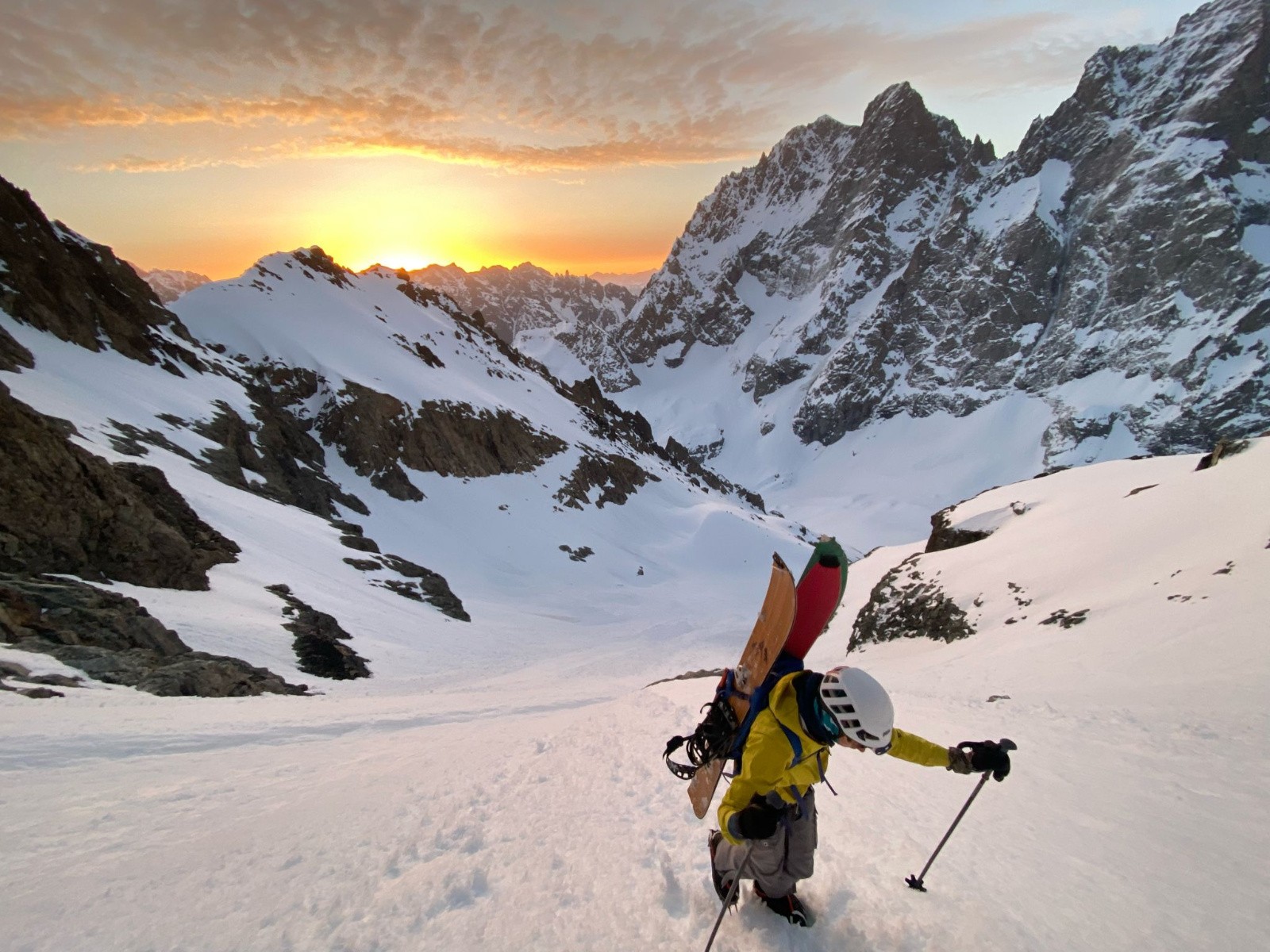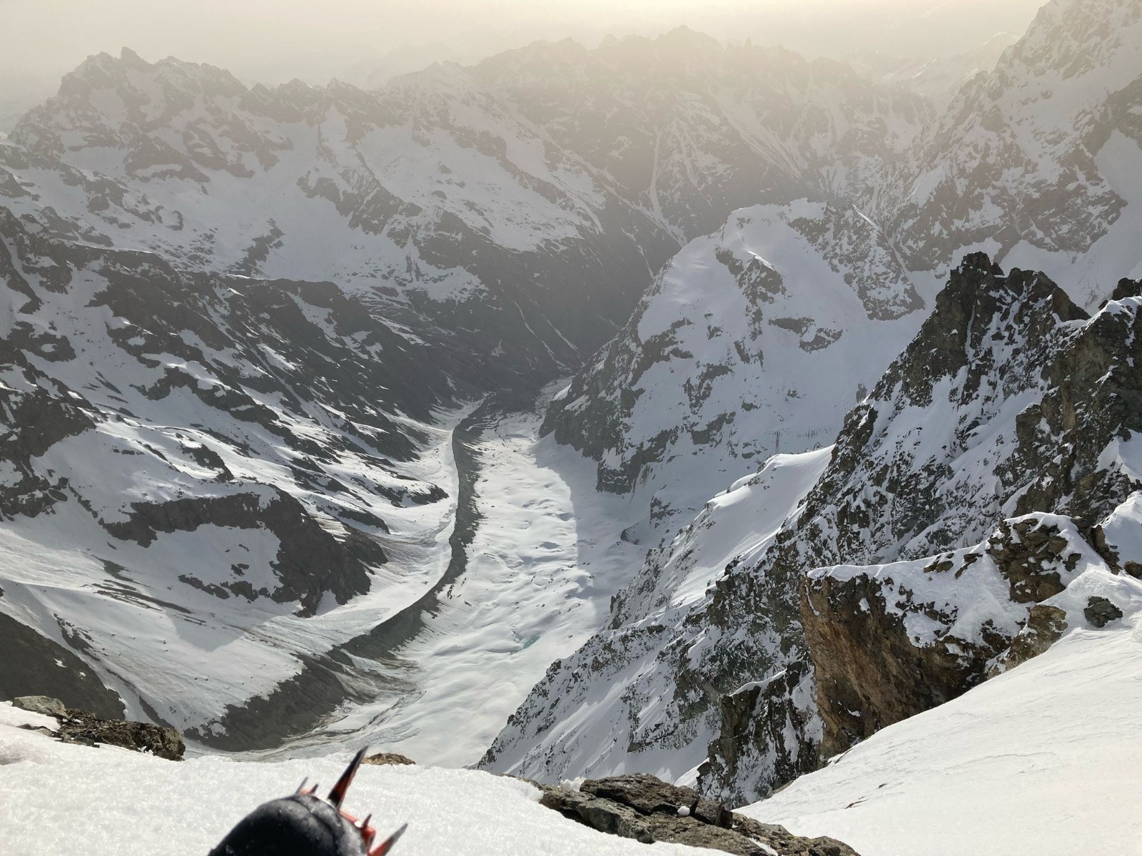 Le couloir est bien gelé, mes crampons tiennent mal sur les boots de snowboard donc ça fait un tout petit peu flipper.