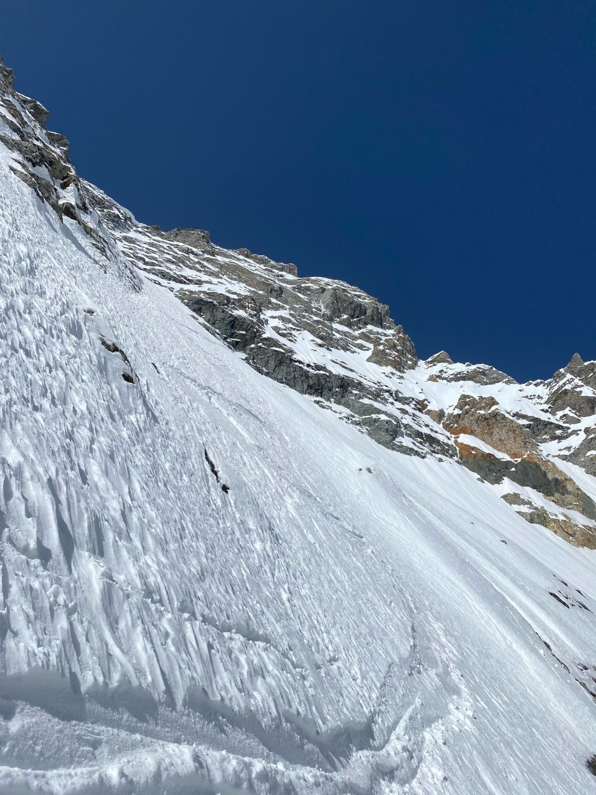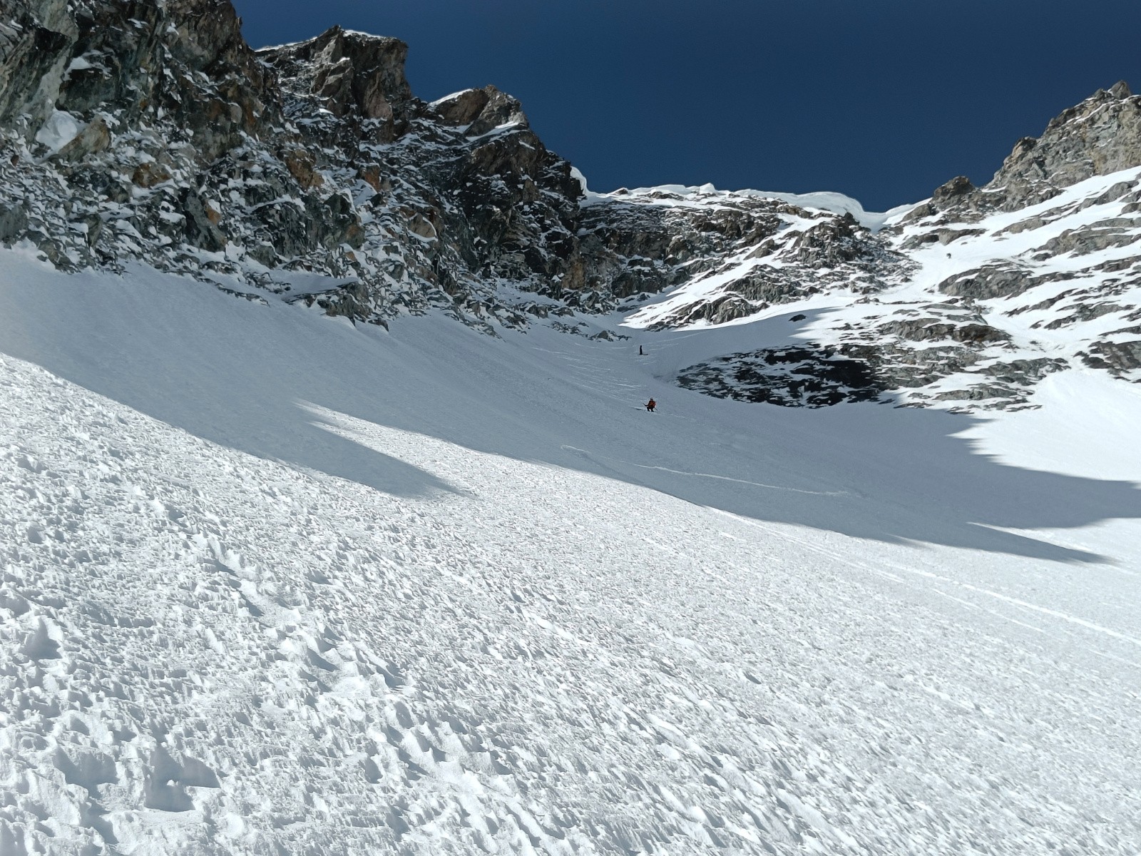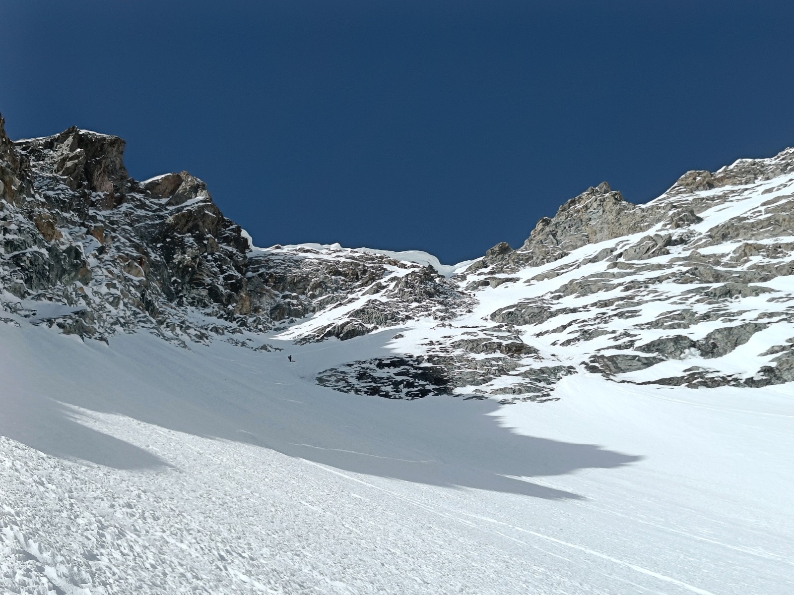Le haut de cette rampe, elle est en poudreuse miraculeusement conservé. C'est un régal inatendu. Après environ une heure de descente technique mêlant virages sautés, traversées expos et rappels on peut tout relâcher et ça part en grande courbes. C'est merveilleux.