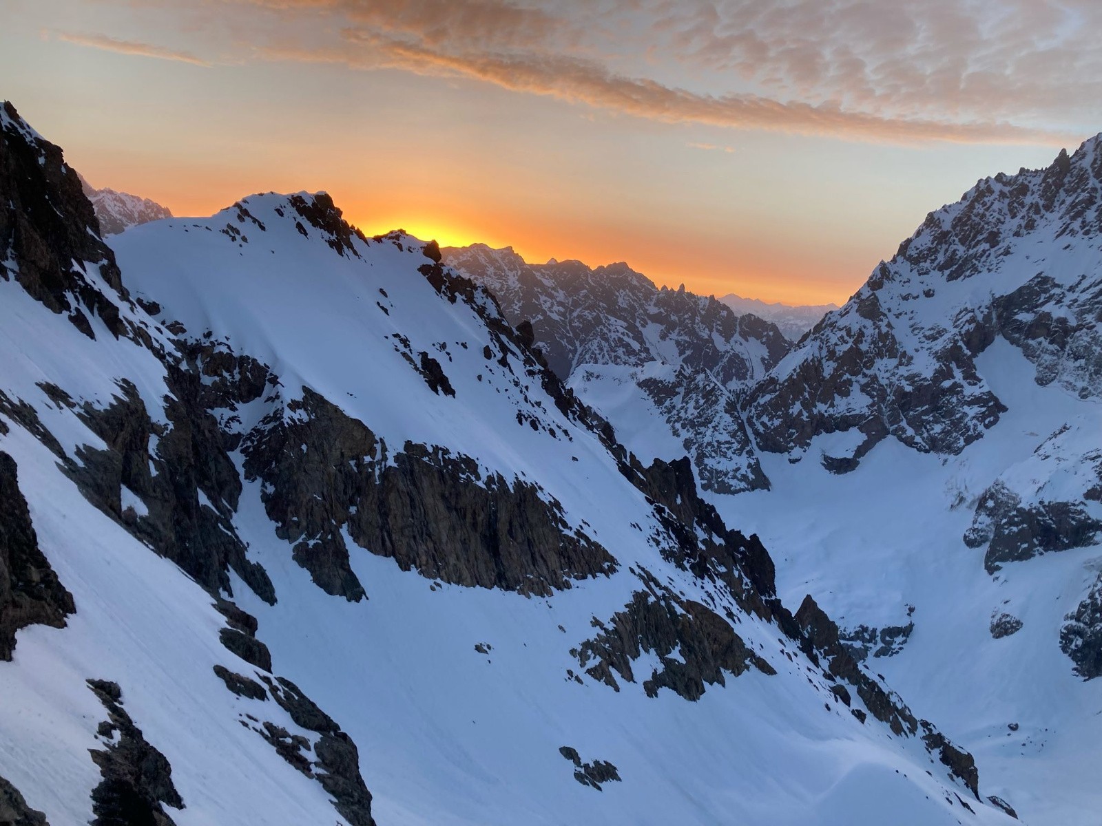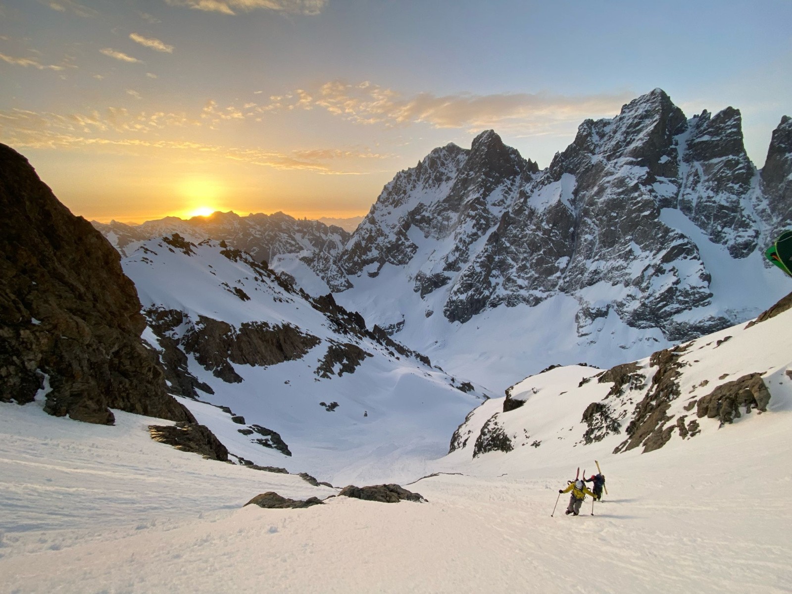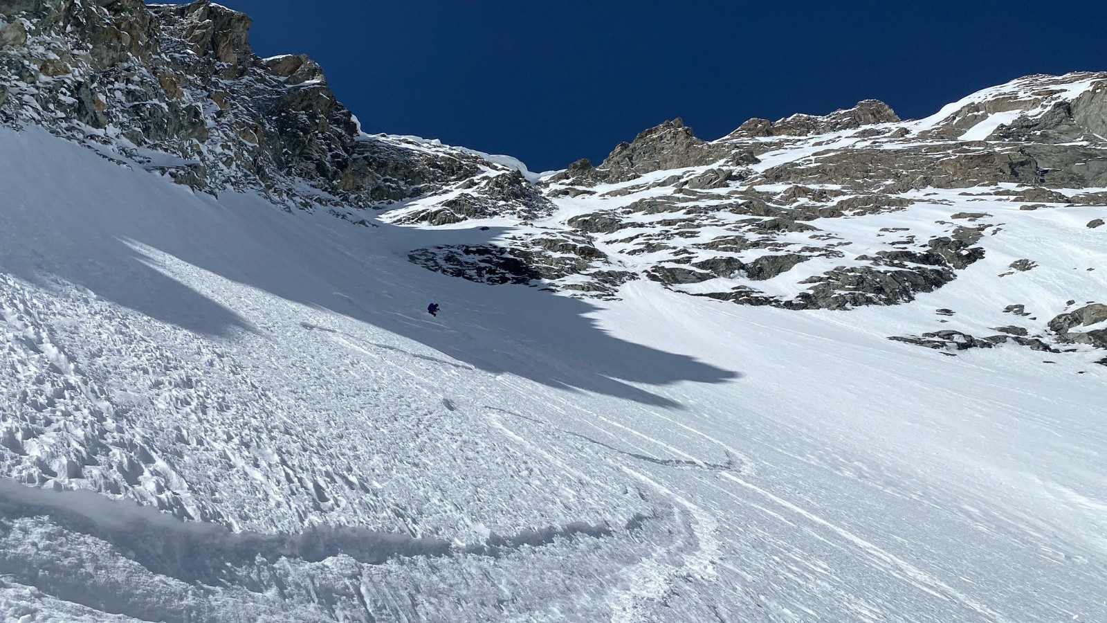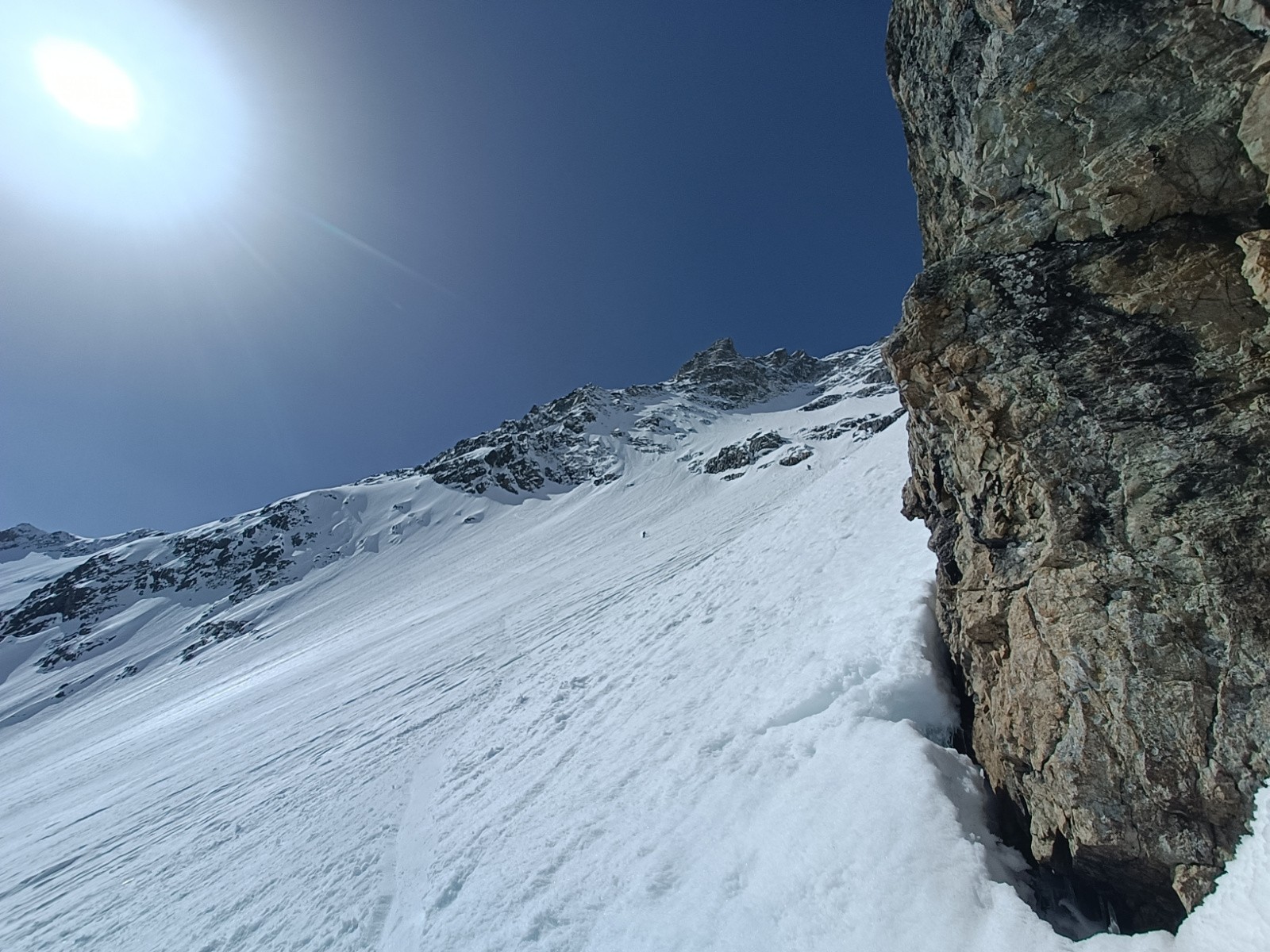 Le haut de cette rampe, elle est en poudreuse miraculeusement conservé. C'est un régal inatendu. Après environ une heure de descente technique mêlant virages sautés, traversées expos et rappels on peut tout relâcher et ça part en grande courbes. C'est merveilleux.