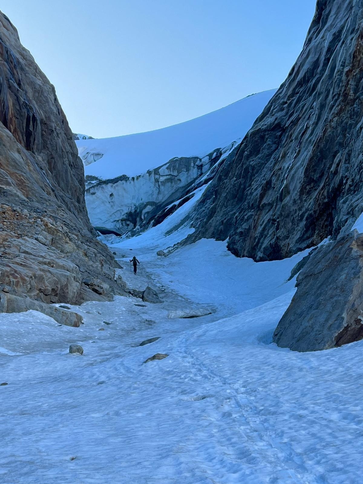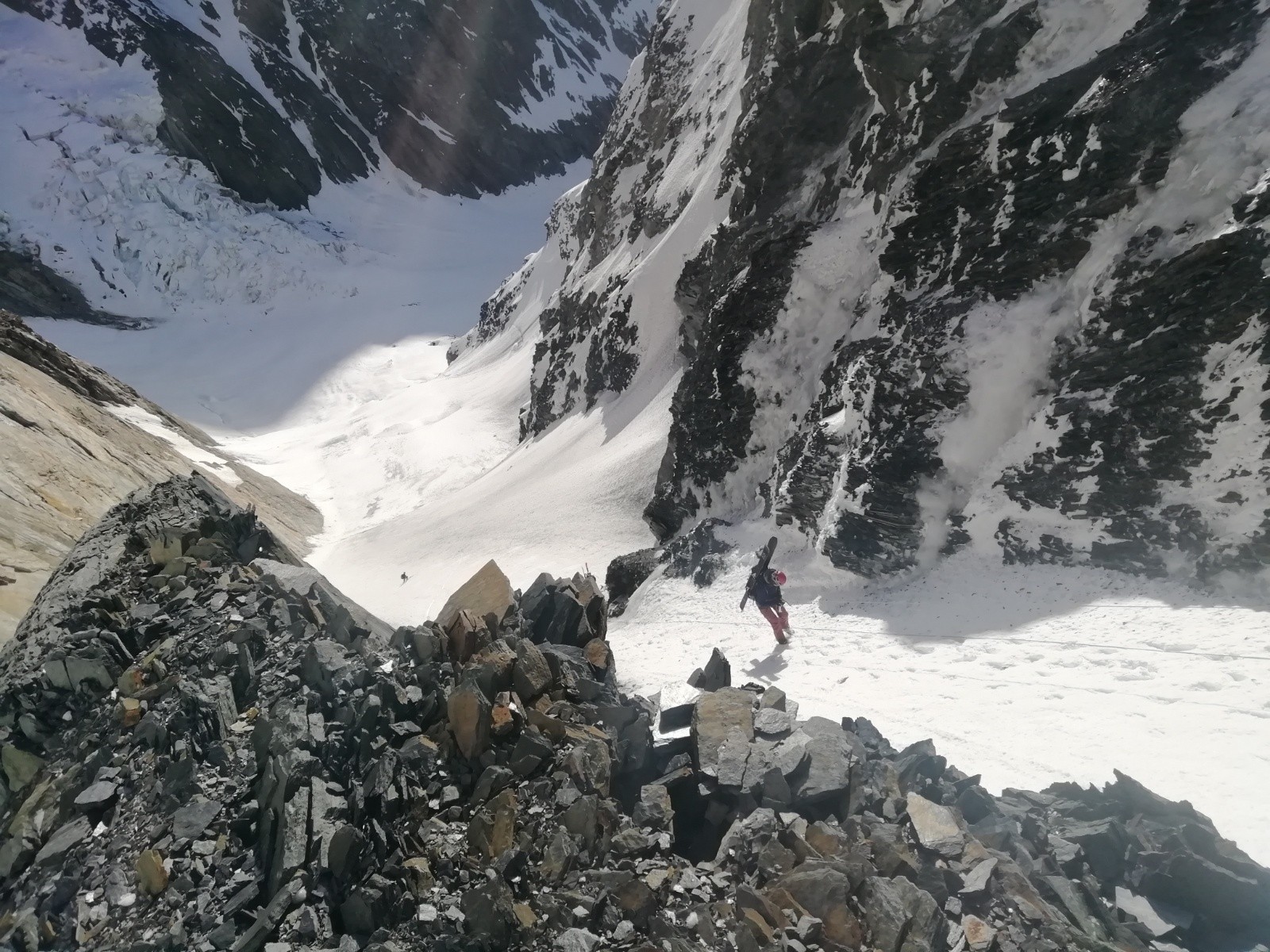 Pour la remontée à Durier, c'est facile en crampons, mais bien exposé au dessus d'une imposante barre rocheuse --> il faut bien gérer le timing! Heureusement le refuge de Durier permet de temporiser tout le temps nécessaire avant de redescendre côté français.