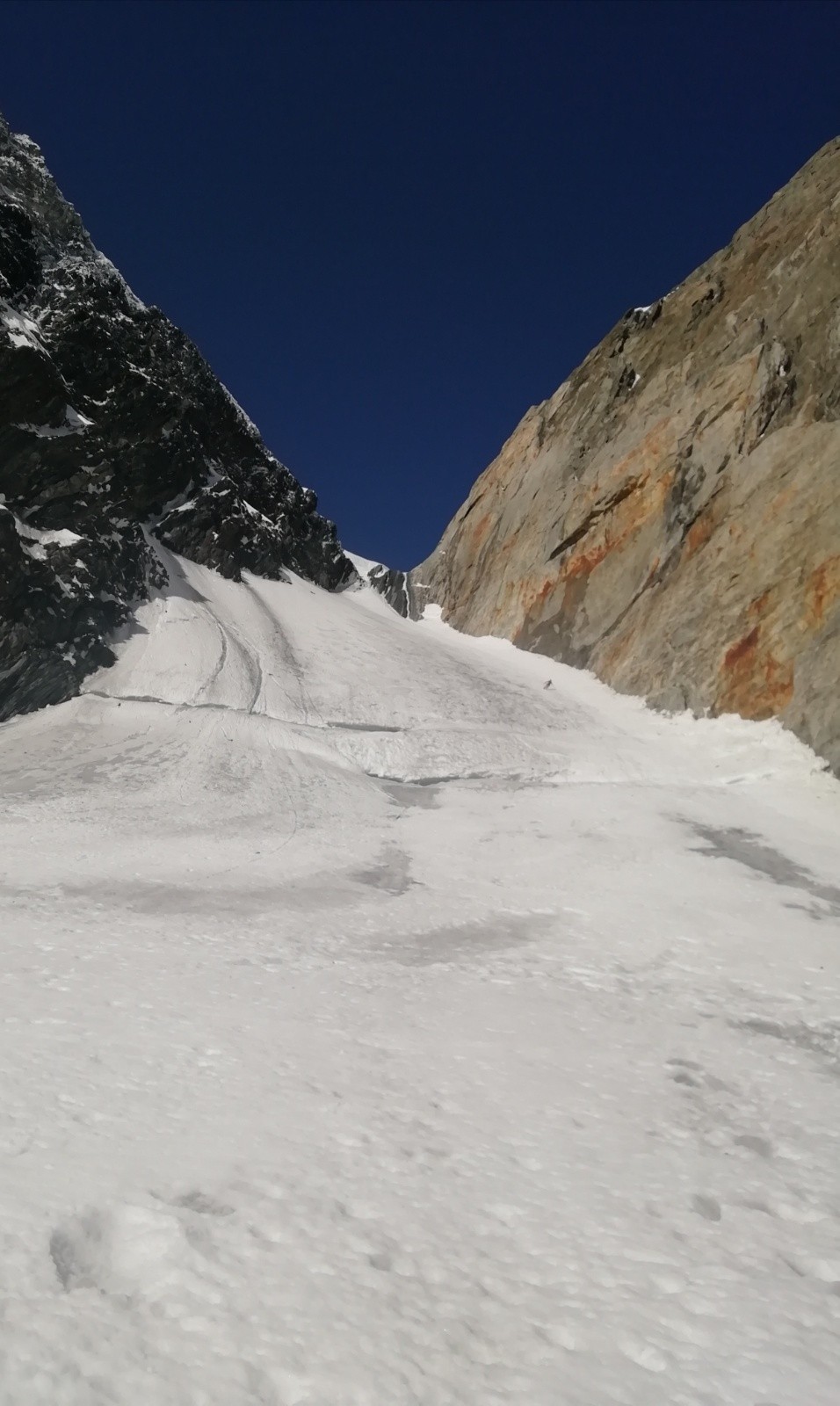 L'entrée du col (in)franchissable est splendide et skiable en rive gauche le long du sérac rabougri. Il y a ensuite un ressaut d'une dizaine de mètres en glace avec rappel obligatoire et pas évident à poser. Un champignon de glace nous a permis de mettre un abalakov, mais pas certain qu'il soit toujours là. Sinon le rocher est péteux et il faut envisager un abalakov sur le sérac, avec un 80m nécessaire dans ce cas. Ca skie très bien ensuite (40 degrés environ), et on se retrouve projetés dans le paradis du haut val Véni.