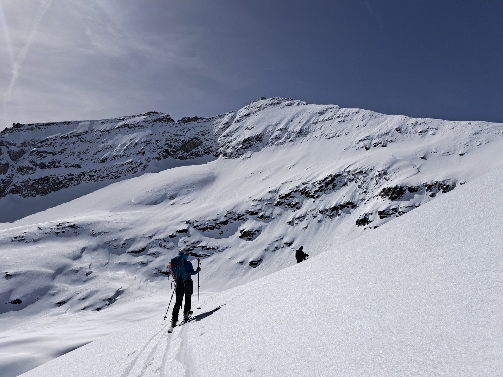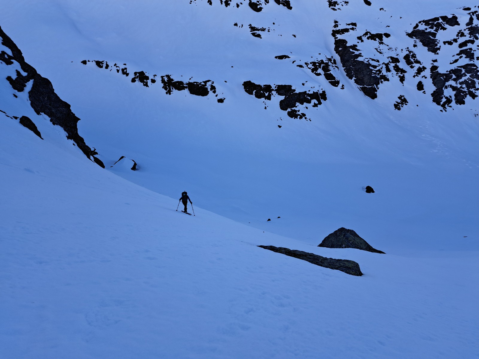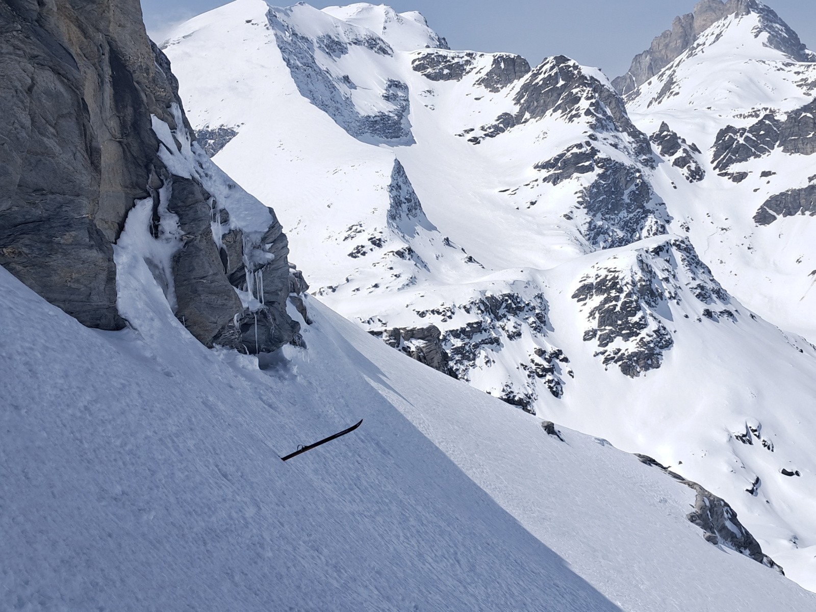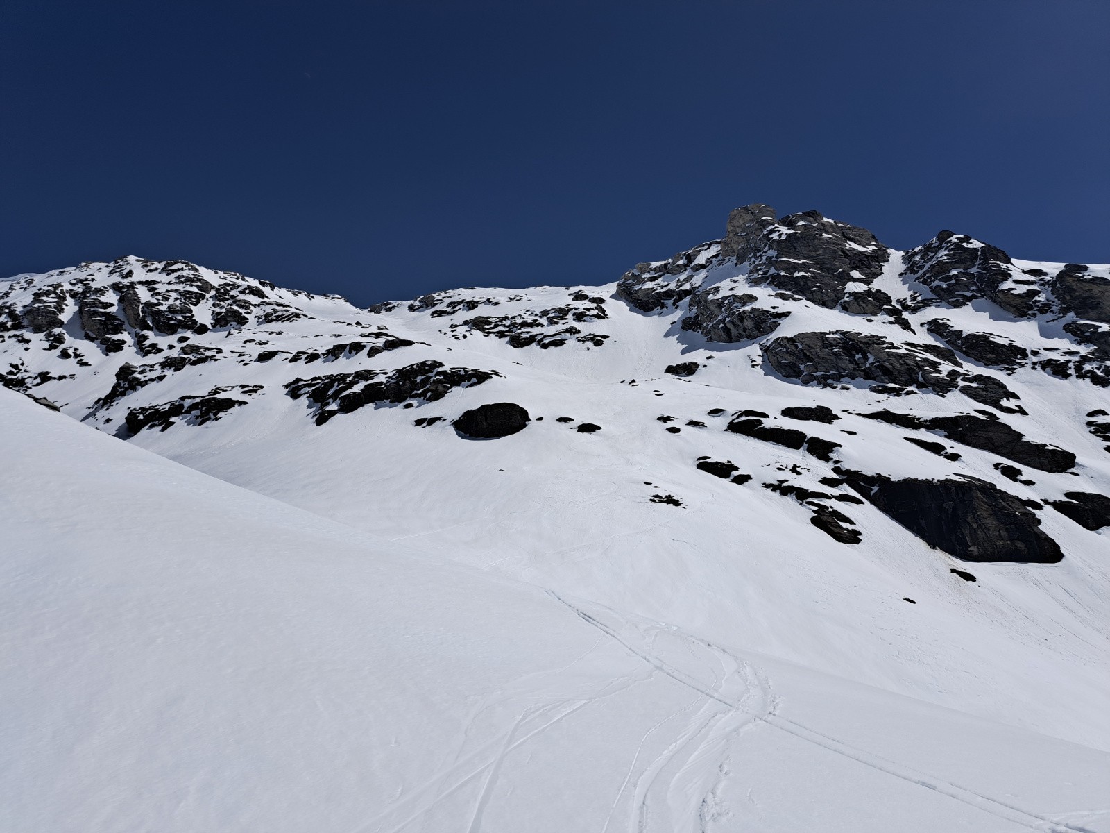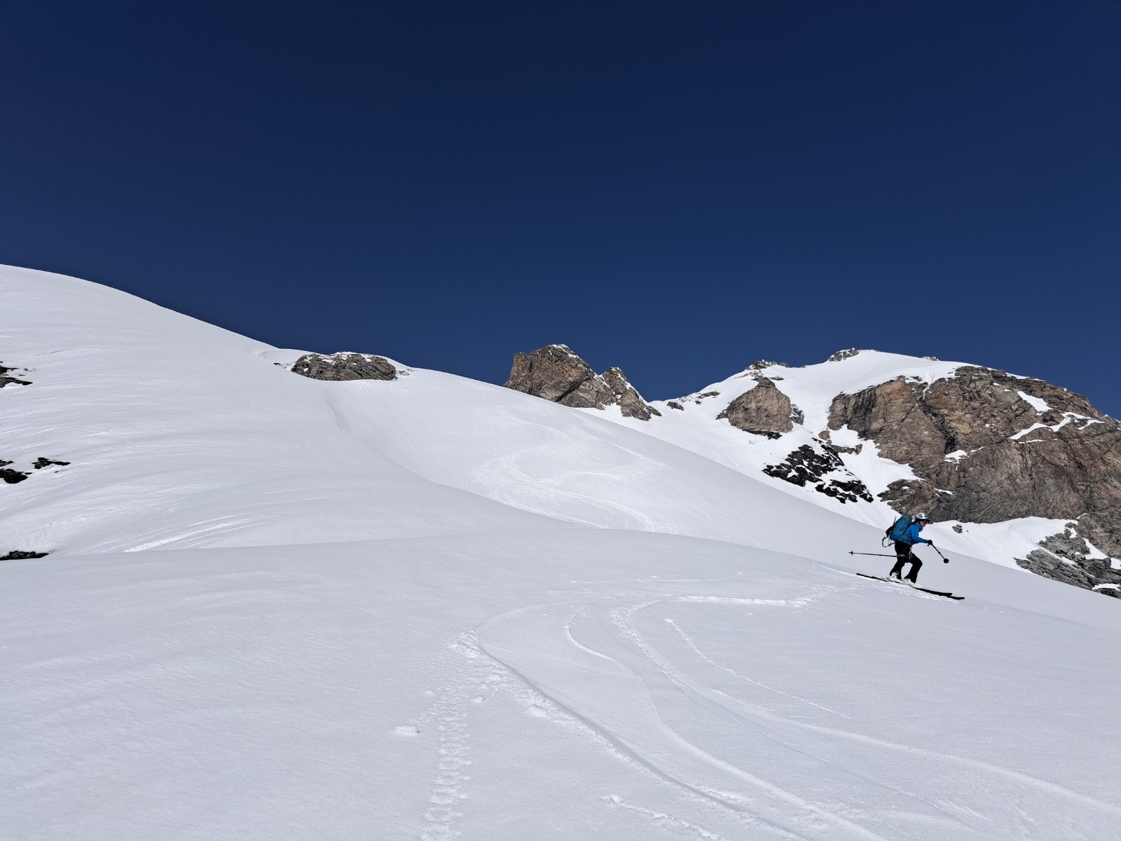 La Pointe Ferrand nous tendait les bras, et dans un excès de confiance, un ski a essayé de reprendre sa liberté, et s'est dirigé droit vers le lac d'Ambin... 😬 Heureusement, après une chute de barre rocheuse, il s'est planté 100m plus bas, et en un seul morceau...
