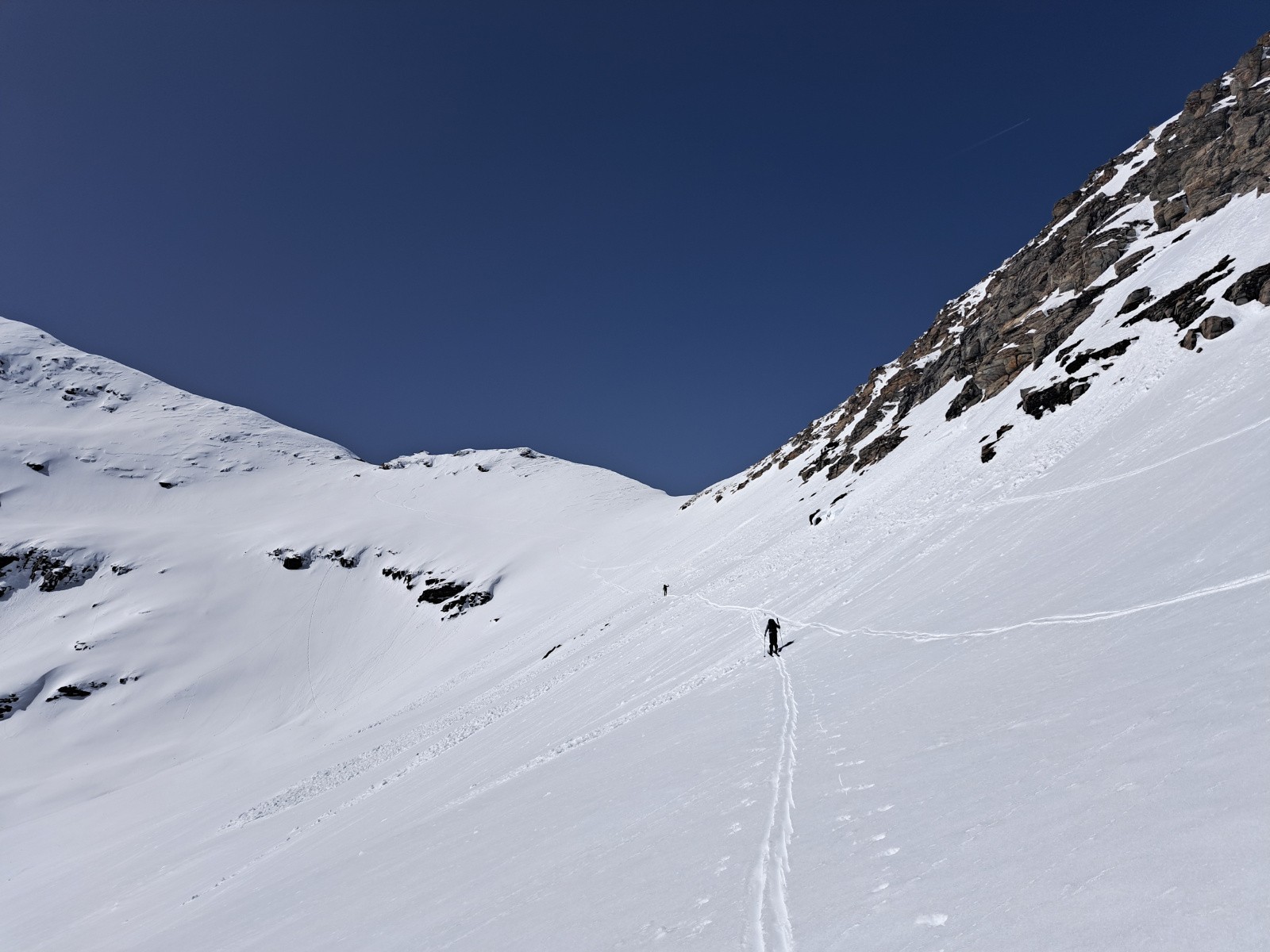 On enquille sous un soleil de plomb vers le col à gauche du col d'Ambin (3161m sur l'IGN), qui debouche directement au pied de la Pointe Ferrand. Merci Fred et Clément pour la trace 😃