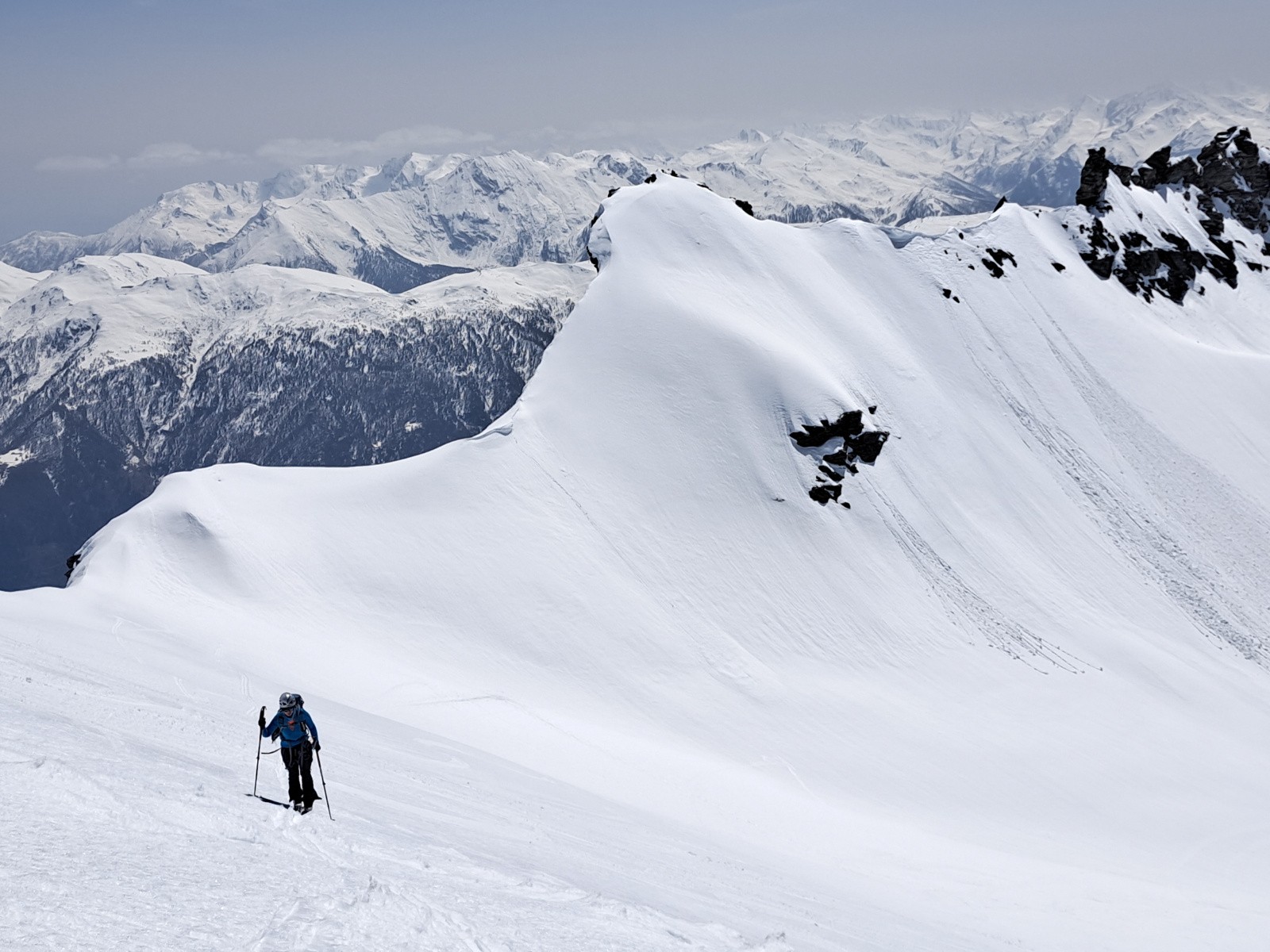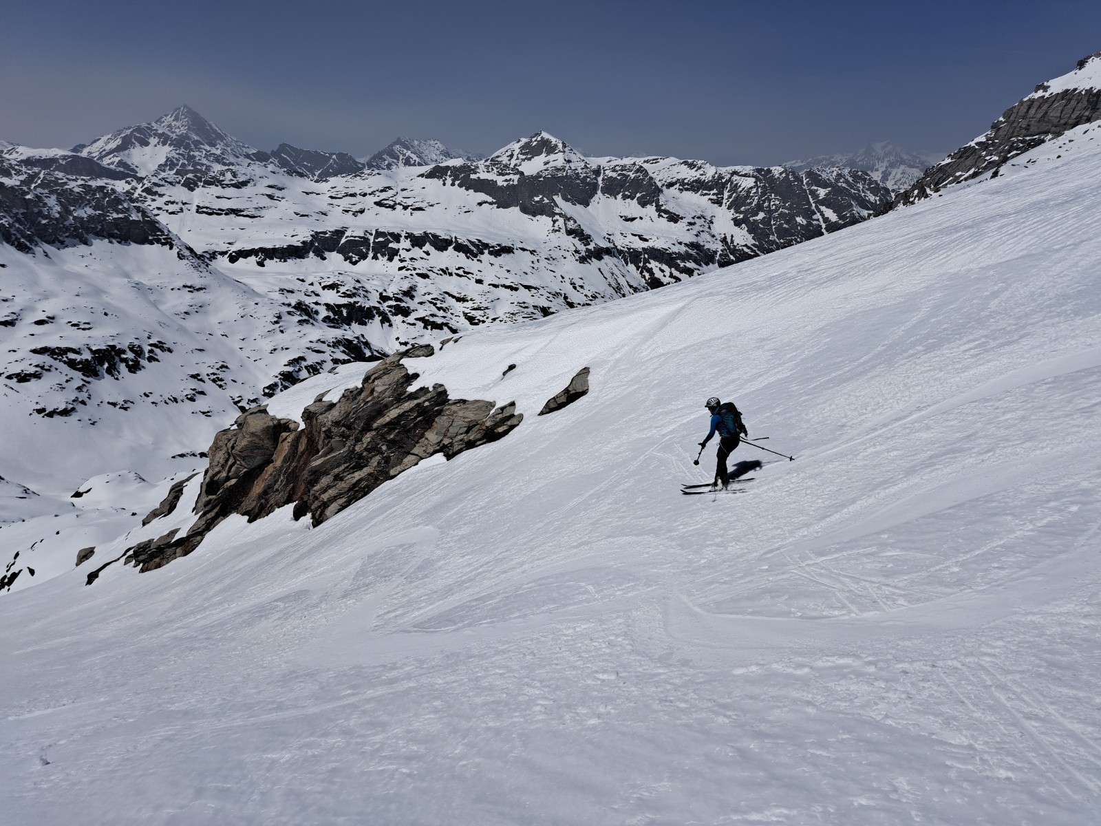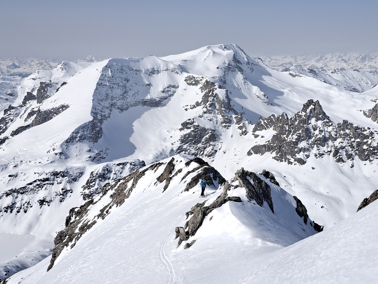 Après une petite heure de récupération de ski voyageur, on décide de faire quand même la pointe ferrand, et on repart pour nos derniers 300m de dénivelé. La descente reste topissime vers 13h45, avec une vue plongeante sur le lac d'Ambin...