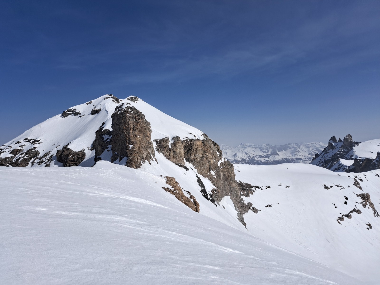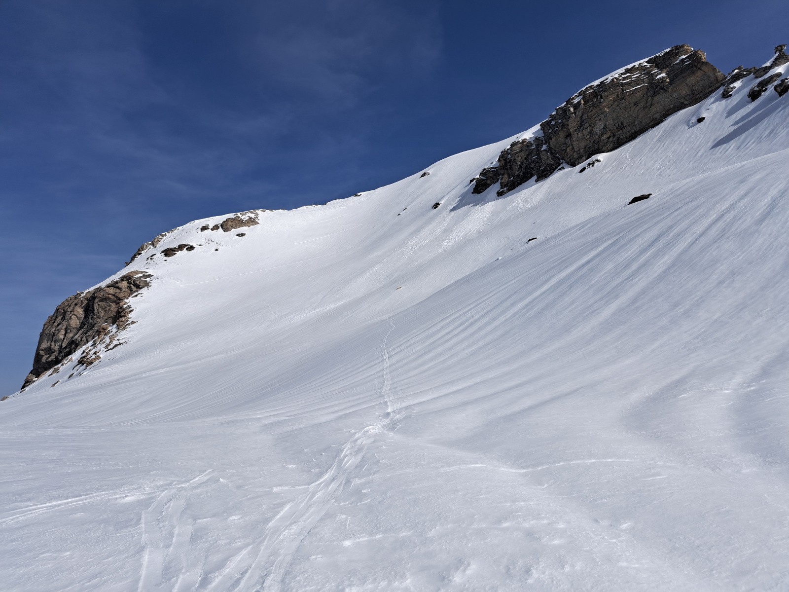 Conditions nivo et activité avalancheuse : de nombreuses coulées, parfois énormes, des jours précédents, à la fois départs de neige lourde et plaques (les couches fragiles persistantes du début de saison ?), toutes orientations. Le jour même, pas de départ vu / entendu. Quelques boulettes parties sous le soleil.