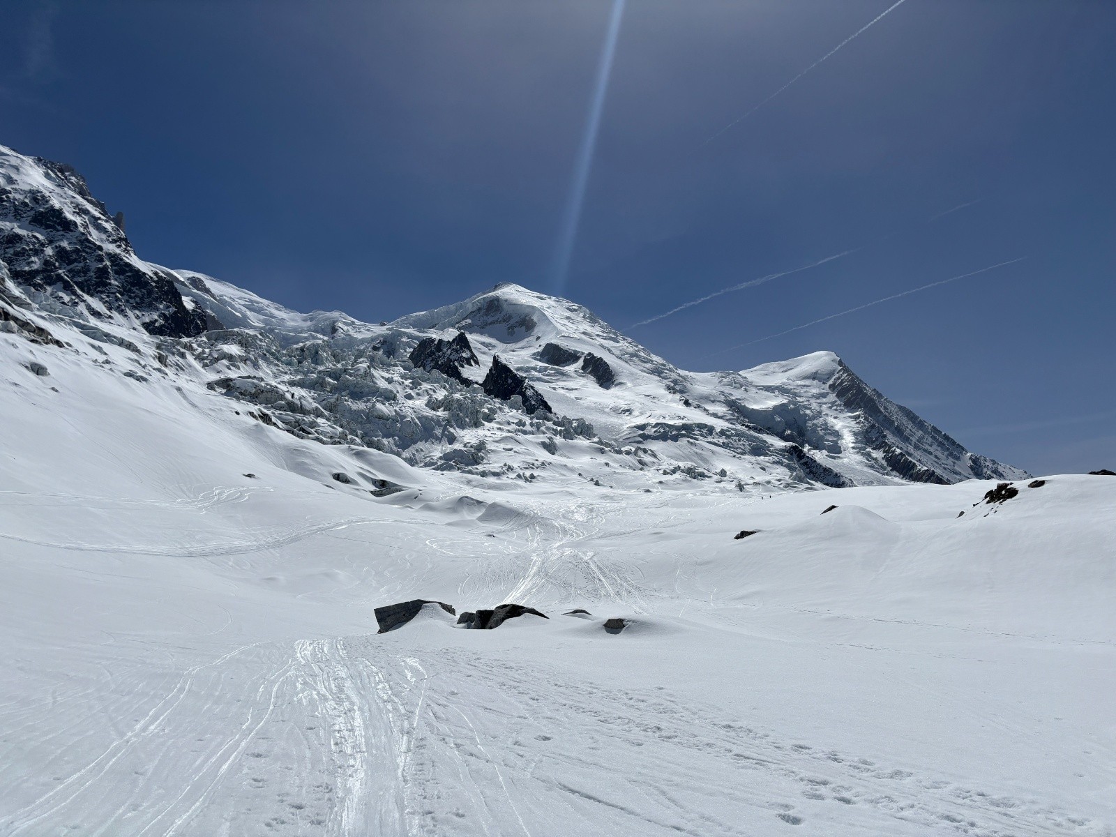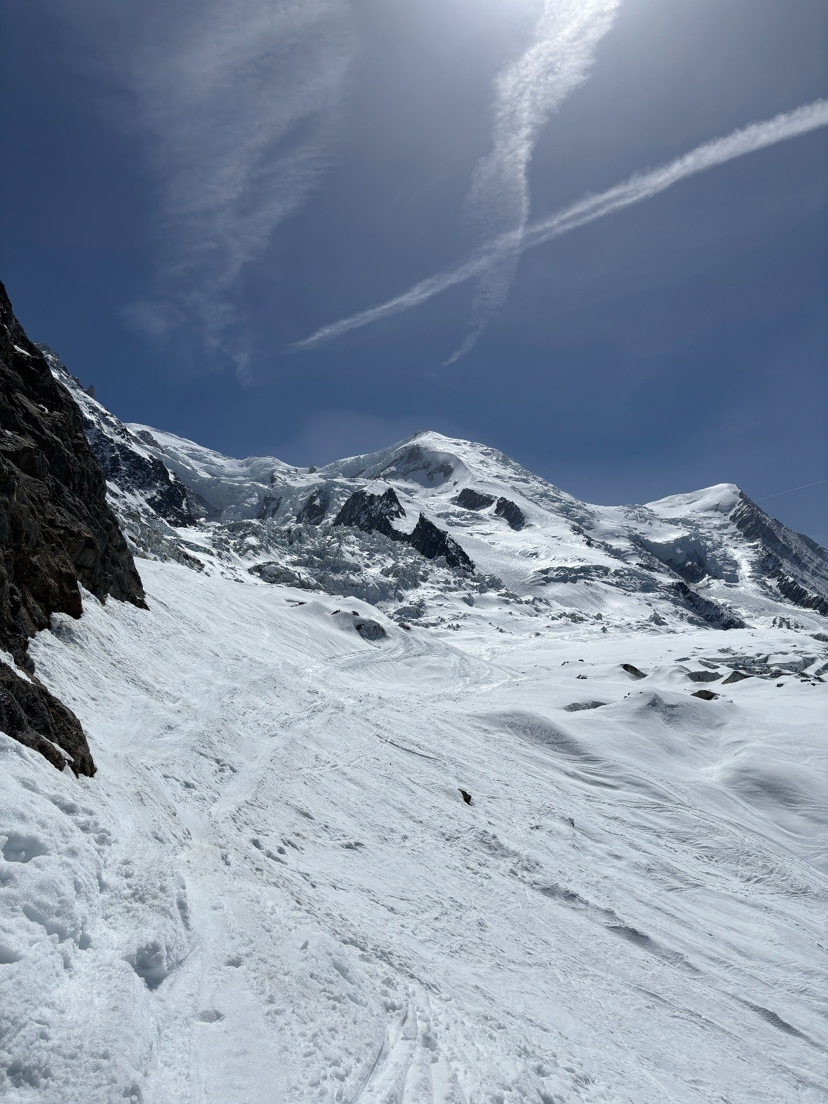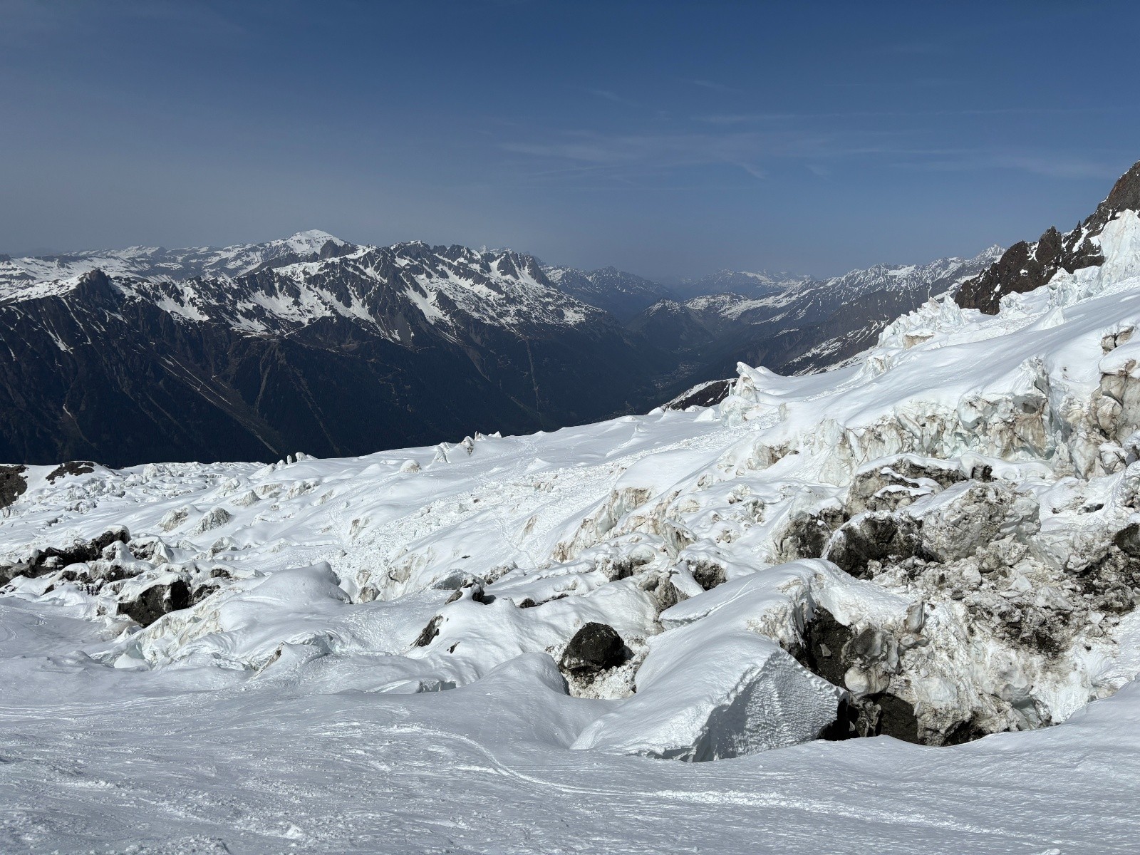 La montée nous a fait transpirer à fond, une vraie chaleur estivale avec plus de 26°C à Chamonix. Passés par la trace du haut sous l'Aiguille du Midi, qui oblige à redescendre un peu avant Plan Glacier mais quand même plus efficace que les passages déneigés de la trace du bas. La Jonction commence à poser problème, avec des grands pas à faire au dessus de ponts bien fragiles et de trous bien profonds.