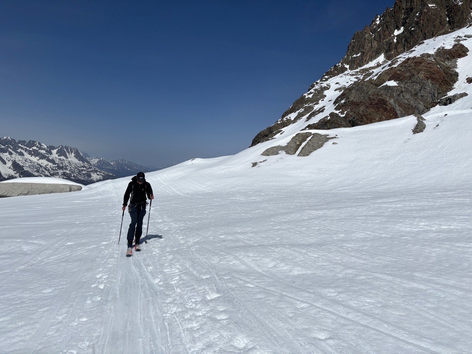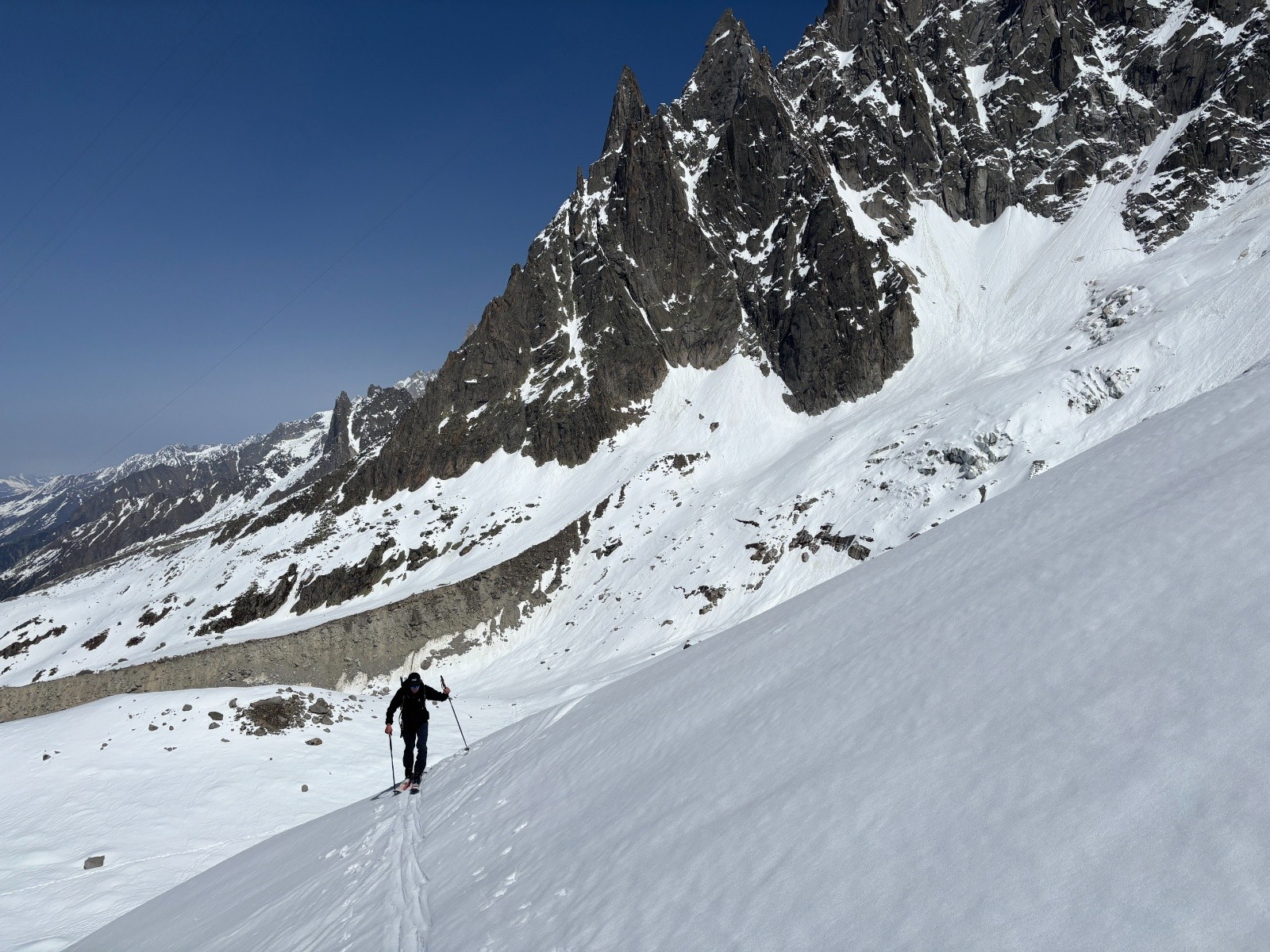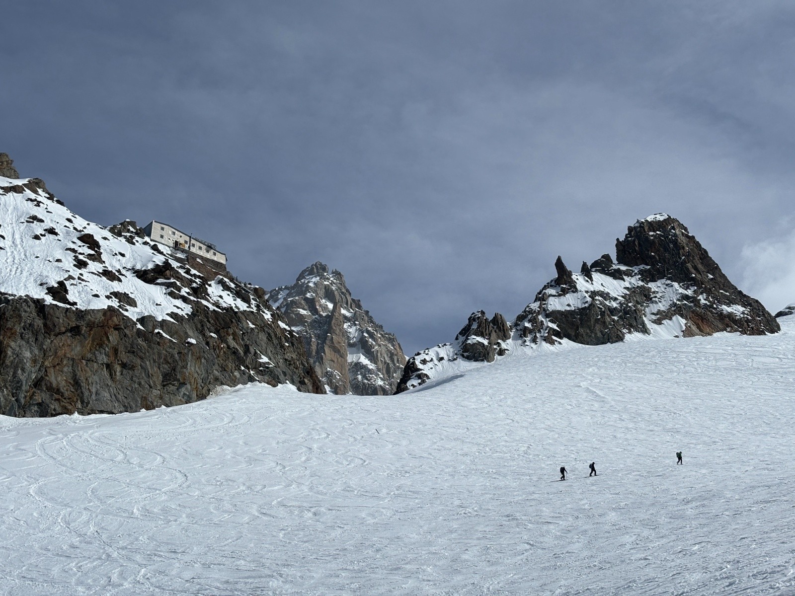 La montée nous a fait transpirer à fond, une vraie chaleur estivale avec plus de 26°C à Chamonix. Passés par la trace du haut sous l'Aiguille du Midi, qui oblige à redescendre un peu avant Plan Glacier mais quand même plus efficace que les passages déneigés de la trace du bas. La Jonction commence à poser problème, avec des grands pas à faire au dessus de ponts bien fragiles et de trous bien profonds.