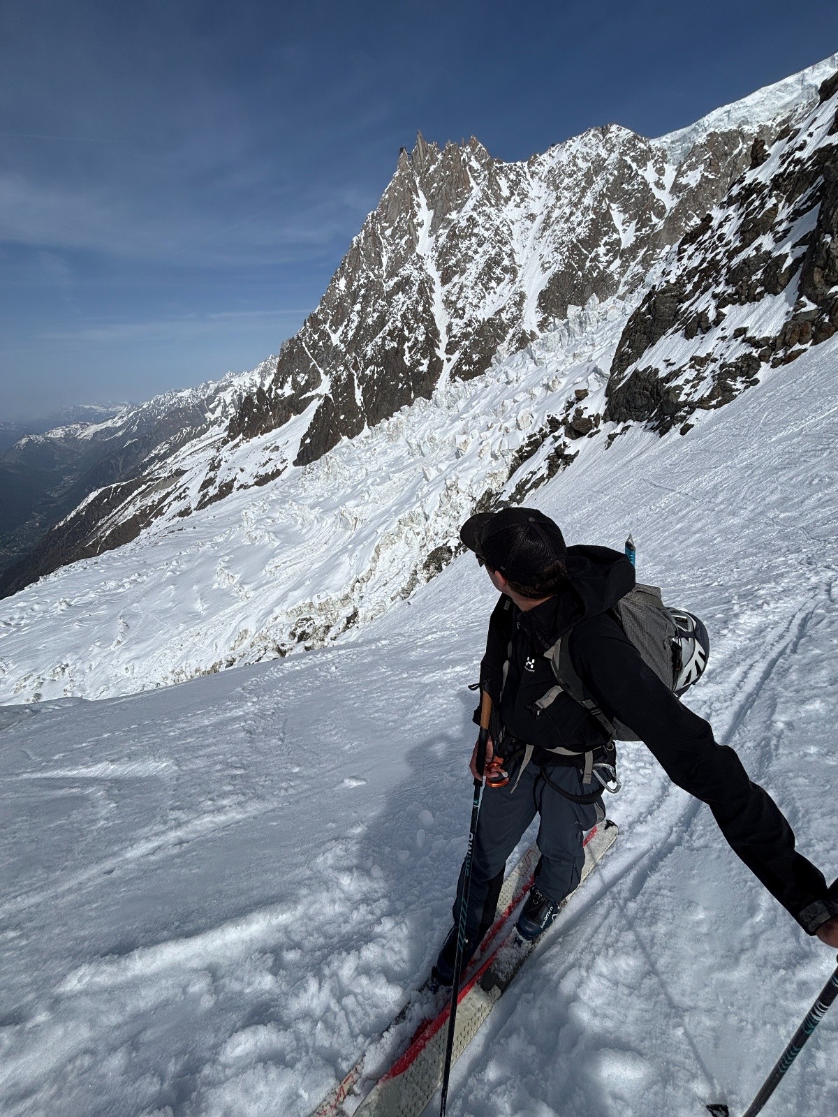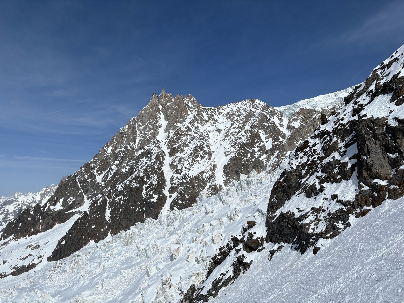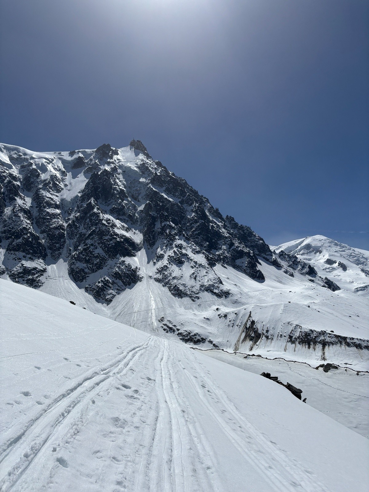 Conditions nivo et activité avalancheuse : coulées de surface sous la FN de l'Aiguille du Midi, qui rayent la trace.