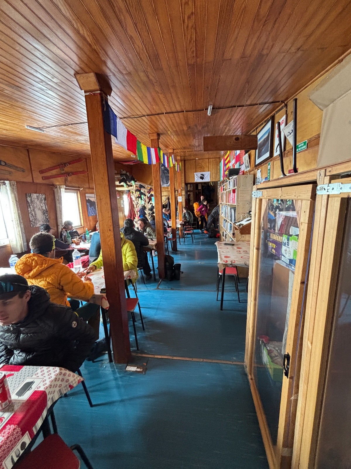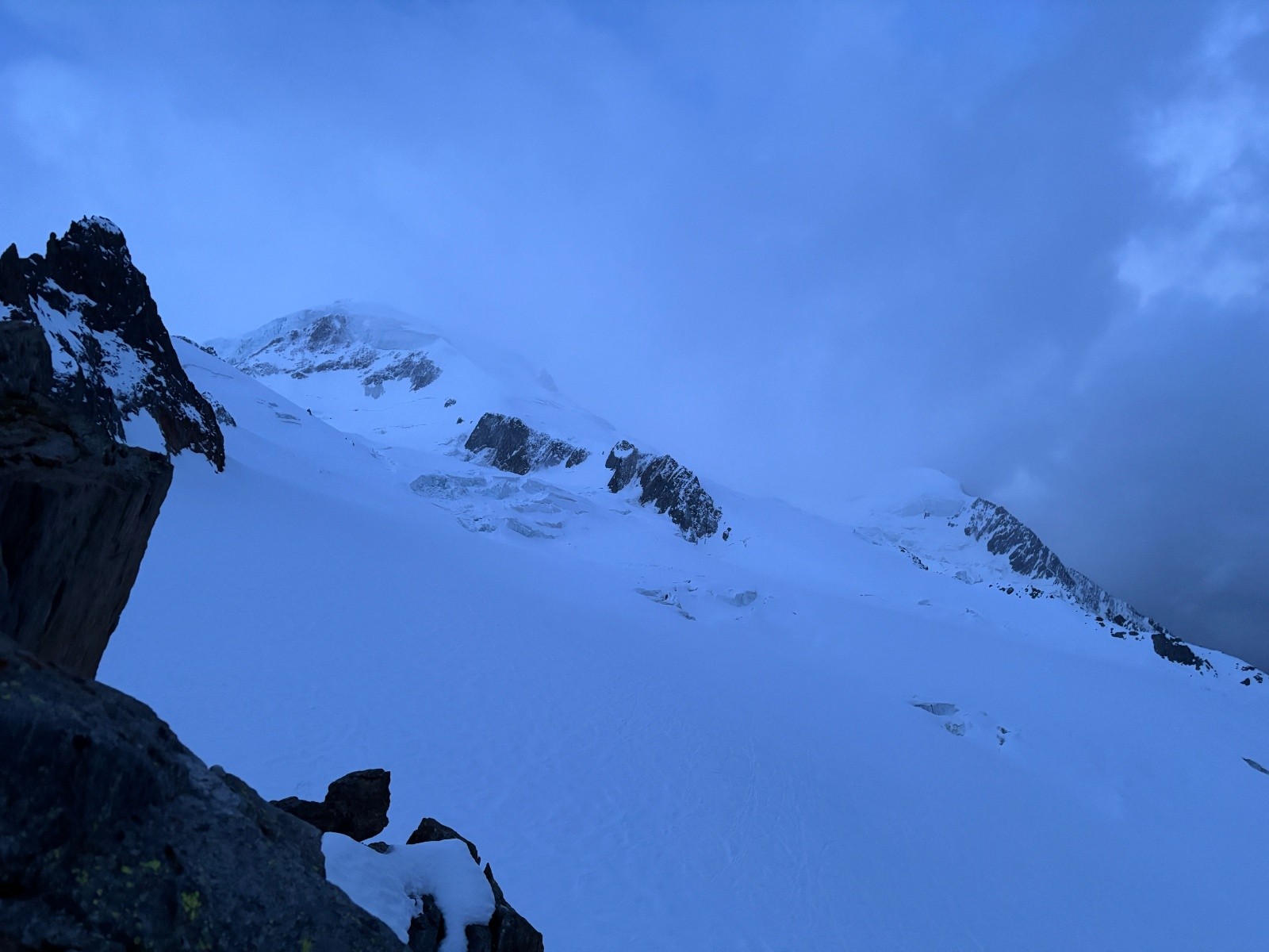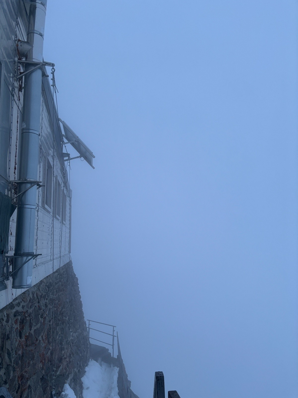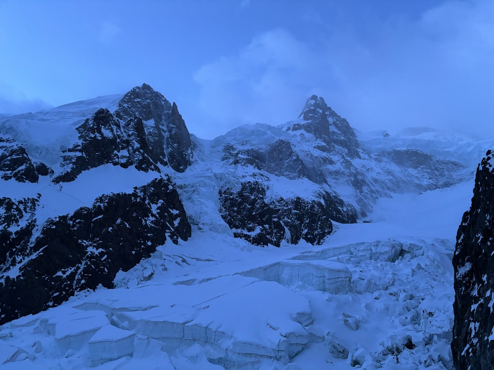 Super dîner au refuge, et une nuit plutôt correcte. Mais malheureusement, le réveil à 4h a confirmé nos inquiétudes: il neige, le ciel est bouché et ça souffle à remuer le refuge. Bon... on décide d'attendre un peu, au cas où. A 5h30 tout le monde se réveille, et le constat est partagé: aujourd'hui, il n'y aura pas de Mont Blanc!