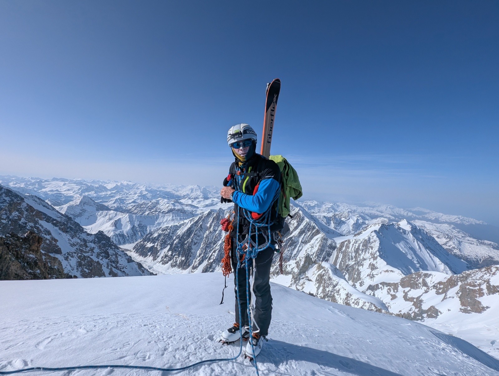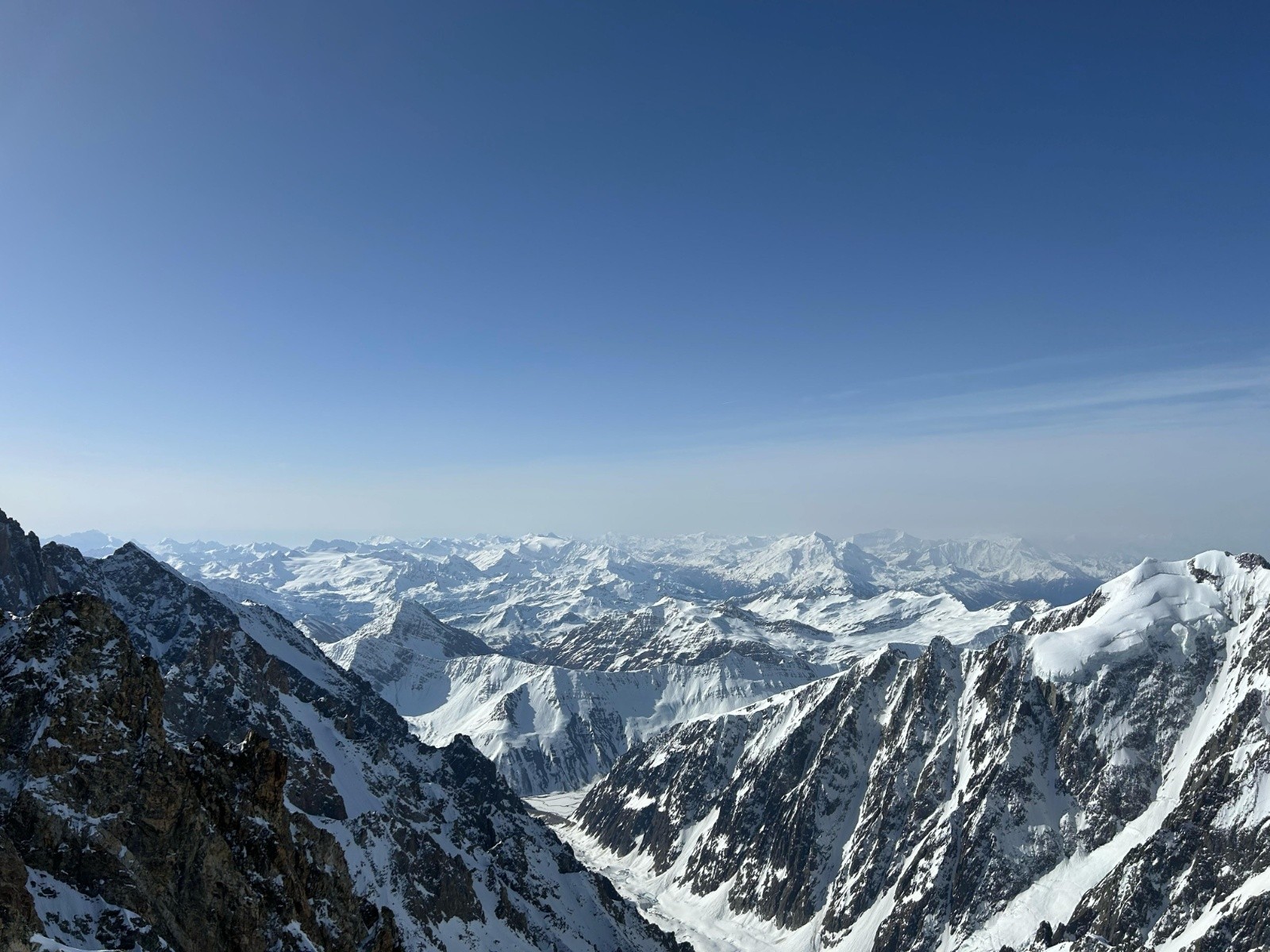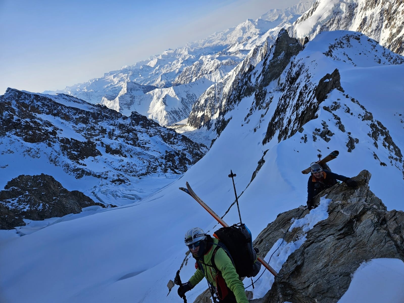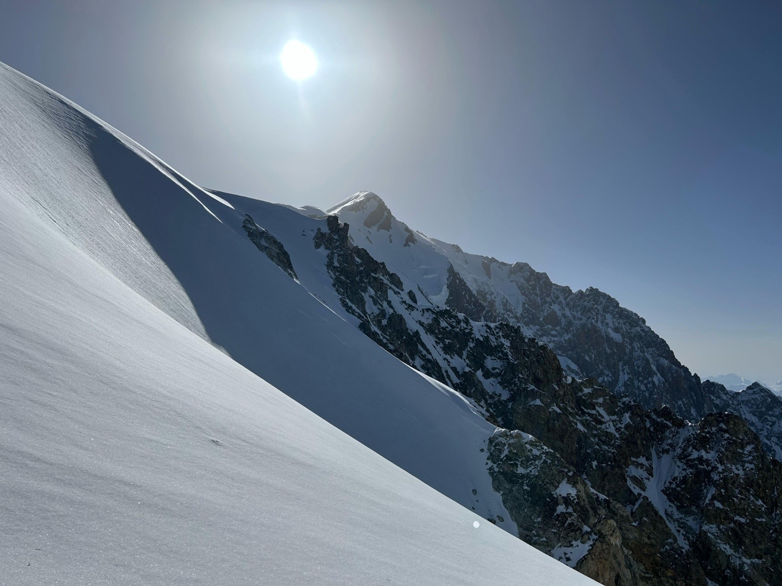 On remonte direction l'arrête des Aiguilles Grises. Cette dernière est plutôt grandiose, ses passages aériens larges de 50cm avec 200m de vide de part et d'autre sont spectaculaires. La neige dure en crampon me donne beaucoup plus de sérénité et me permet d'apprécier cette section bien que je reste lent. On avance tranquillement sur cette longue et belle arrête. Je commence a éprouver une sensation de légèreté, comme si le temps s'était arrêté dans un milieu féerique apaisant et transcendant qu'il m'est difficile de raconter par des mots. Est ce que cela vient du fait qu'on est seul au monde ? Du vide qui nous entour ? De l’attitude ? Des paysages majestueux ? Que Vivien est devenu silencieux ? Peut être une combinaison de toutes ces choses uniques et rares que la vie a à nous offrir. Heureusement une envie de faire caca pour Vivien viendra rétablir la normalité des choses.