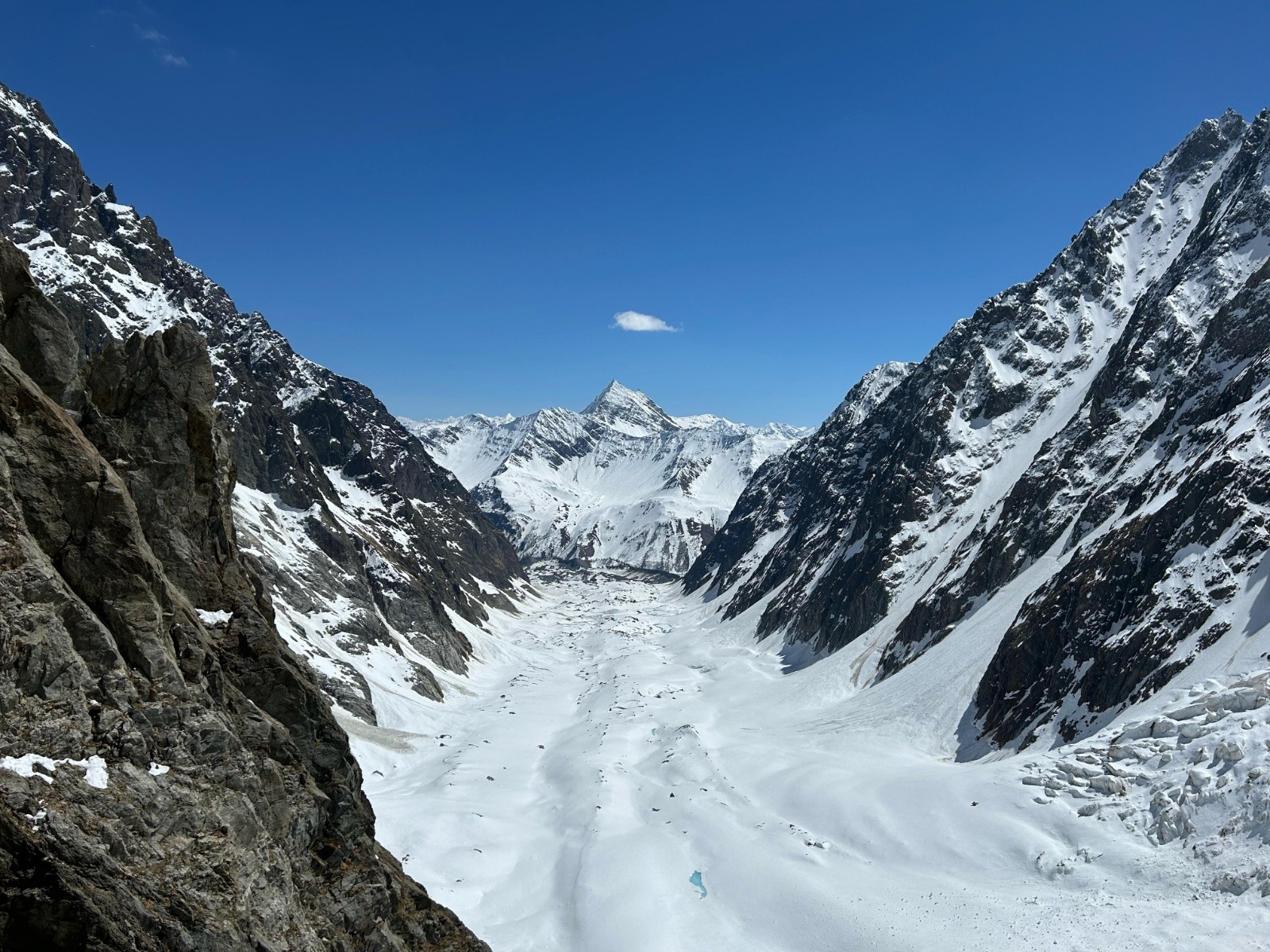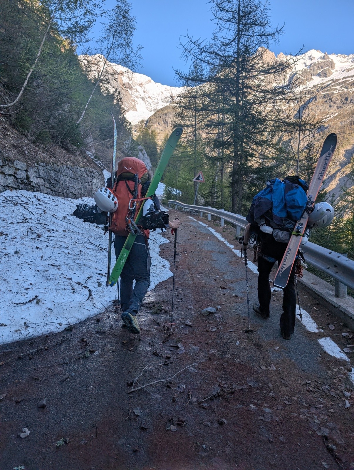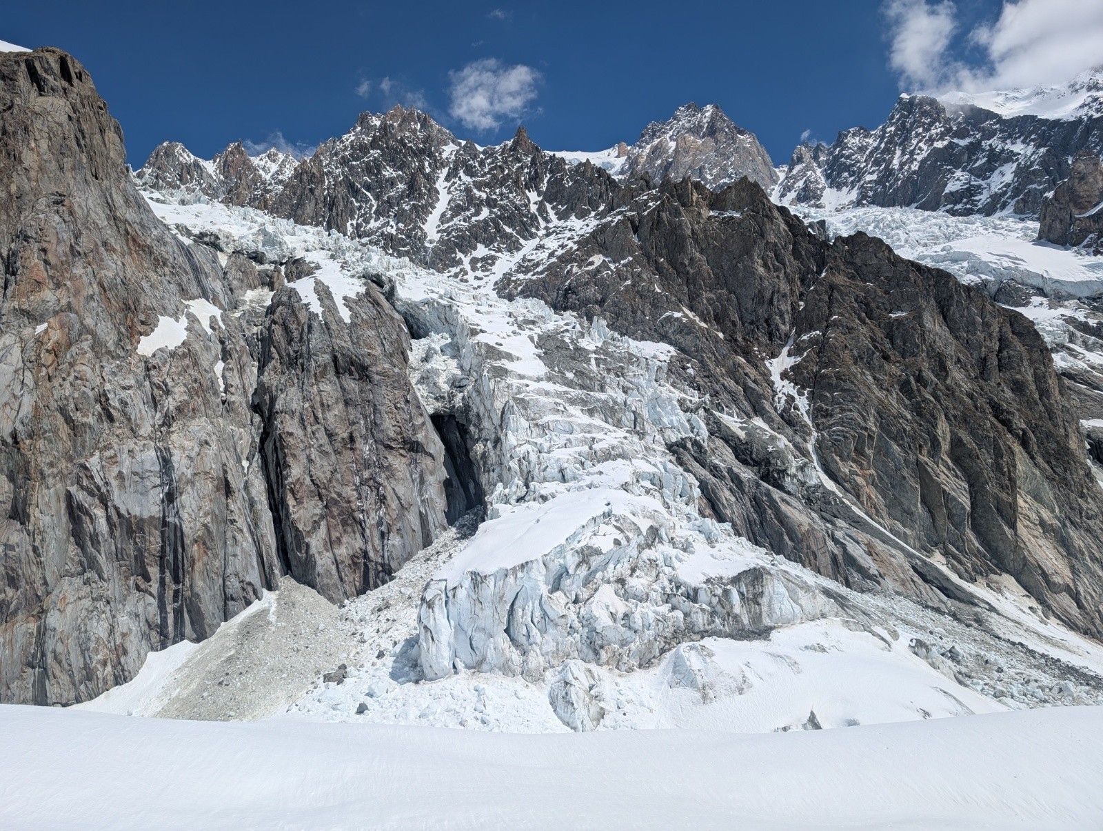 On s'équipe une deuxième fois. On rencontre une autre cordée sur la parking qui part pour une traversée jusqu'à Chamonix. Eux partent direct skis aux pieds, nous hésitons 2min, puis on se dit qu'on sera plus confort en baskets pour cette phase chaussage/déchaussage. On les déposeras après 1h de marche vers le refuge de Combal. On attaque la remonté du Glacier du Miage. Après une phase de plat, on bifurque à l'Est direction le refuge. Cette section se révélera plutôt très impressionnantes pour moi, je ne suis pas du tout à l'aise avec la remonté dans un mixte de neige molle et roches au dessus des grandes barres rocheuses. Je suis d'ailleurs surpris de ne pas vraiment le voir apparaitre dans les topos... Peut être dû au caractère plus inter saison ? En tout cas cela me tétanise, je suis lent et surtout je m'épuise beaucoup. A l'arrivée je suis lessivé, je n'ai plus la force de rien, je suis obligé de m'allonger pendant une heure avant de réussir à pouvoir faire quelque chose. Merci à Vivien et Léo qui se sont direct attelés à tout préparer.