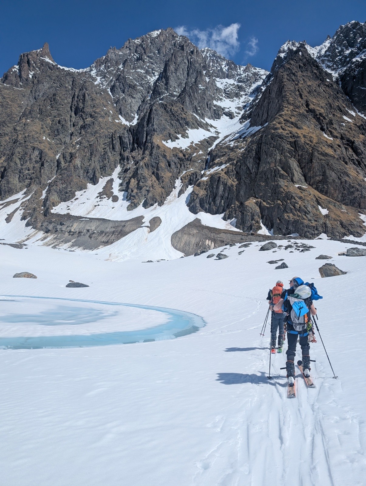 On arrive à la jonction, au Sud car il semblerait que c'est là où ca passait le mieux. A notre arrivé, un des ponts de neige est légèrement effondré. Je pense qu'on sera beaucoup à se souvenir de la sensation d'avoir l'avant du ski qui touche un bord et l'arrière un autre et les pieds au dessus du vide!