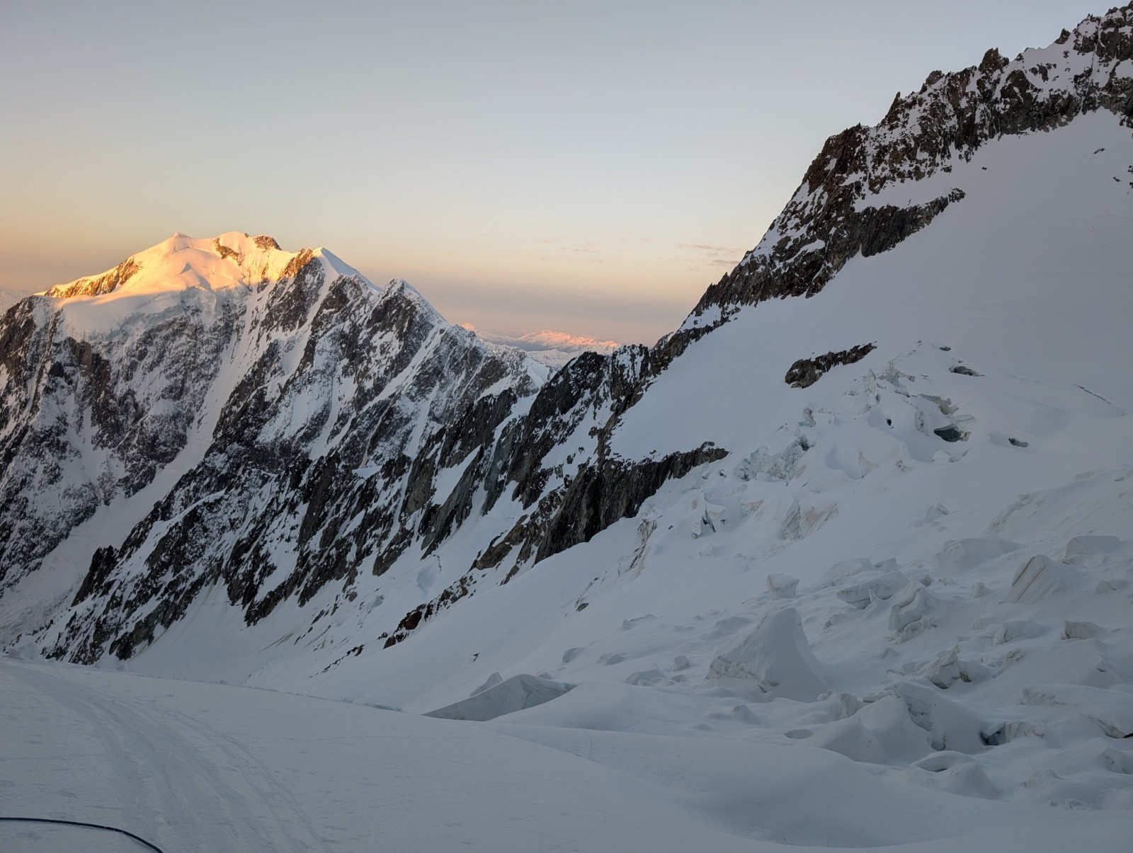 Réveil 2h en même temps que l'autre groupe, on décolle vers 3h20 après avoir tenté de manger, mais à cet heure là, pas évident d'avaler quelque chose! Le chemin qui part du refuge est à nouveau plutôt exposé, mais Yannick a tracé des supers marches la veille alors la traversée jusqu'au glacier se fait sans encombre. On touche le glacier qu'on remonte tranquillement en naviguant pour éviter les gigantesques crevasses. C'est impressionnant, toute cette glace de la taille d'immeubles disposée de manière anarchique. Cela fascine autant que ça fait froid dans le dos. Mention spécial au petit pont de neige au dessus d'une crevasse où le fond était difficilement décelable.