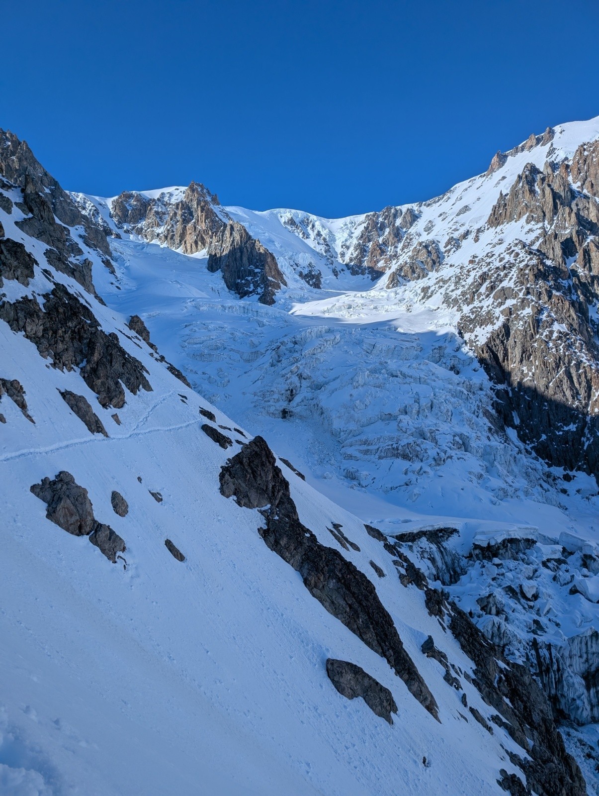 Le changement d'atmosphère avec le coté italien est frappant, on est passé d'une solitude extrême à une piste noire à bosses. Les cuisses chauffent et brulent, la neige est encore dure jusqu'aux Grands Mulets ce qui les achèves.