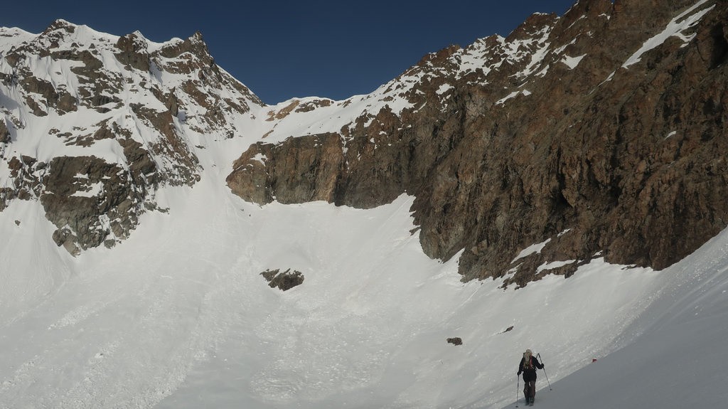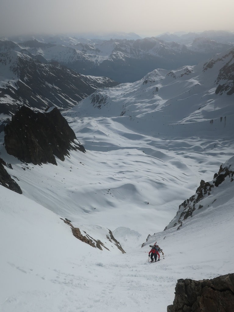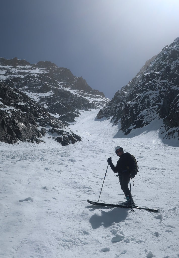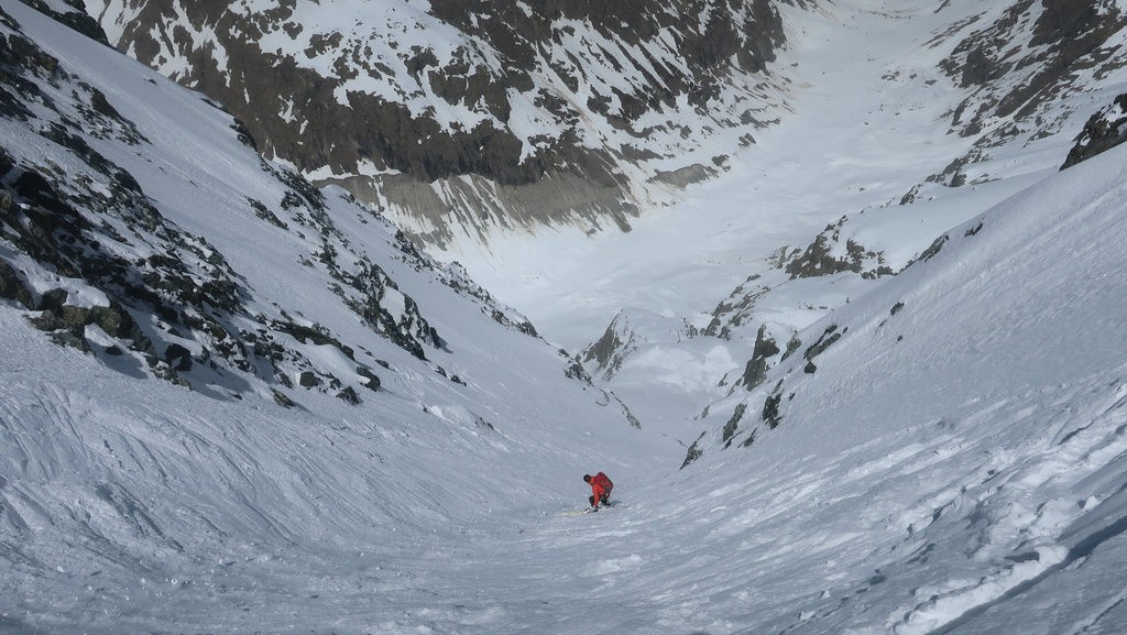 Conditions pour le ski : bonne neige encore froide sur fond dur dans le couloir