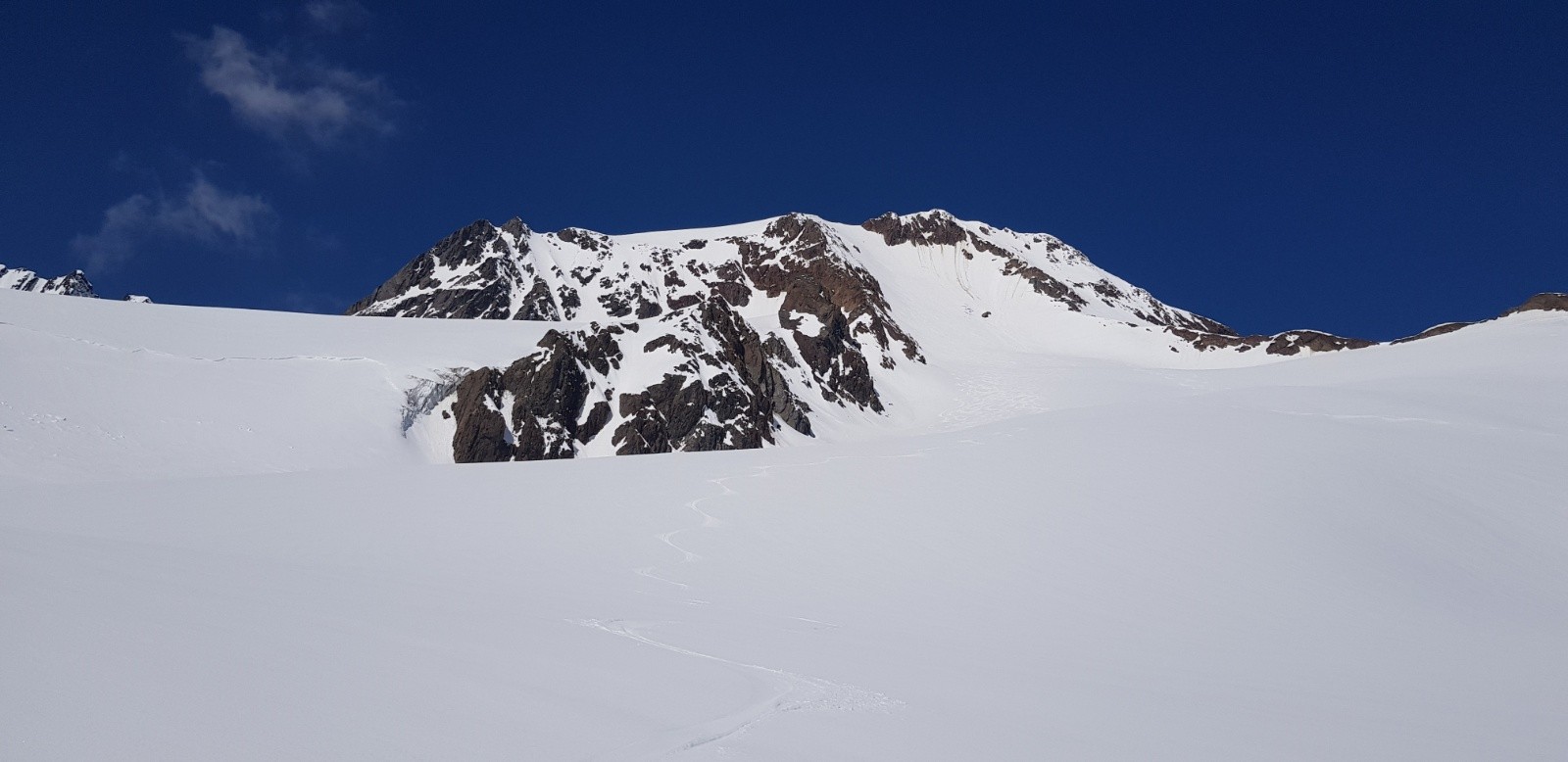 Refuge hiver avec 4 autres personnes qui ont bien chauffé la pièce. Lever 5h, départ 5h30 pour une longue approche jusqu'au glacier (1h20 portage pour pas beaucoup de déniv). Puis ca déroule, c'est long, ca chauffe. on remet la veste à 3500m pour finir.
